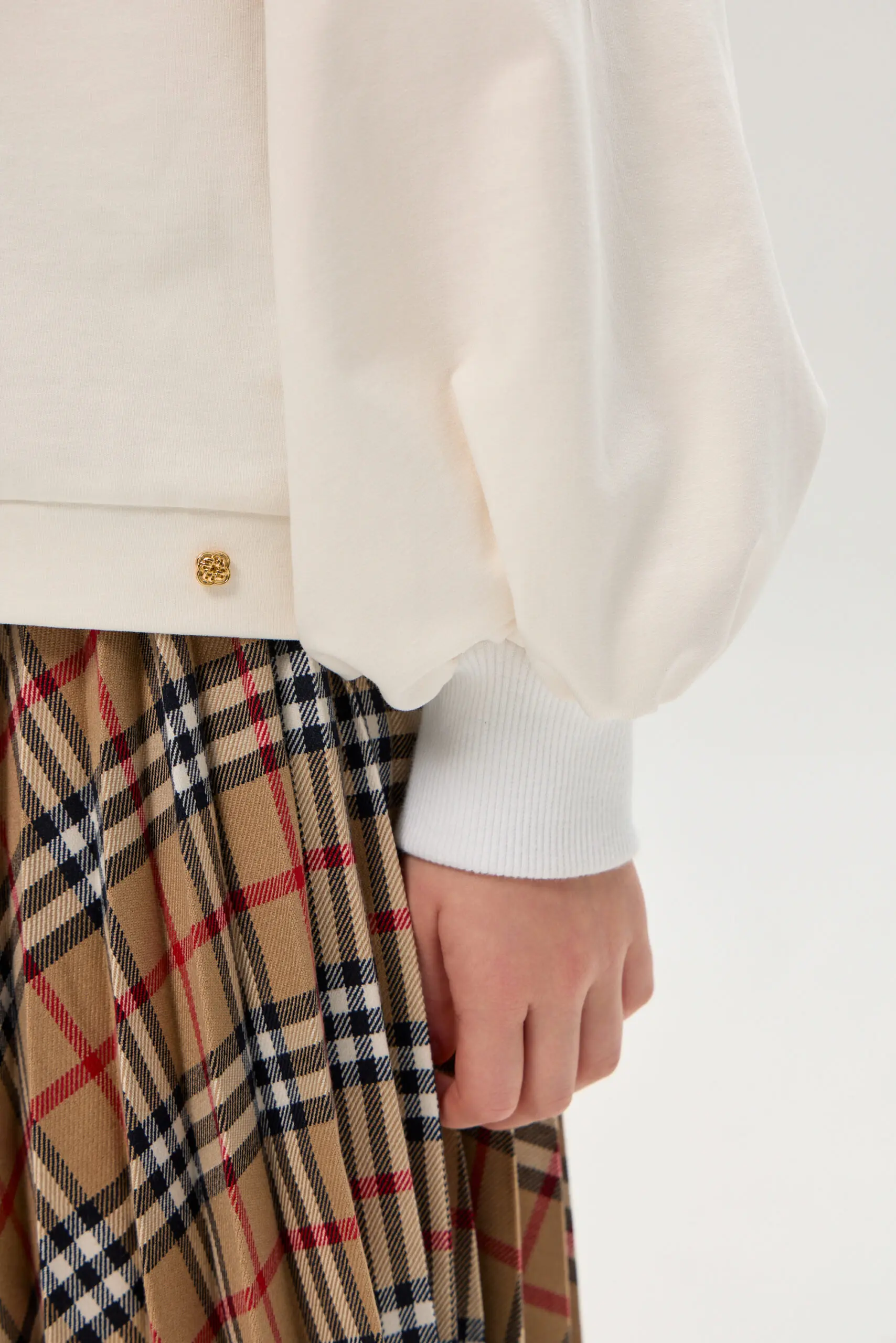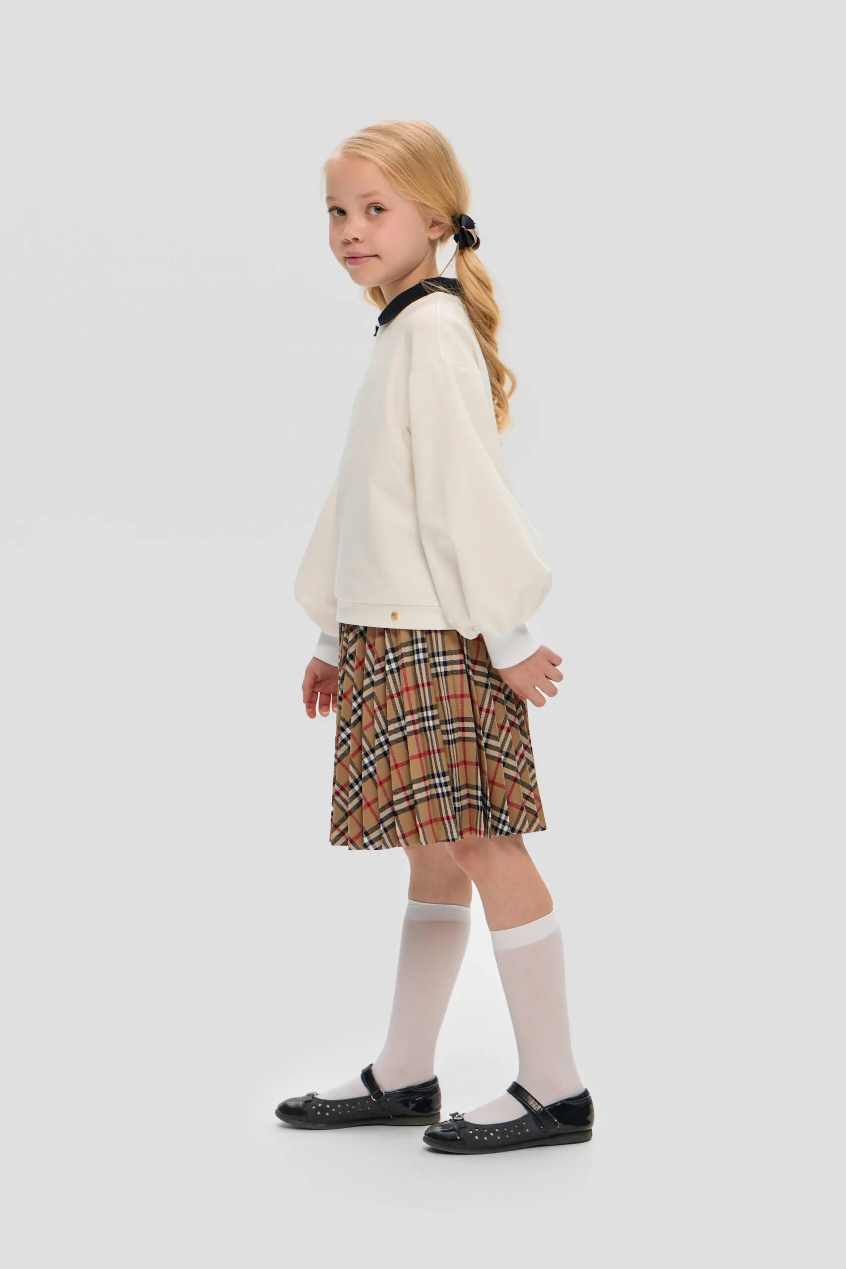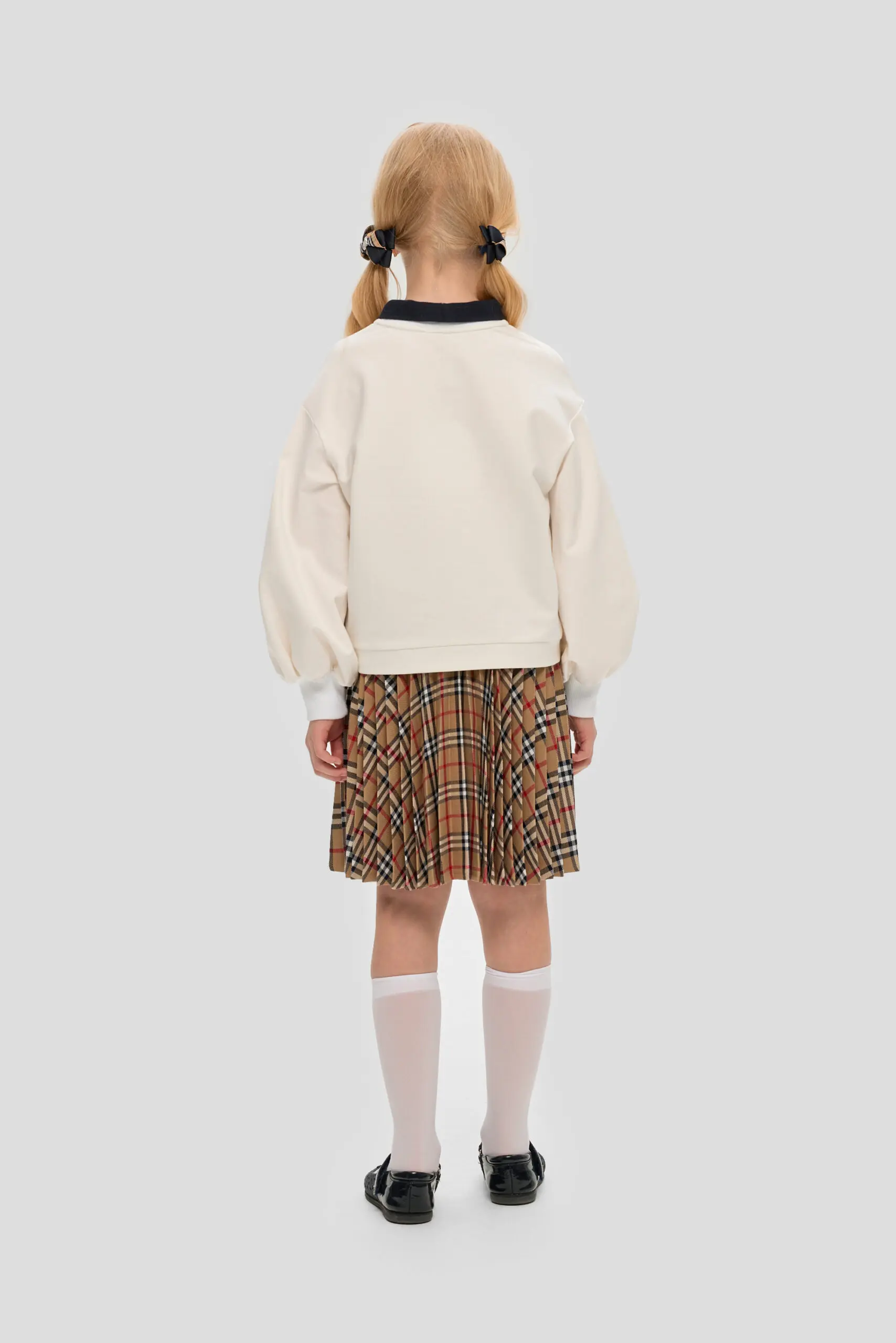 Стильный джемпер для девочки – незаменимый элемент школьной одежды. Модный силуэт свитшота дополненный круглым вырезом горловины с аккуратной отделкой, создает современный образ. Длинные рукава и нижний ... край джемпера снабжены широкими эластичными резинками. Завершает дизайн контрастный, съемный воротник. Этот джемпер идеально комбинируется с юбками и брюками разных стилей.