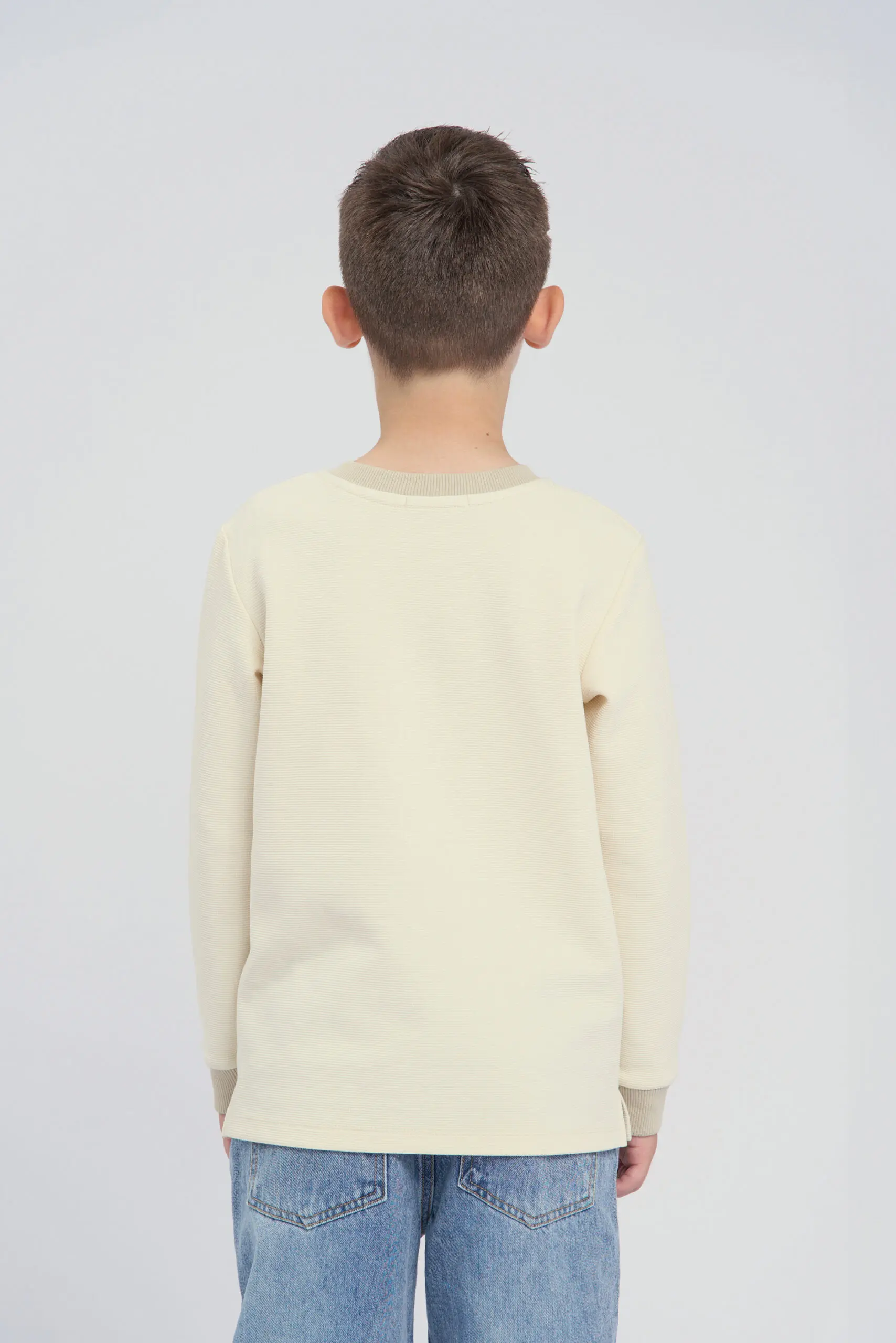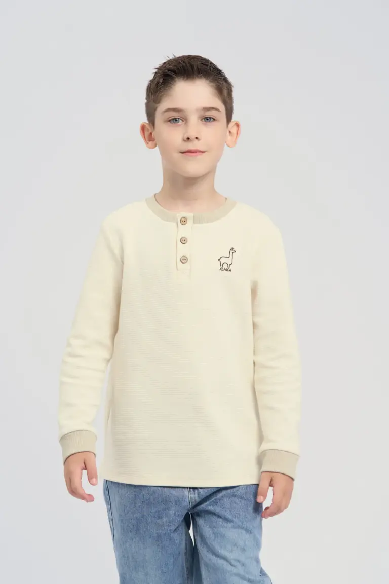 Лонгслив с длинными рукавами для мальчика украшен вышивкой с изображением альпаки. Удобный свободный крой и продуманная длина позволяют легко комбинировать лонгслив с различными элементами гардероба. Классический ... круглый вырез оформлен застежкой на три пуговицы. Длинные рукава с эластичными манжетами добавляют уют и защищают от холода в прохладную погоду. Модель трендового сливочного цвета выполнена из мягкого и приятного на ощупь материала на основе хлопка, что обеспечивает комфорт в носке. Особый акцент сделан на текстуре ткани, которая придает изделию уникальность и стильный вид.