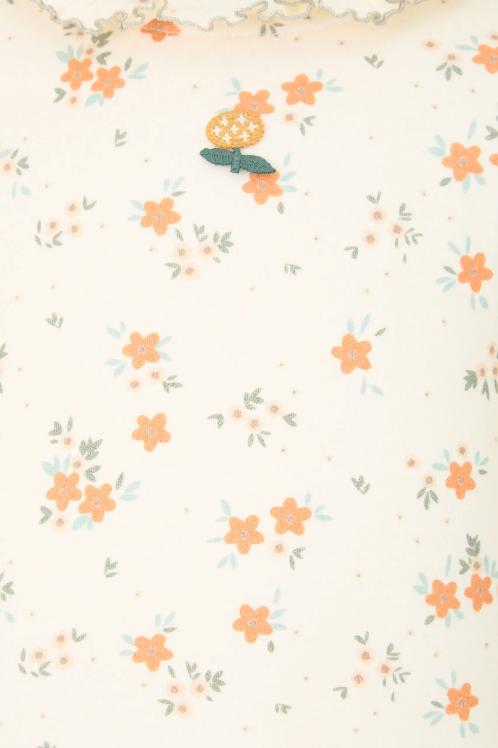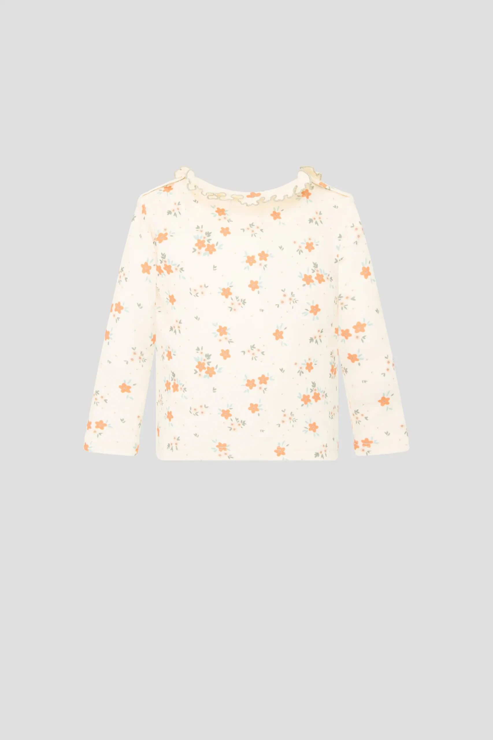 Лонгслив из натурального хлопка цвета экрю, украшенный цветочным рисунком, станет гармоничным дополнением гардероба малышки. Модель с круглым вырезом горловины, который оформлен кокетливым рюшем. Цветочная аппликация под ... вырезом стала дополнительным украшением дизайна. Свободный прямой силуэт обеспечивает комфортное прилегание одежды к телу ребенка, что важно для спокойствия малышки. Материал из натурального хлопка эффективно пропускает воздух, позволяя телу дышать и избегать перегрева.