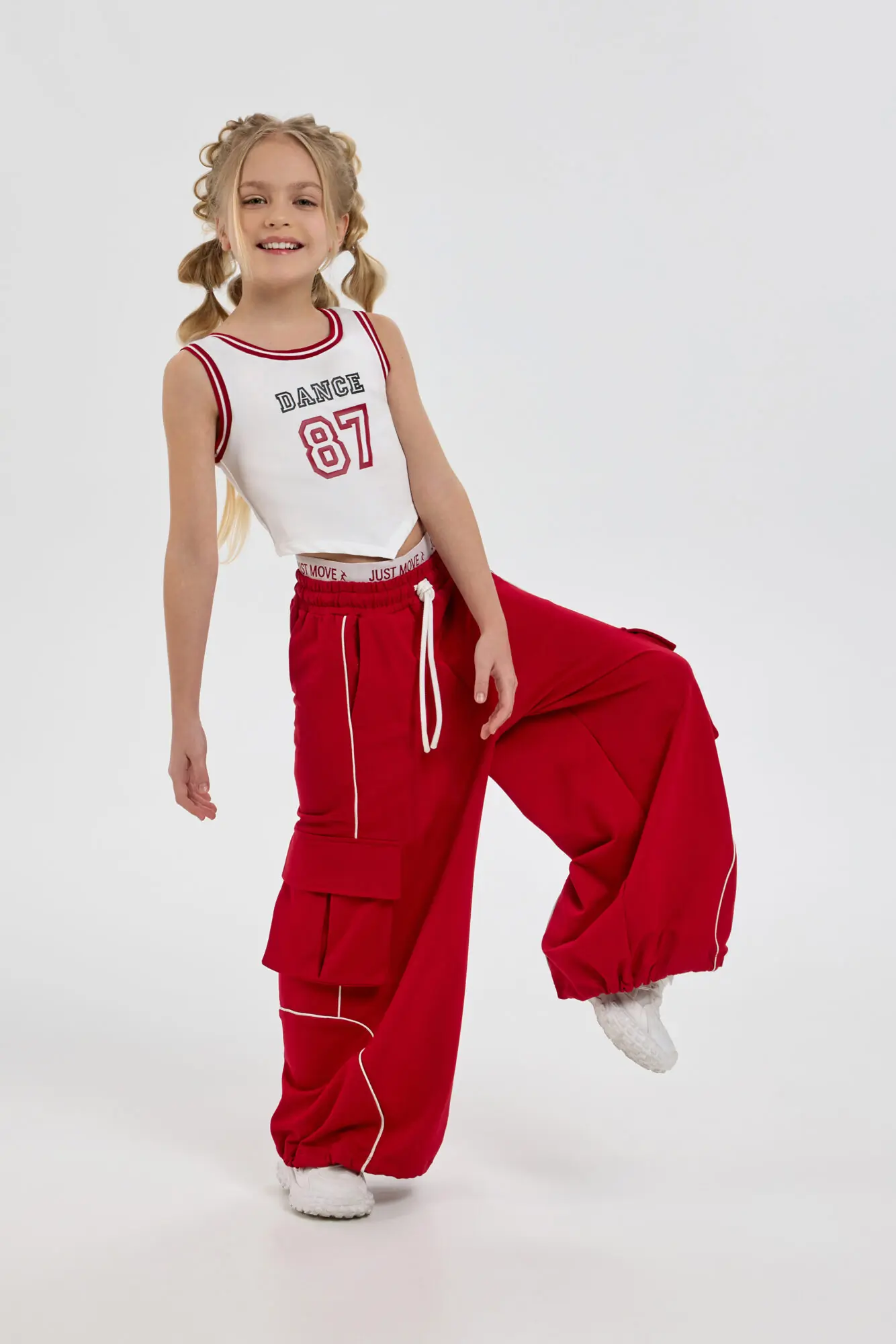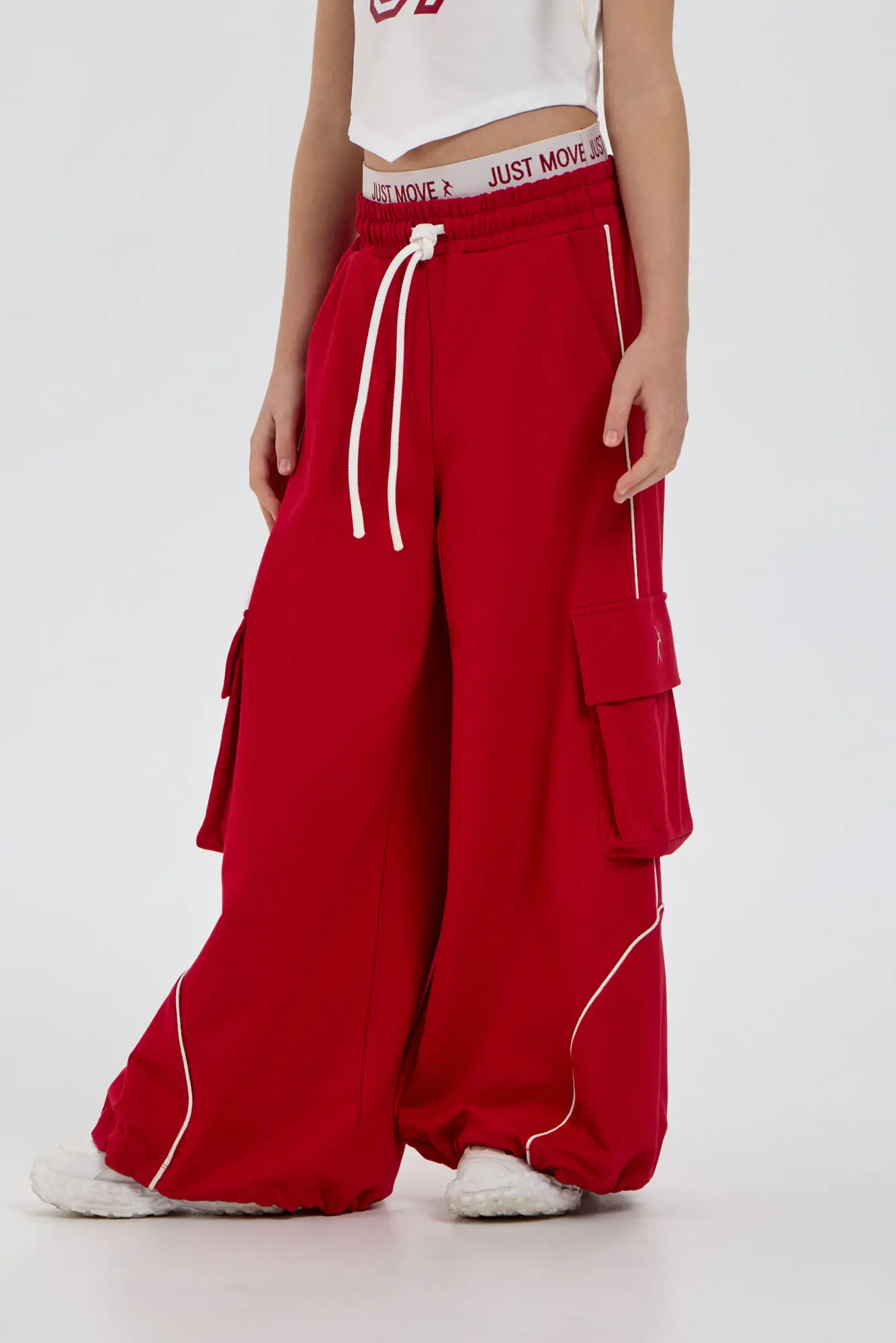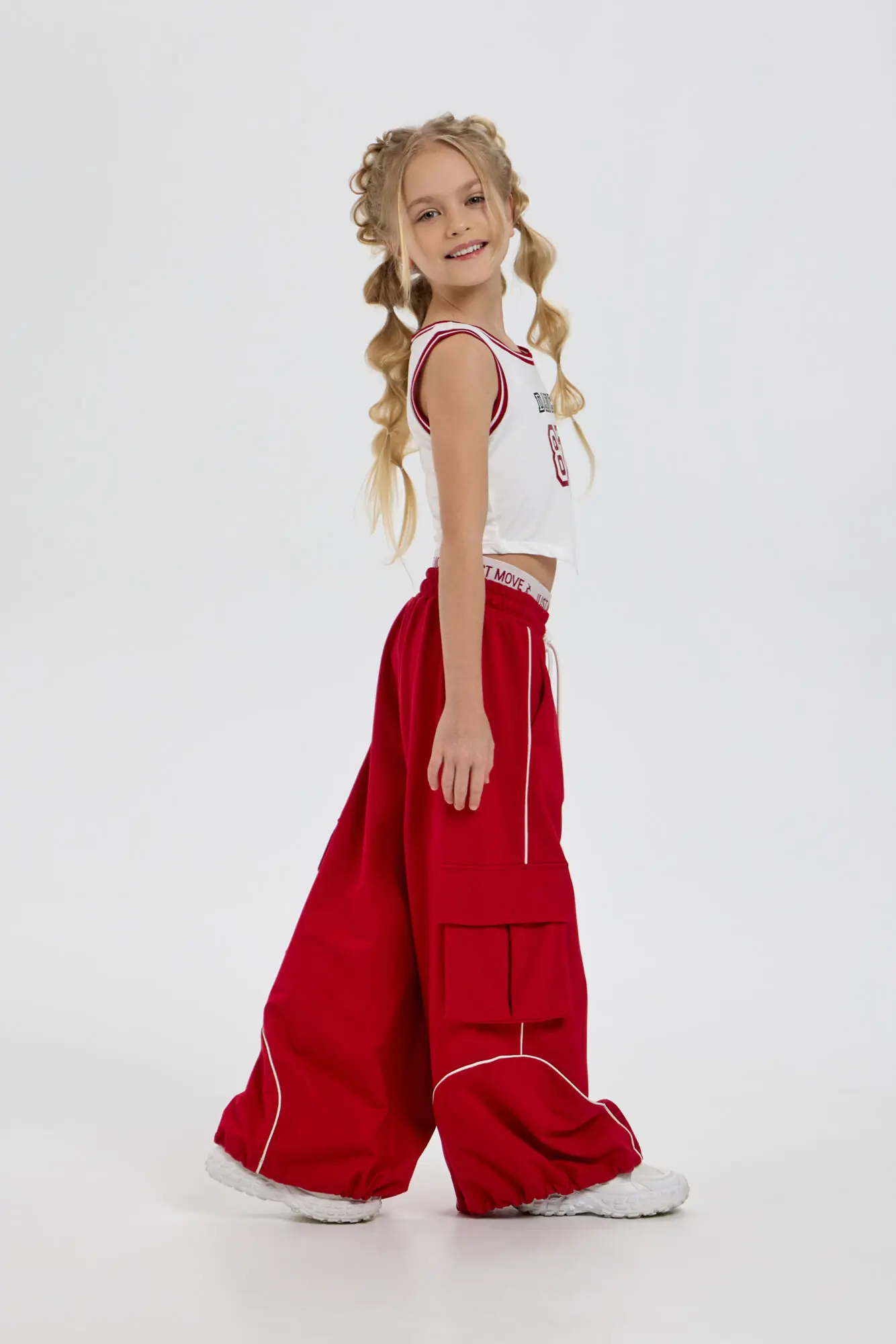 Спортивные джогеры из коллекции TODES х Choupette, созданные для уверенных в себе девочек с ярким стилем. Брюки свободного кроя дополнены накладными карманами по бокам стиле карго ... и манжетами внизу, что формирует современный городской образ. Светоотражающие канты по низу брючин подчеркивают динамику движения. Отлично подходят для занятий street dance, выступлений на сцене и активных тренировок, объединяя практичность и запоминающийся дизайн. Также станут отличным выбором для повседневной носки в стилистике стрит и хип-хоп. Насыщенный красный цвет модели сразу привлекает взгляд во время перформанса, выступая ярким акцентом в танцевальных баттлах. Эти брюки прекрасно комбинируются с белыми и чёрными топами из этой же капсульной коллекции.