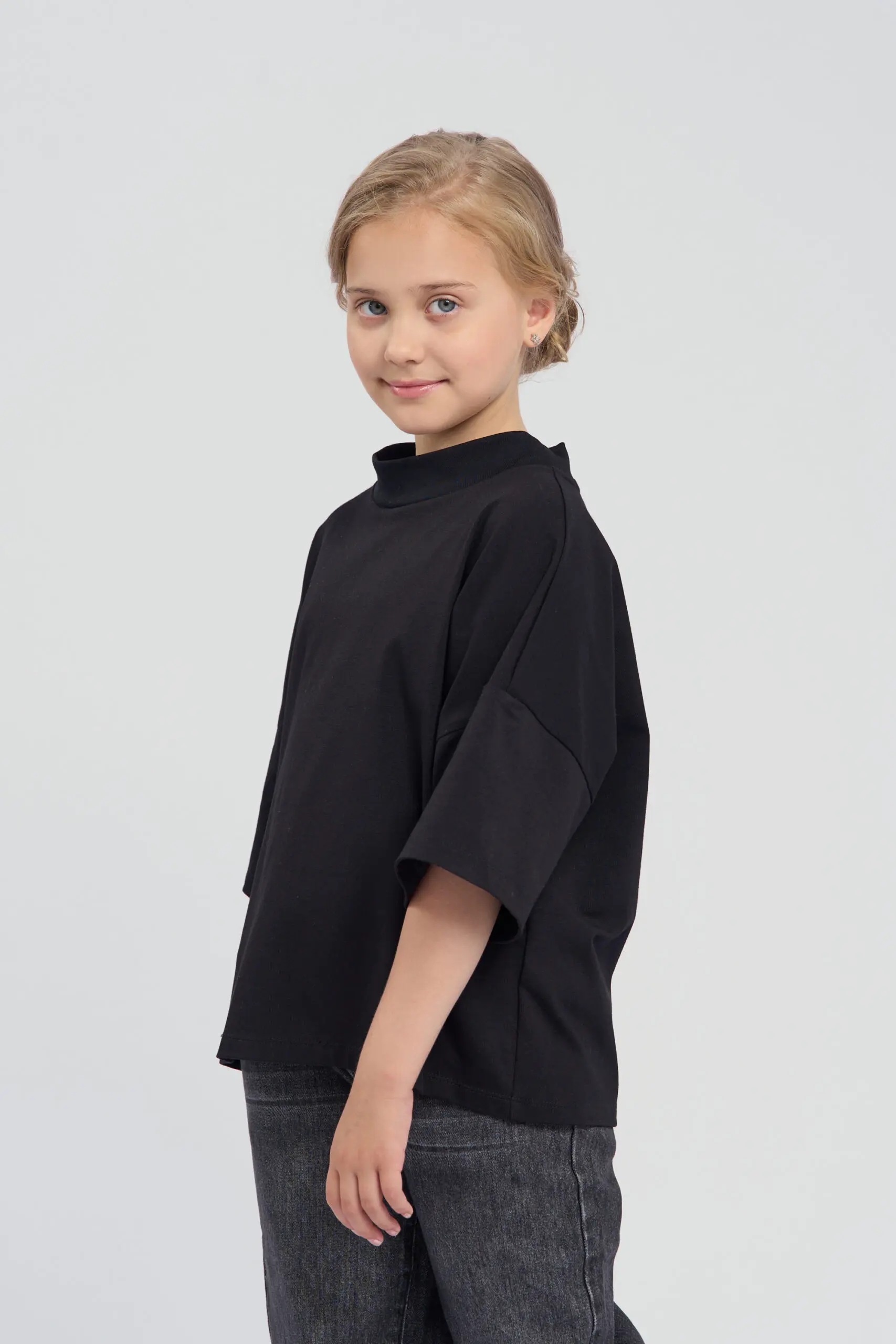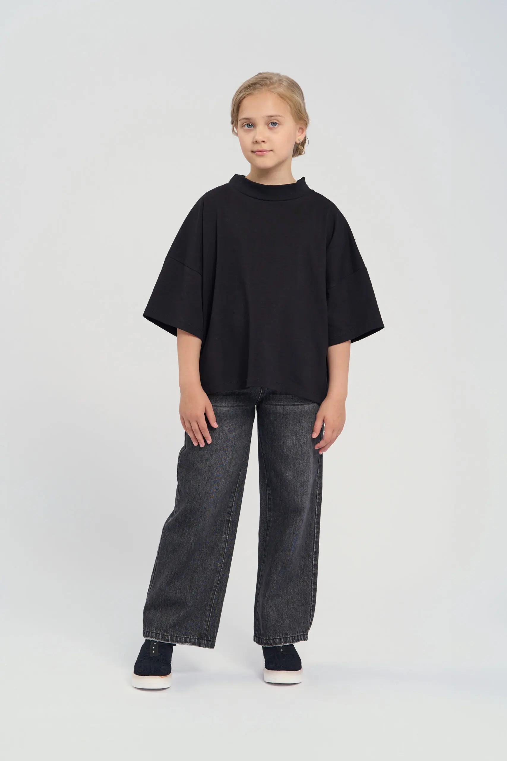 Футболка оверсайз из натурального хлопка чёрного цвета — универсальная и стильная модель для повседневного гардероба. Свободный крой с широким воротом создаёт расслабленный и непринуждённый образ. Спущенная ... линия плеча и широкие рукава подчёркивают трендовый силуэт оверсайз. Чёрный цвет делает футболку универсальной, она легко сочетается с любыми вещами — от джинсов до юбок, что позволяет создавать как повседневные, так и более стильные образы. Натуральный хлопок обеспечивает ребенку непревзойденный комфорт.