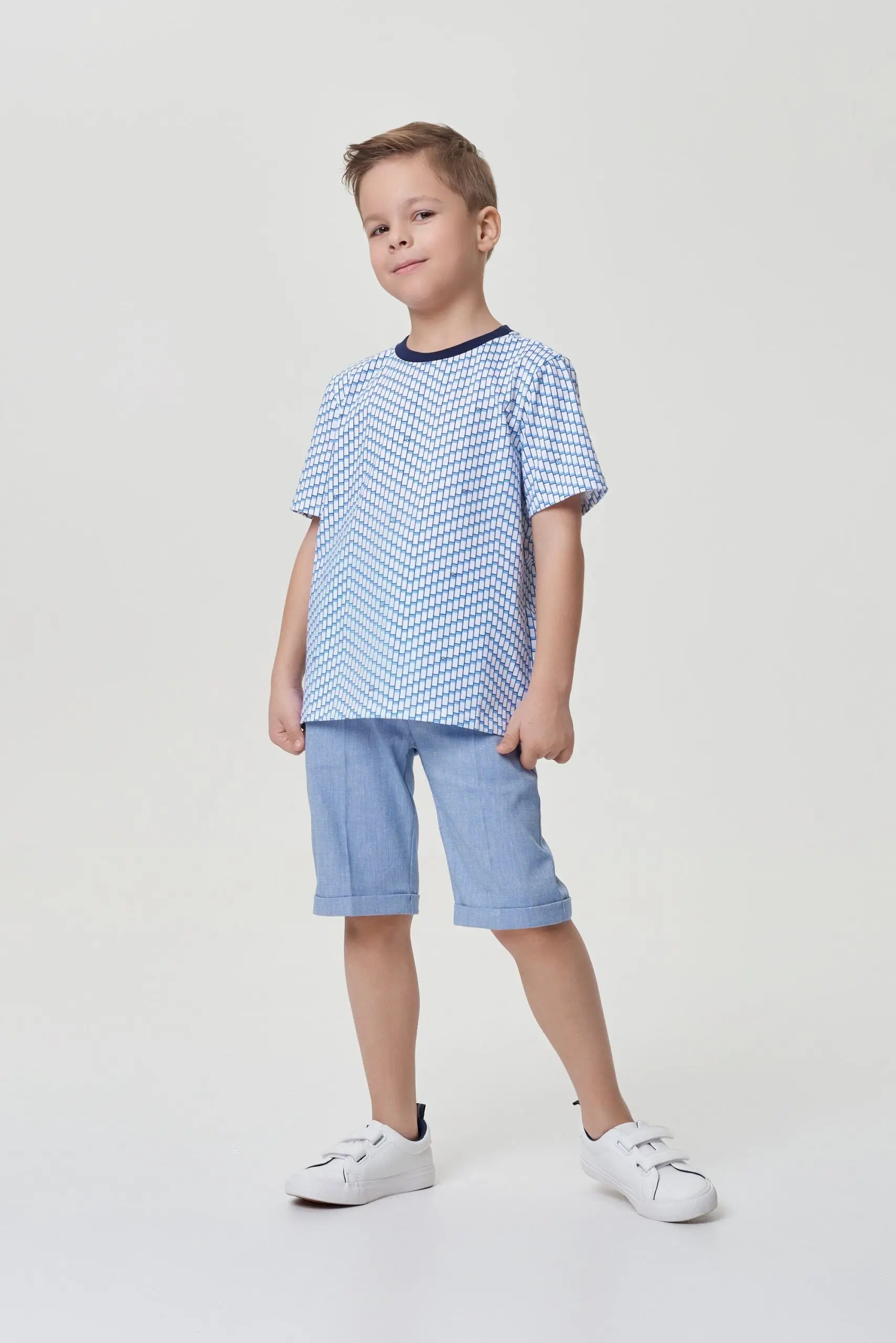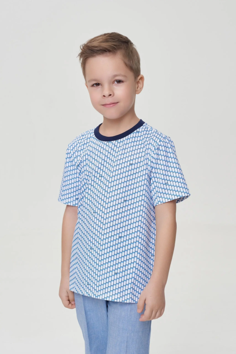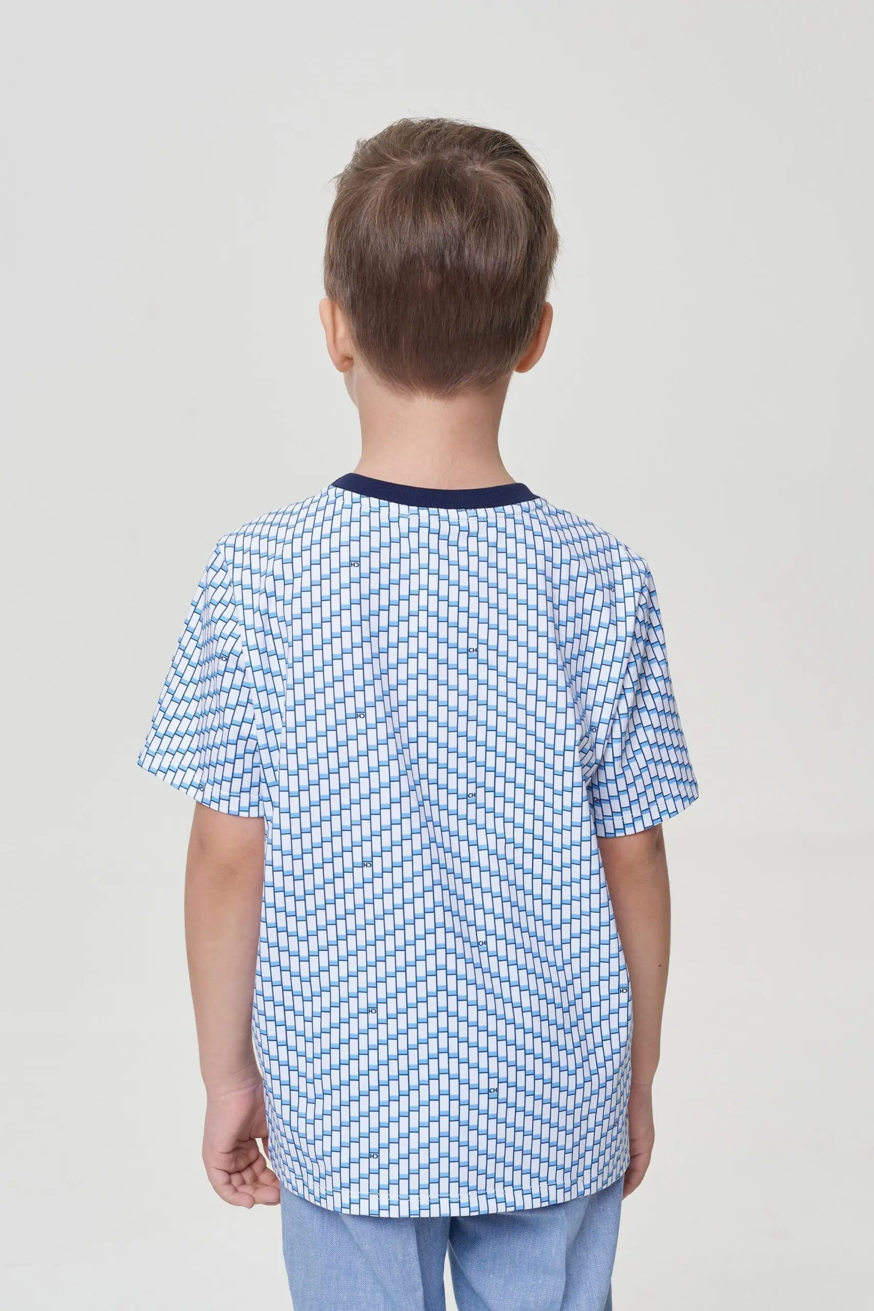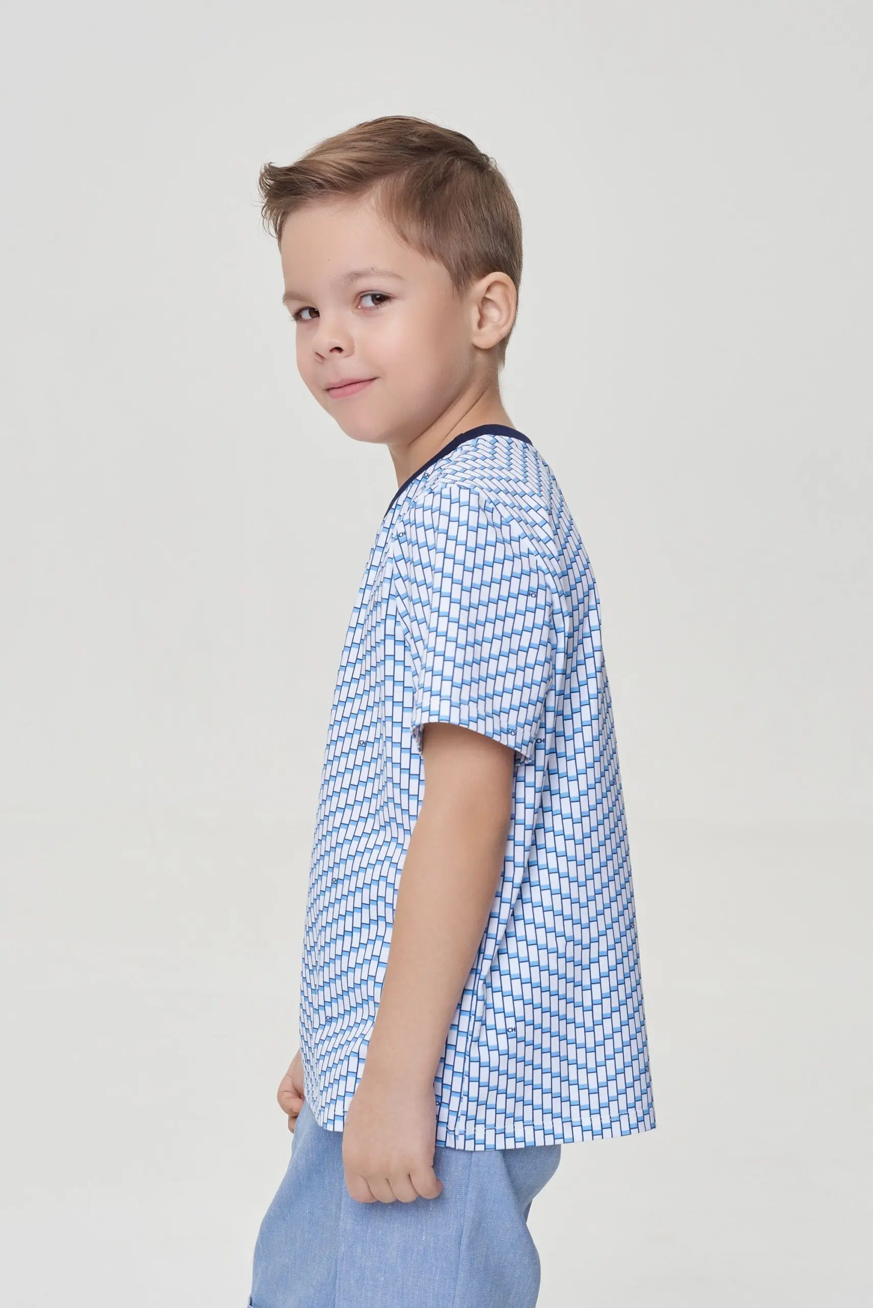Футболка из принтованного трикотажа для мальчика – это идеальный выбор для активных детей, которые ценят комфорт и стиль. Свободный крой обеспечивает свободу движений, что особенно важно ... для игр на свежем воздухе. Округлая горловина, отороченная контрастной бейкой, добавляет изюминку в общий дизайн и делает футболку более привлекательной. Голубой цвет футболки прекрасно гармонирует как с темными, так и светлыми тонами. Это делает ее универсальным вариантом для любых случаев – будь то прогулка с друзьями или семейное торжество.