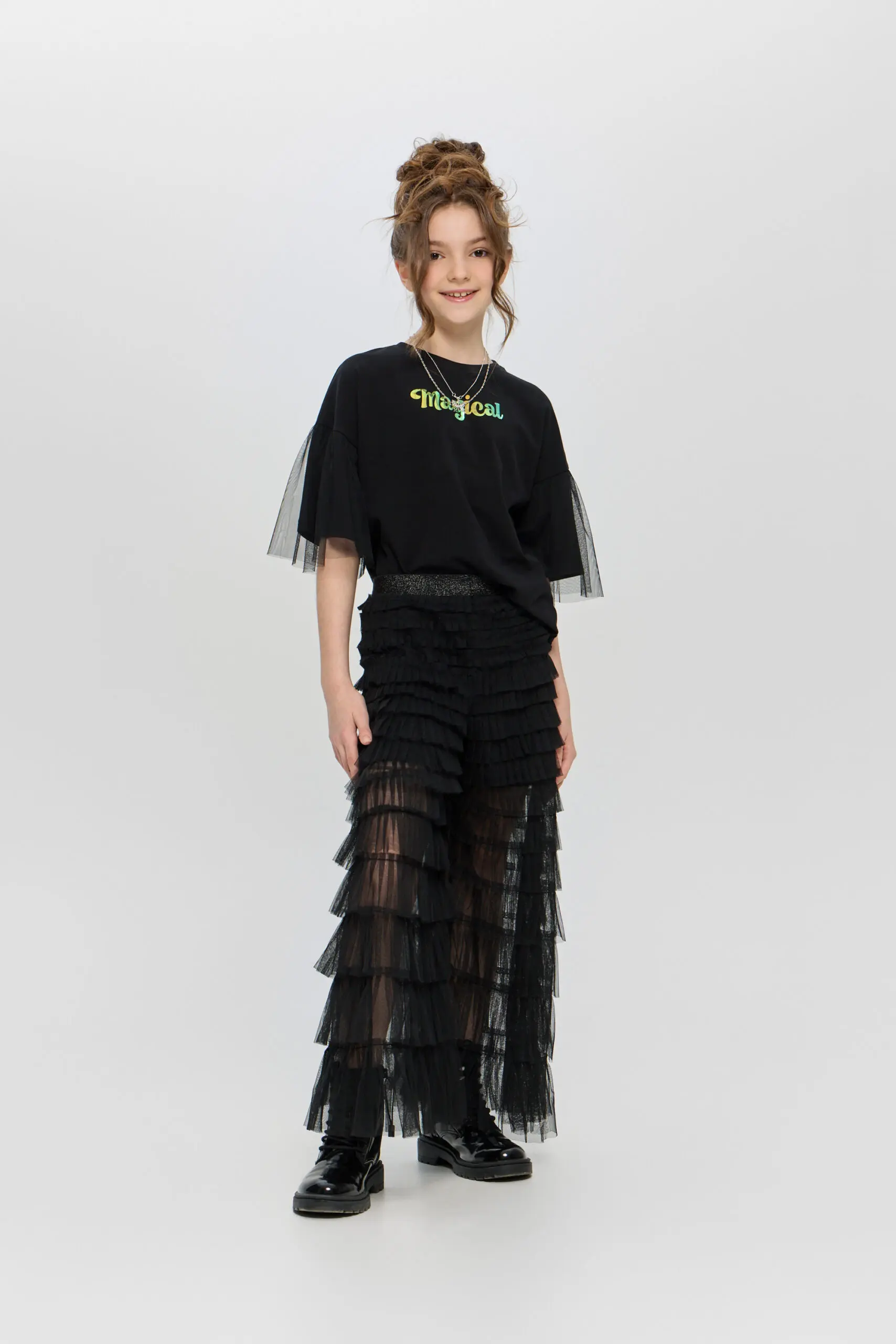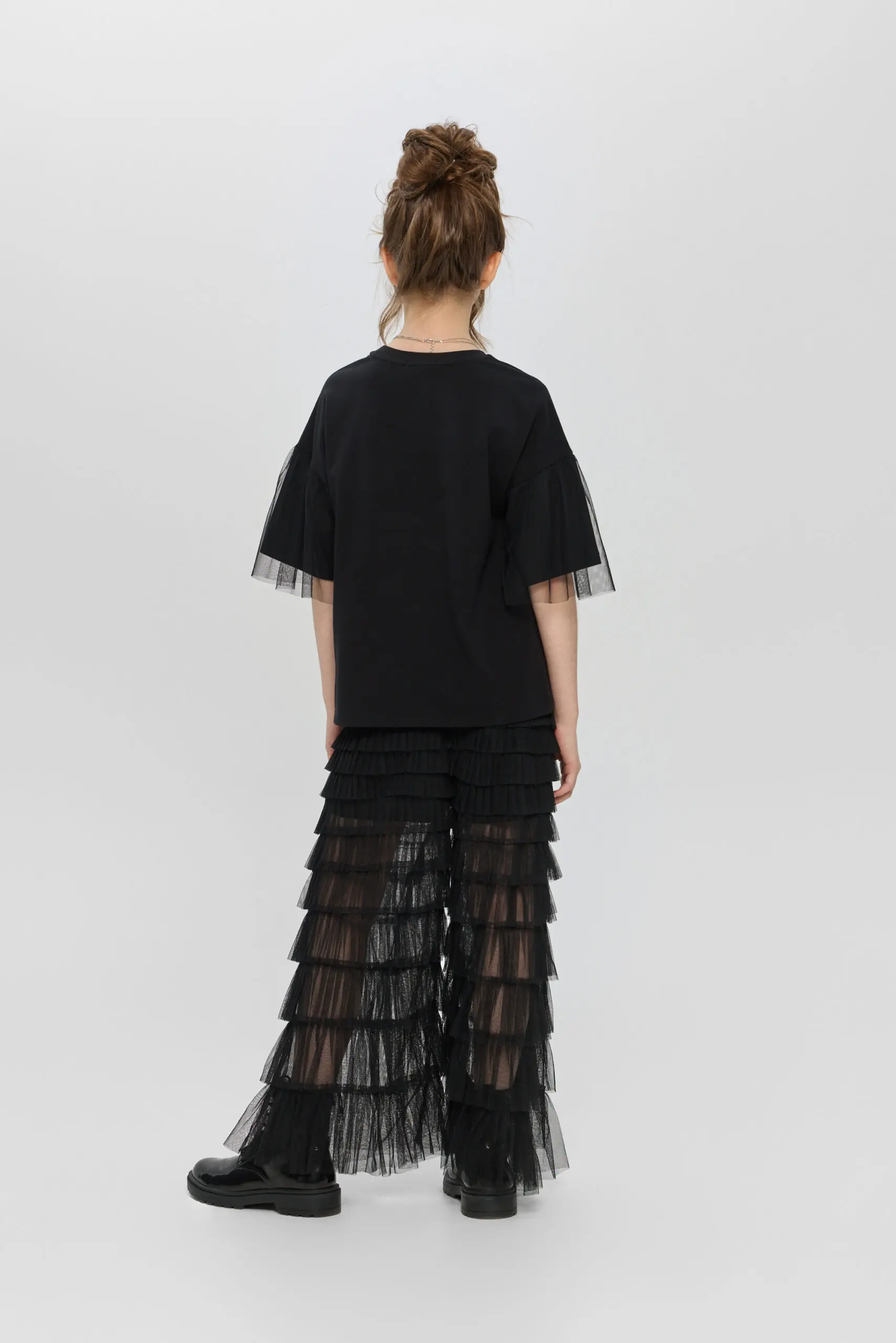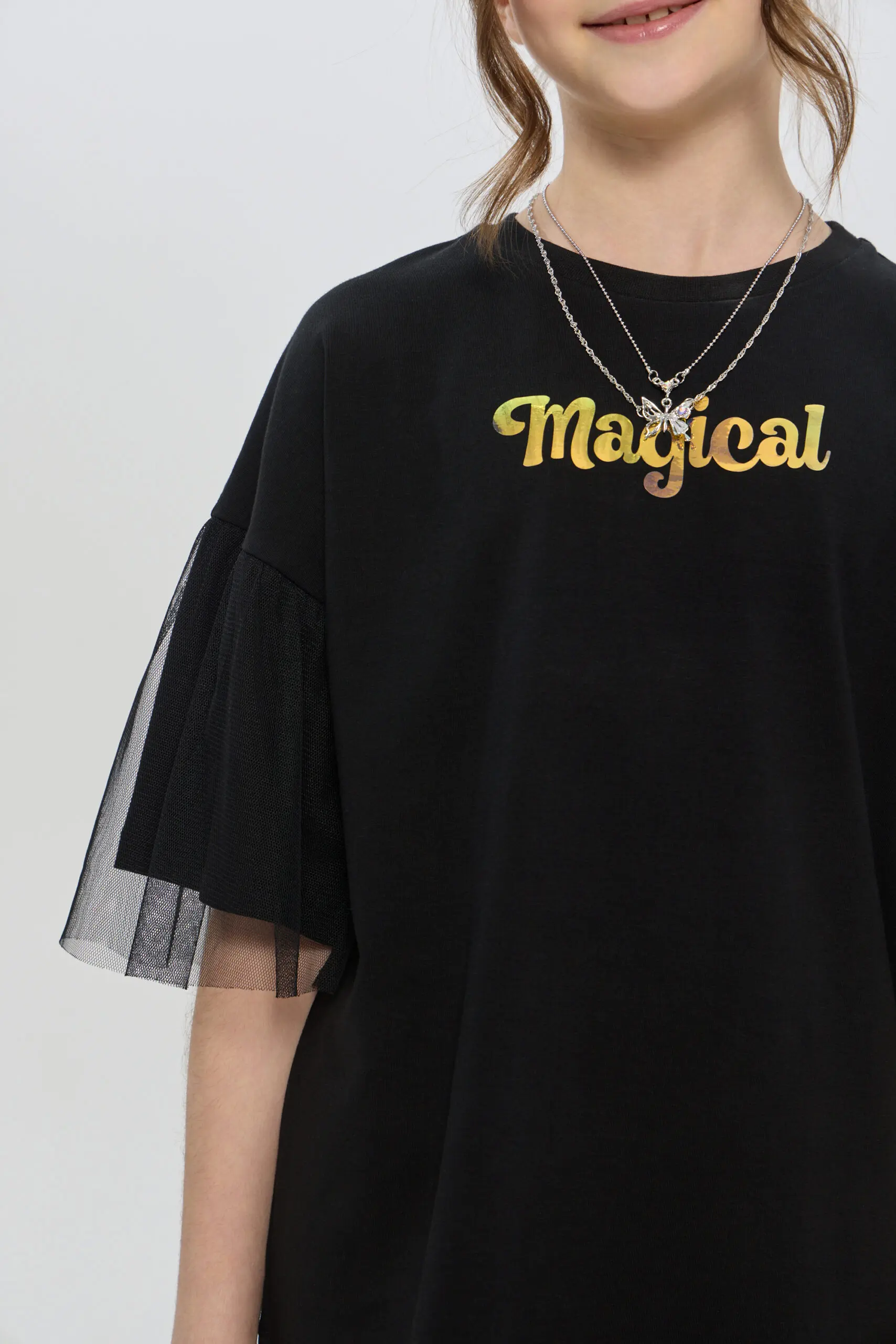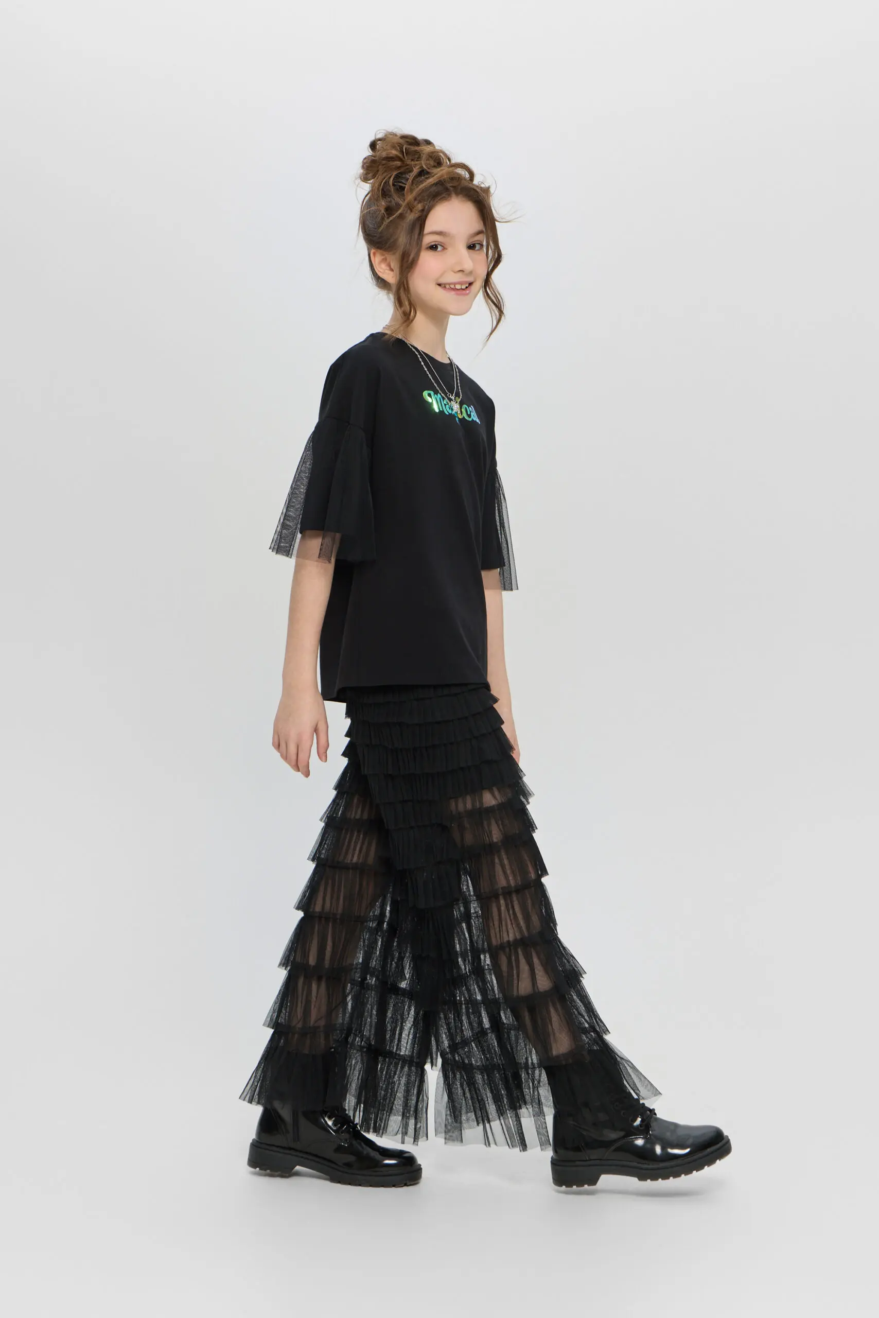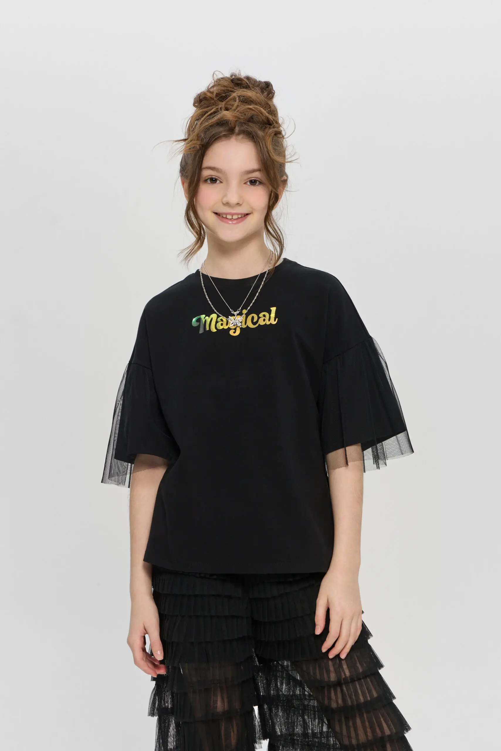 Футболка с декором — это стильный и современный элемент гардероба, который отлично подходит для создания эффектных образов. Особенностью модели является фантазийный многослойный рукав. В комплекте с ... футболкой идет цепочка, которая служит дополнительным акцентом в образе. Модель идеально подойдет для вечерних выходов, вечеринок или повседневных образов.