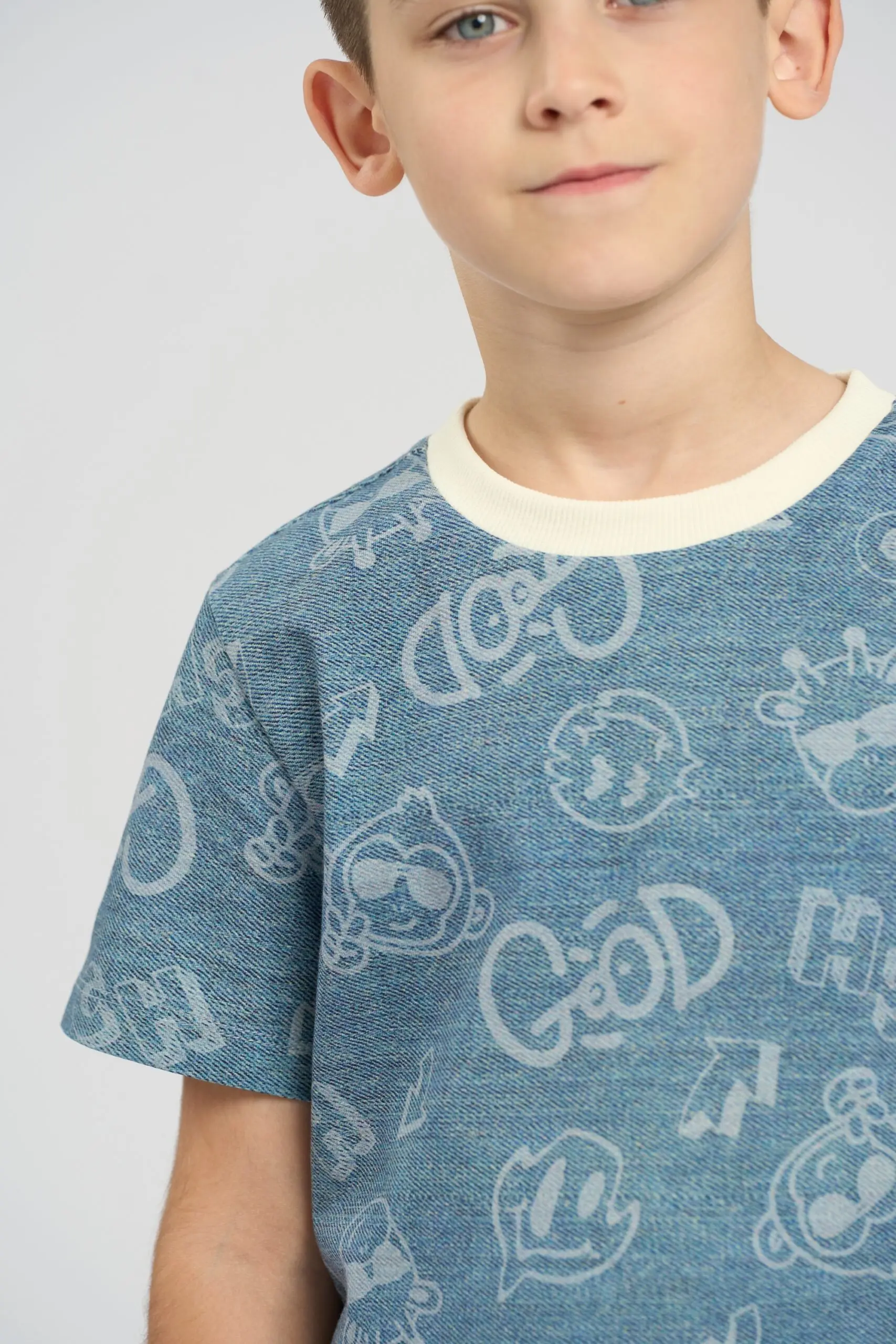 Стильная футболка станет отличным выбором для активных мальчиков. Выполненная в серо-голубом цвете, она легко комбинируется с различной одеждой и подходит для повседневной носки. Яркий и оригинальный ... принт на передней части футболки добавляет дизайну уникальности. Он обязательно привлечет внимание и поднимет настроение ребенку. Удобные короткие рукава позволяют свободно двигаться, что делает футболку идеальной для игр и активного отдыха. Футболка изготовлена из мягкого и дышащего хлопка, что обеспечивает комфорт в течение всего дня.
