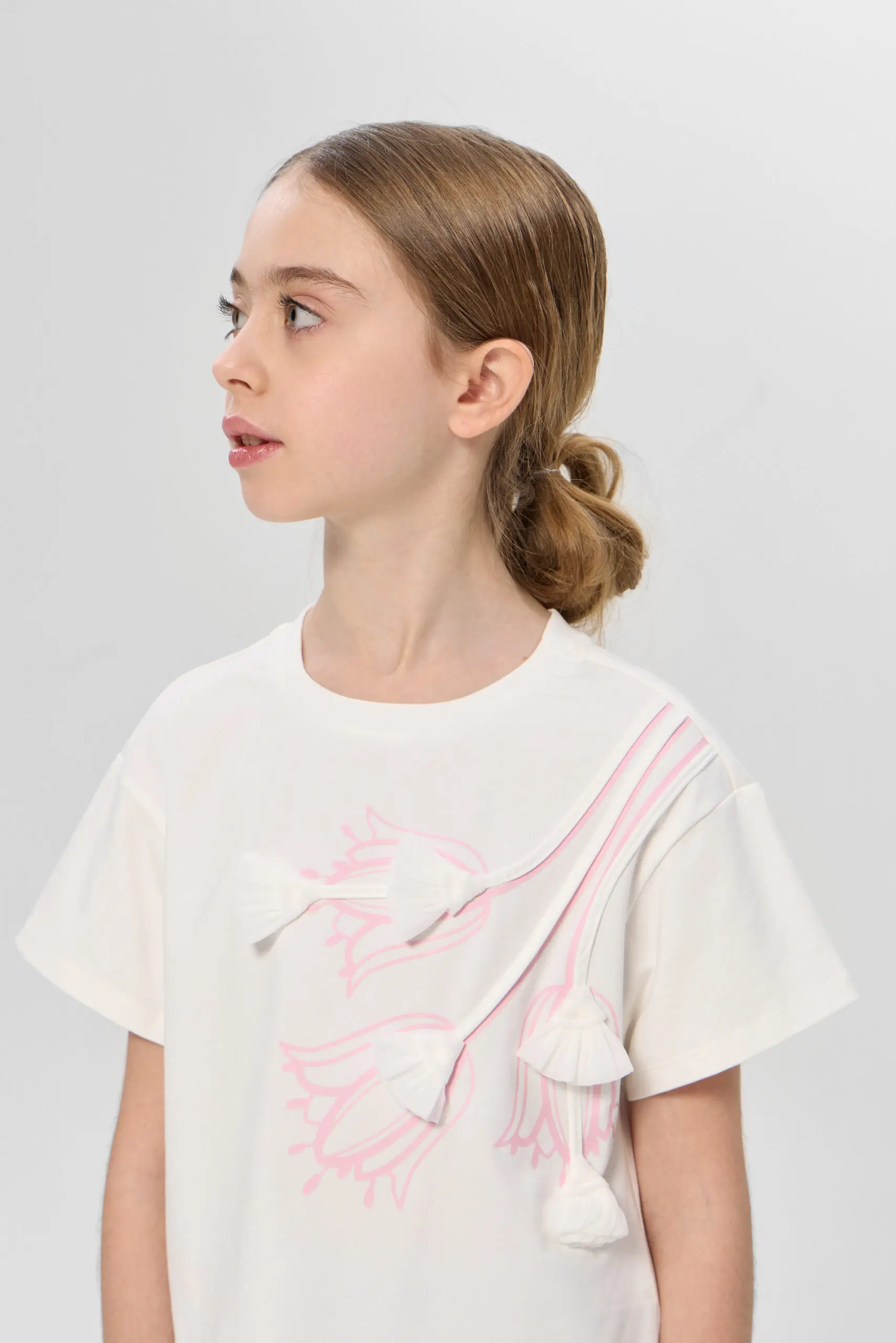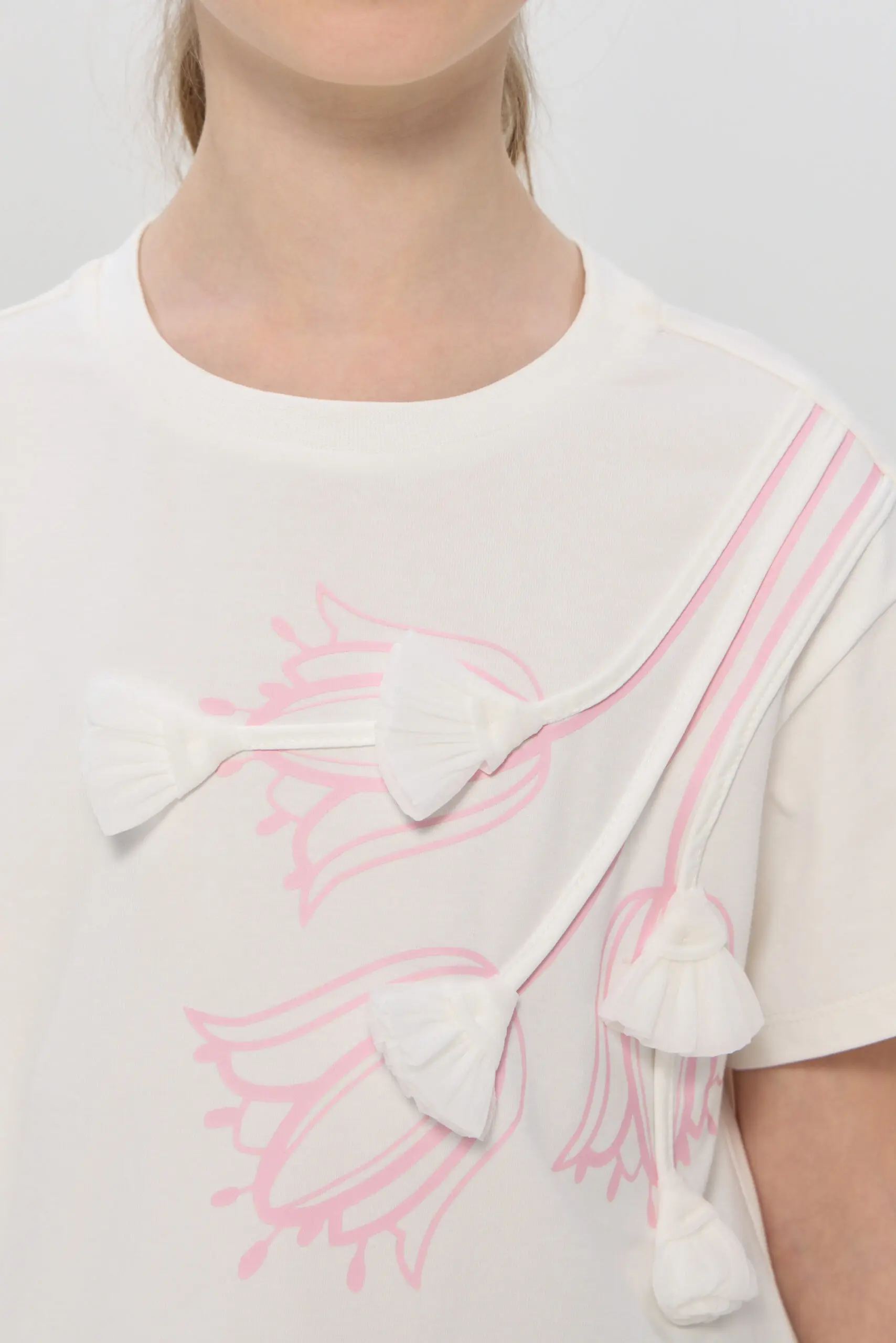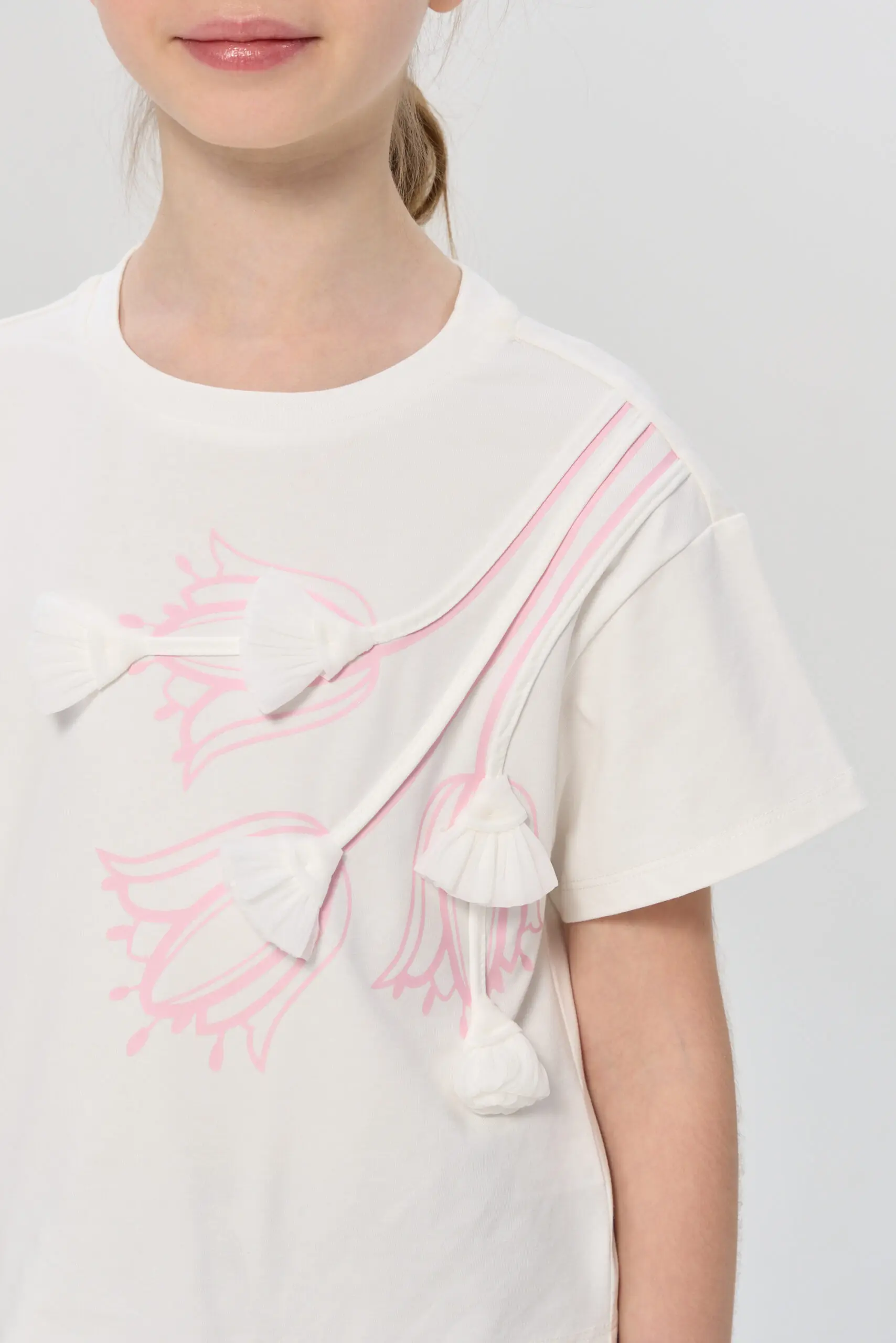 Футболка с декором для девочки идеально подходит для создания стильных образов. Свободный крой и заниженная линия плеча не сковывает движения, что особенно важно для активных детей. ... Оригинальный декор в виде объёмных цветов привлекает внимание и добавляет образу неповторимости. Эта футболка станет прекрасным дополнением к гардеробу юной модницы. Её можно сочетать с джинсами, юбками или шортами, создавая разнообразные комплекты для прогулок, игр или праздничных мероприятий.