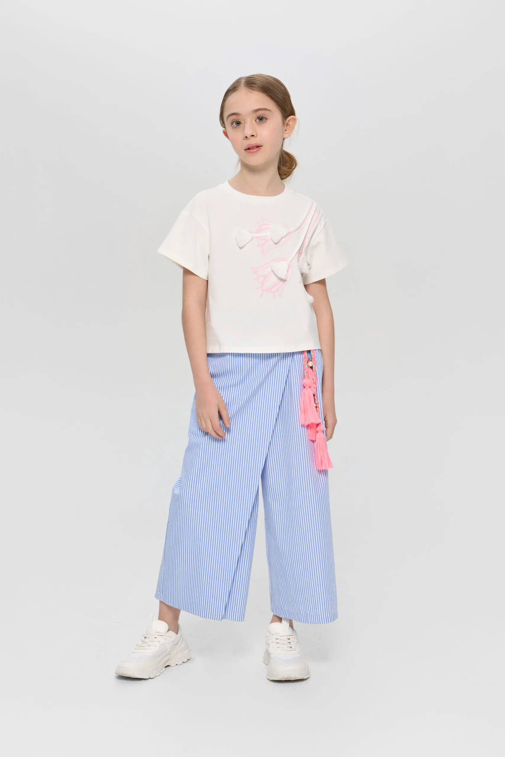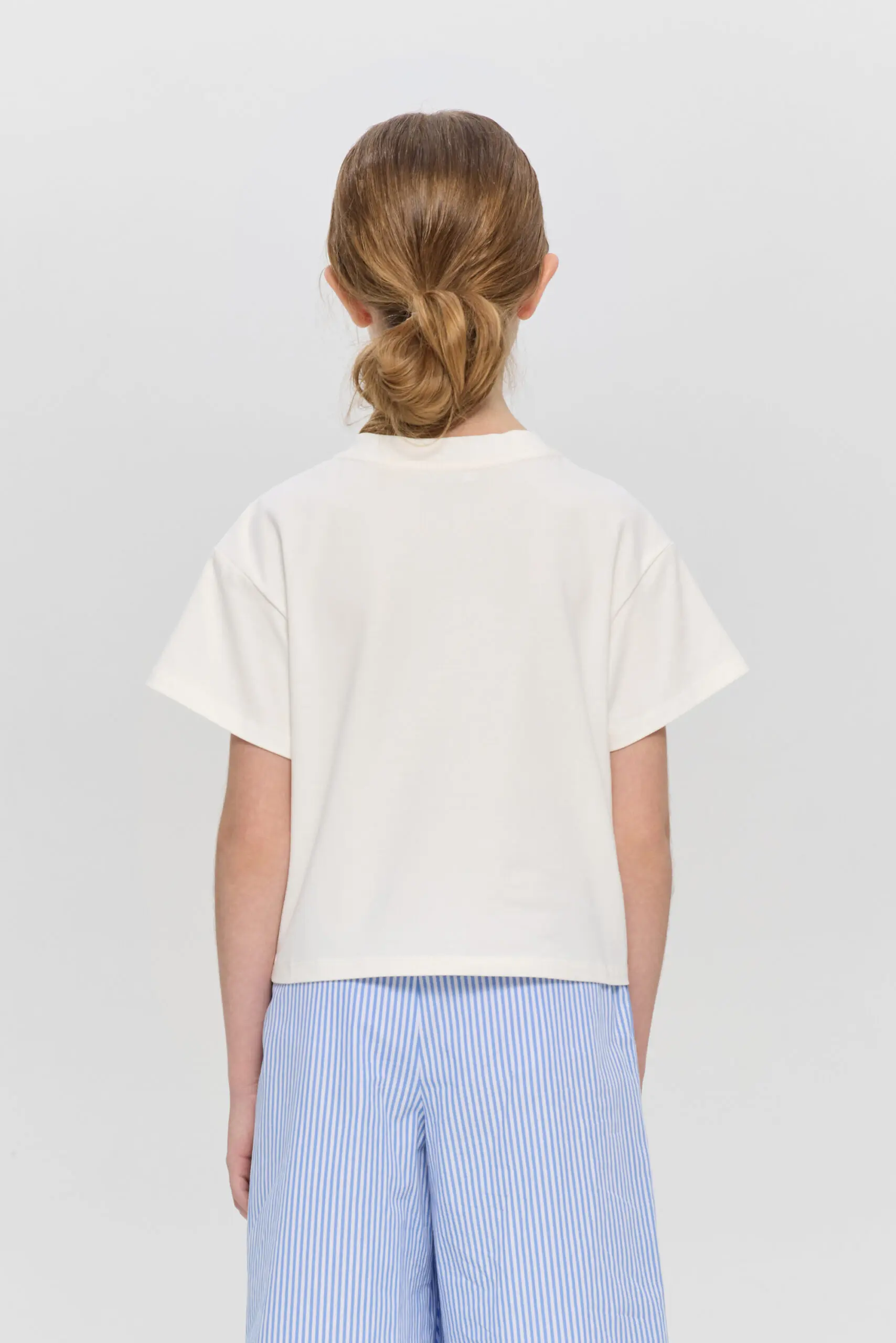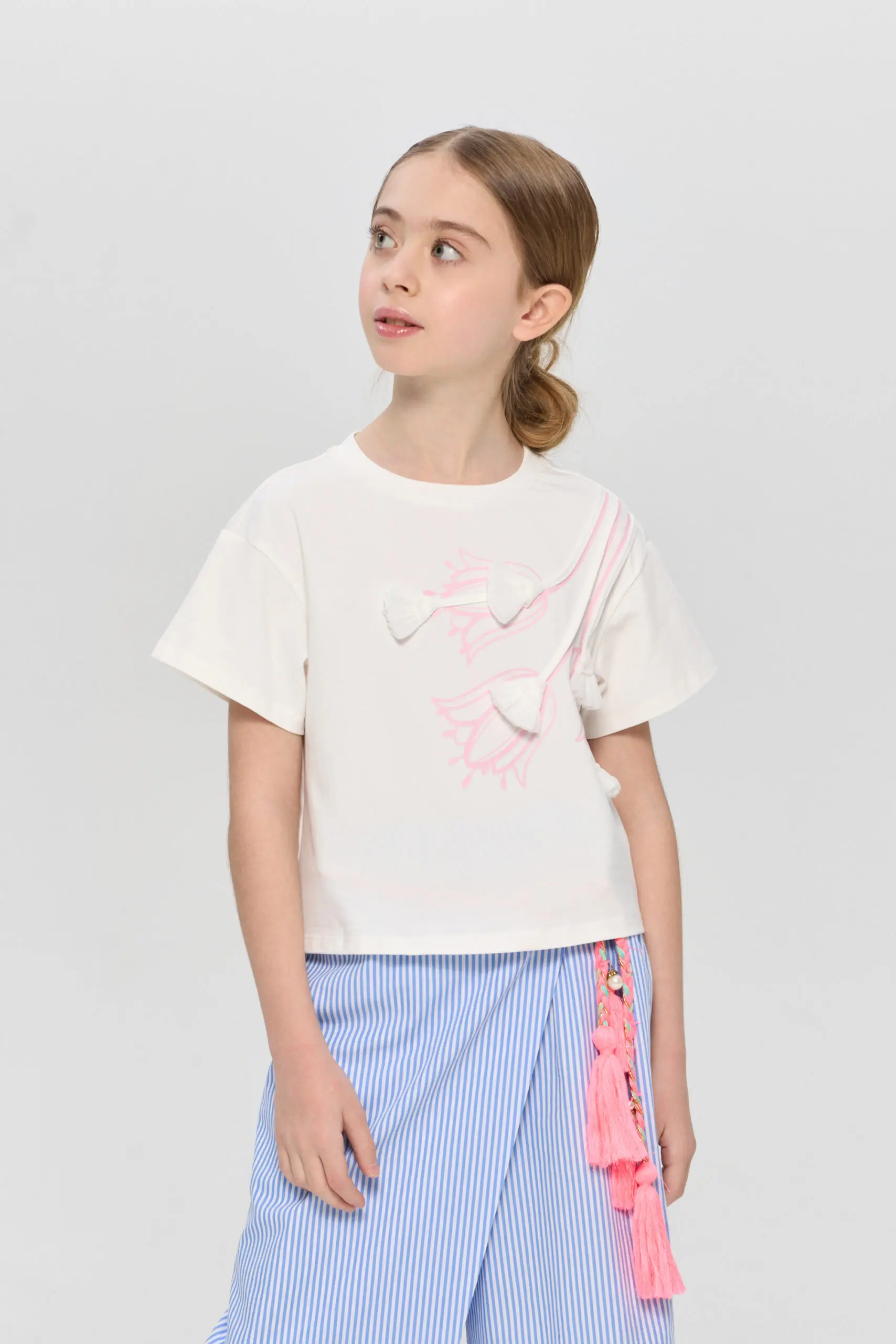 Футболка с декором для девочки идеально подходит для создания стильных образов. Свободный крой и заниженная линия плеча не сковывает движения, что особенно важно для активных детей. ... Оригинальный декор в виде объёмных цветов привлекает внимание и добавляет образу неповторимости. Эта футболка станет прекрасным дополнением к гардеробу юной модницы. Её можно сочетать с джинсами, юбками или шортами, создавая разнообразные комплекты для прогулок, игр или праздничных мероприятий.