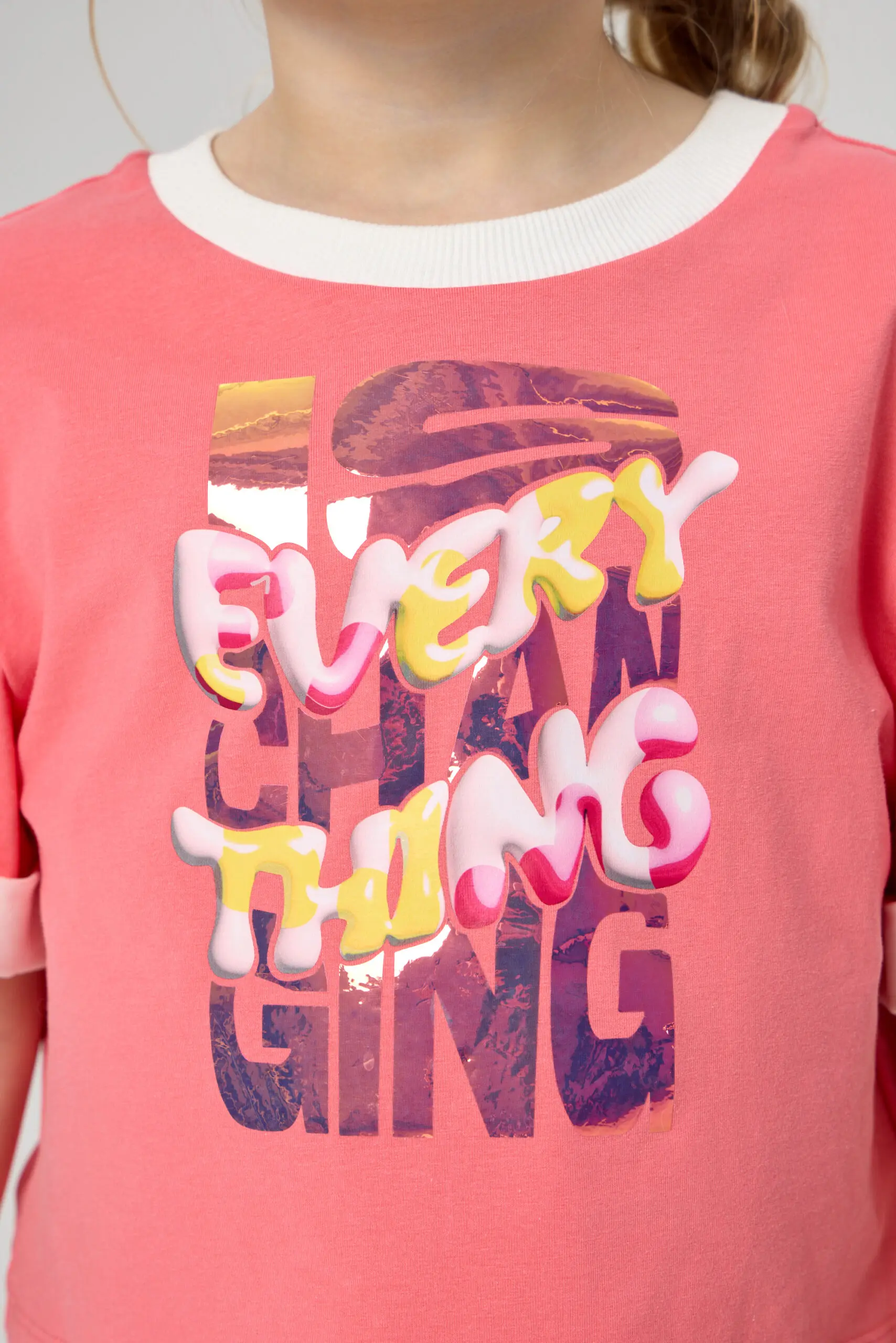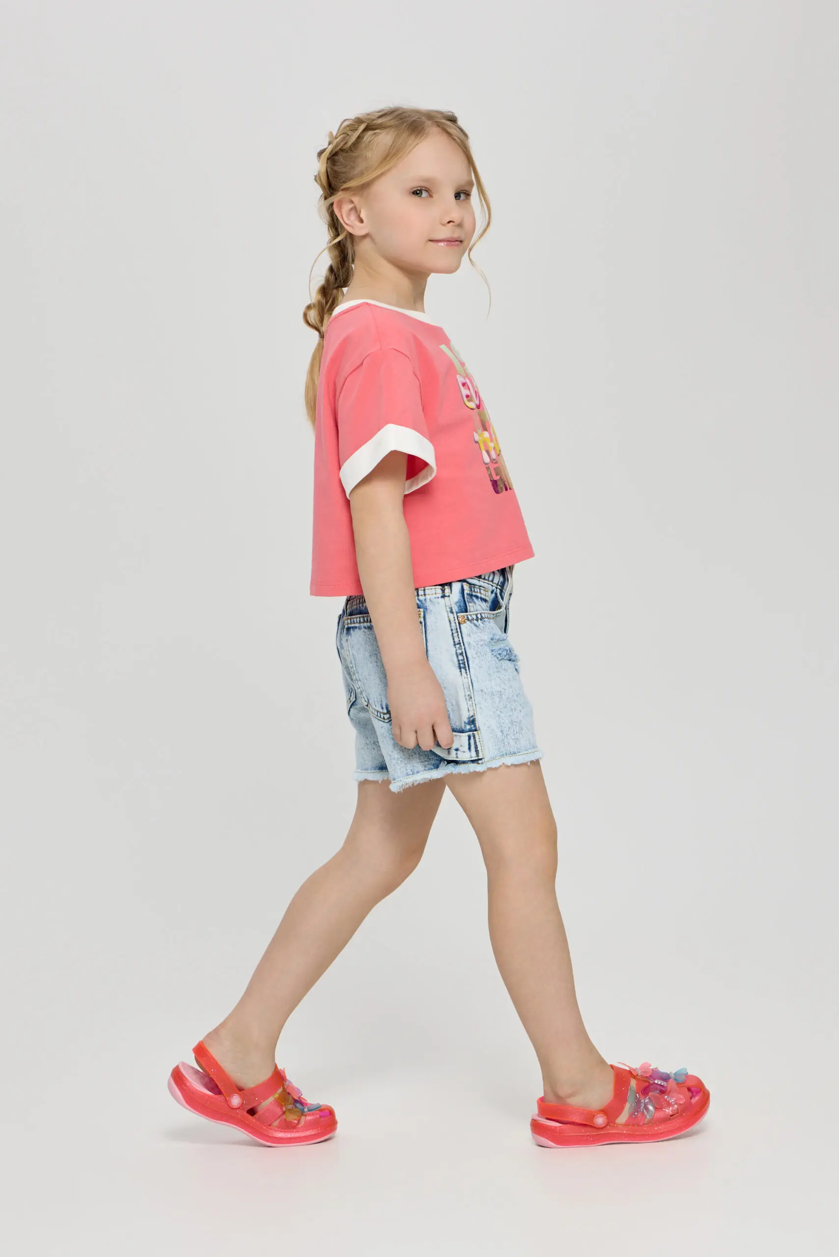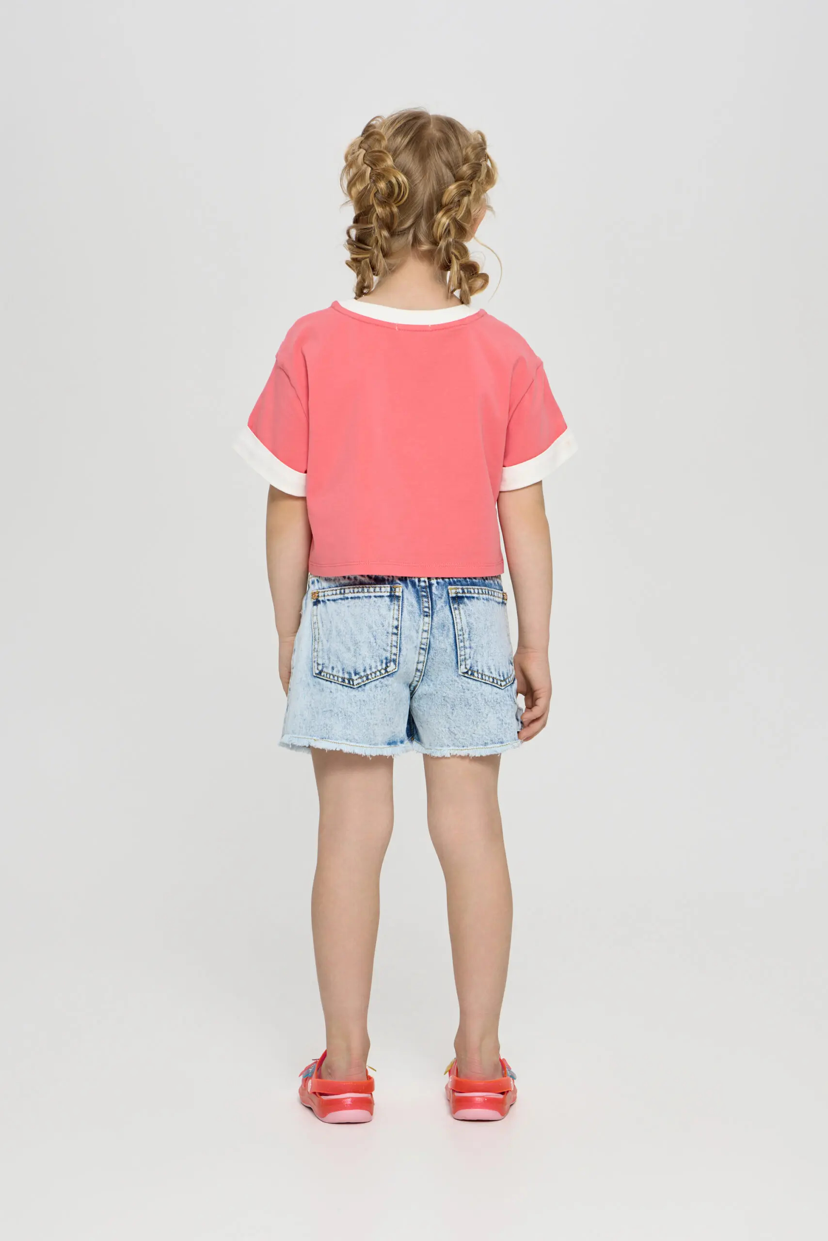Укороченная футболка кораллового цвета со стильным принтом и контрастной окантовкой. Модель украшена оригинальным дизайнерским принтом привлекающим внимание. Рукава и края изделия оформлены контрастной окантовкой, что придаёт ... футболке модный и современный вид. Изготовлена модель из мягкого и дышащего материала, который приятно ощущается на коже и обеспечивает ребенку комфорт в течение всего дня.