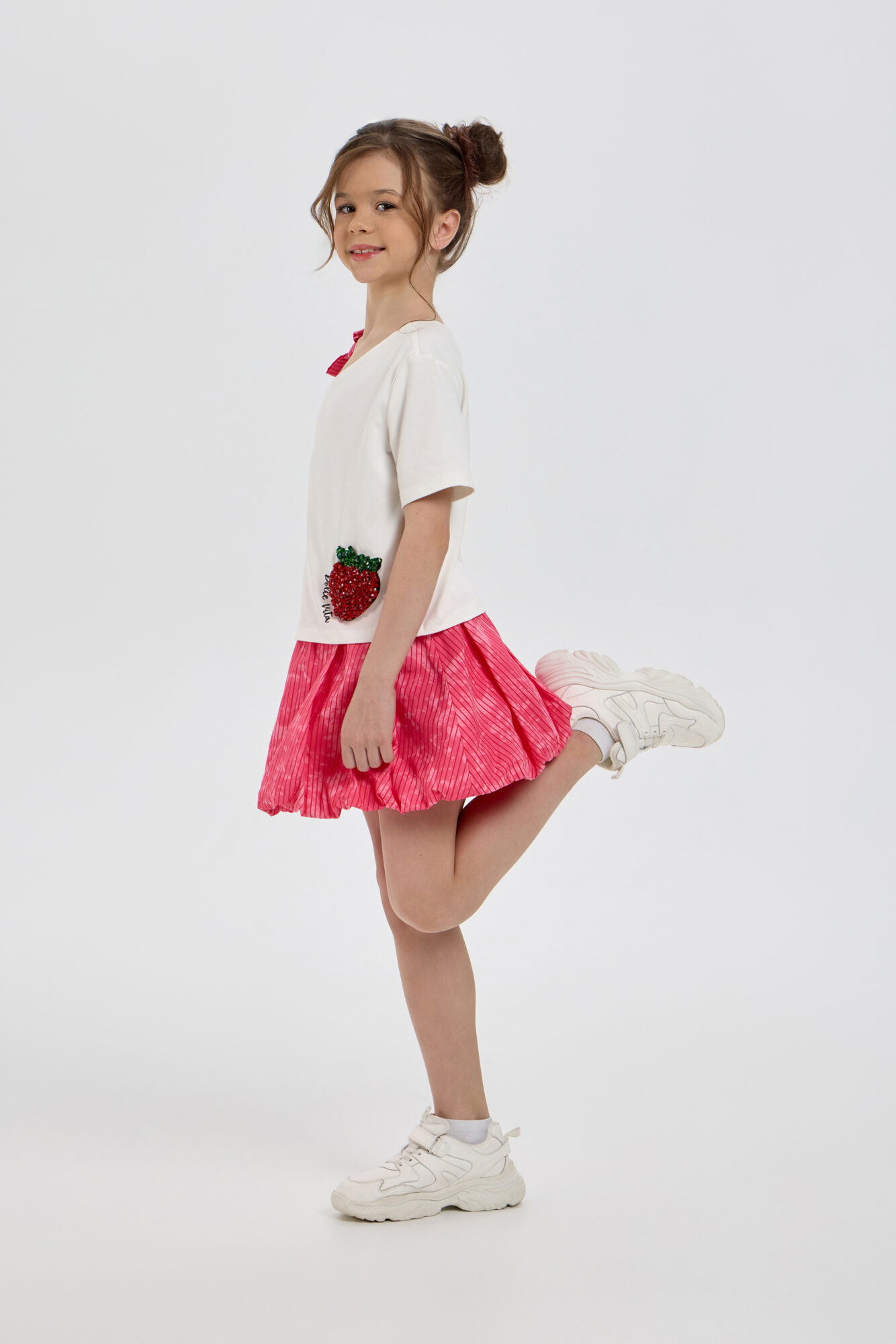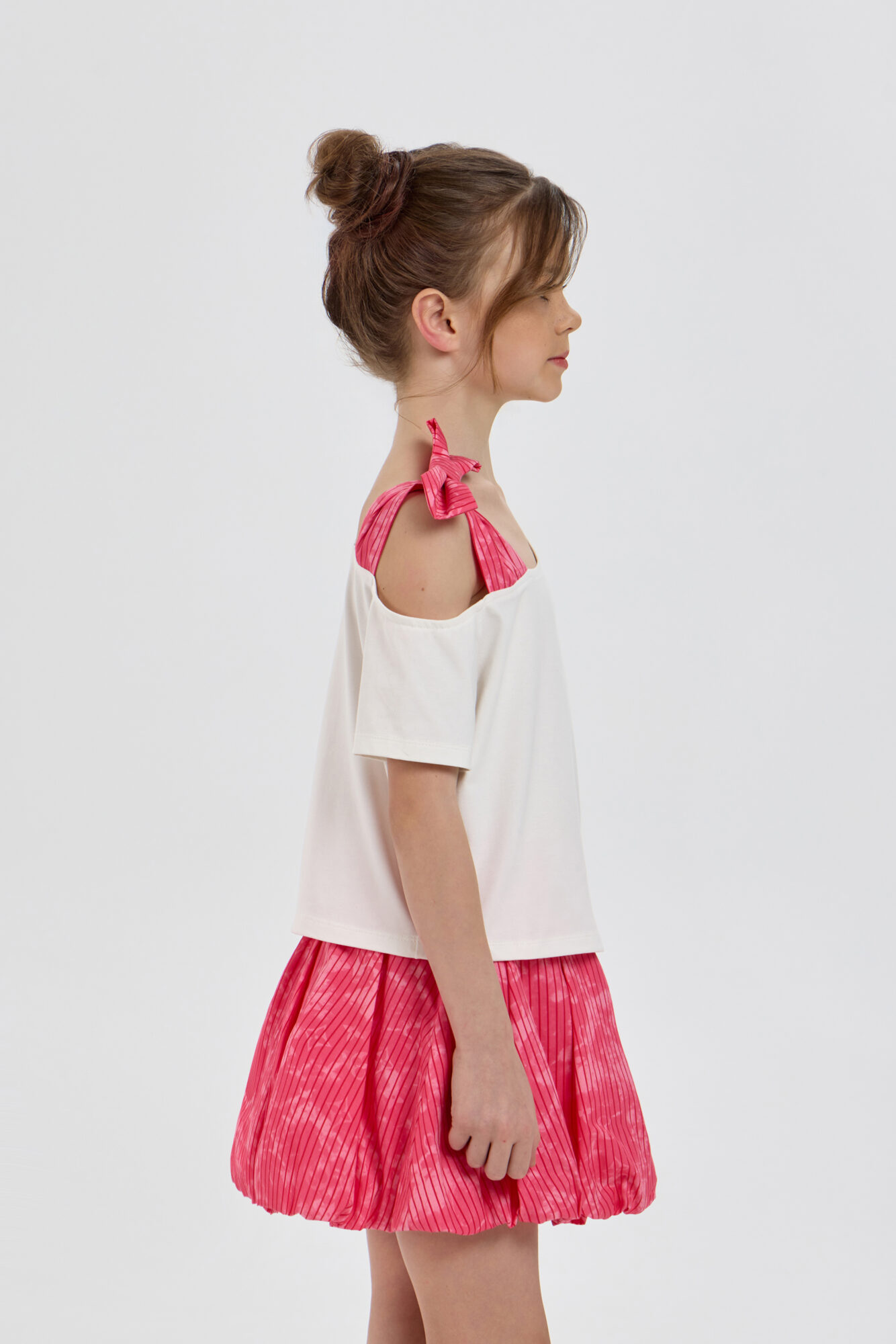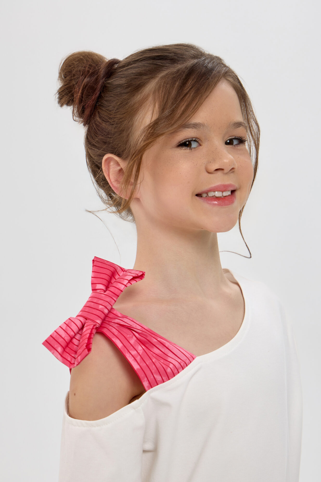 Модная футболка с открытым плечом для девочки- главный тренд лета. Футболка свободного кроя выполнена из качественного и приятного на ощупь материала. Преобладание хлопка с добавлением эластана ... облегчает уход и помогает сохранять форму. Отличительные черты: асимметричный дизайн, открытое плечо, яркий декор. Футболка легко сочетается с разными вариантами низов: будь то джинсы, брюки, шорты или юбки.