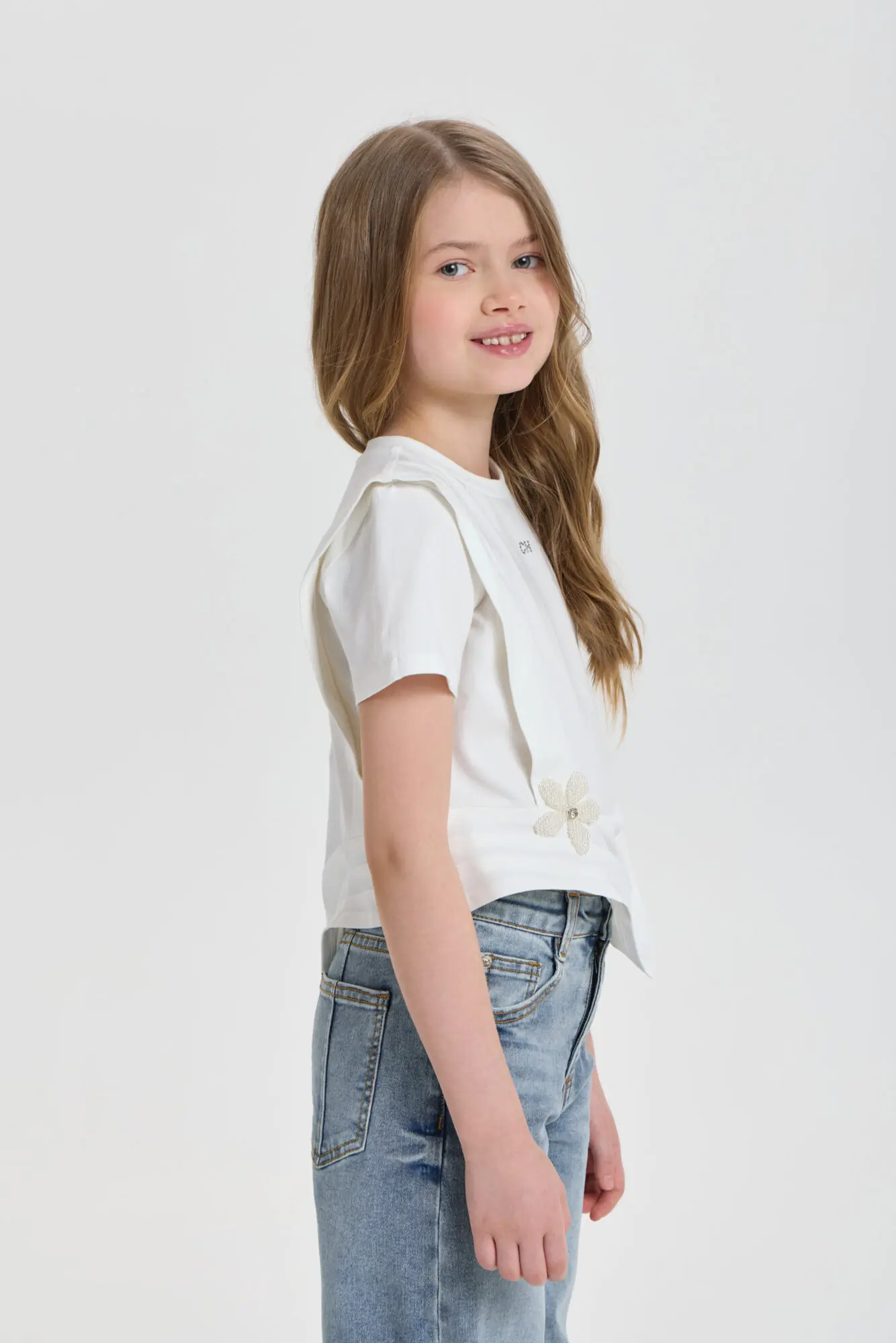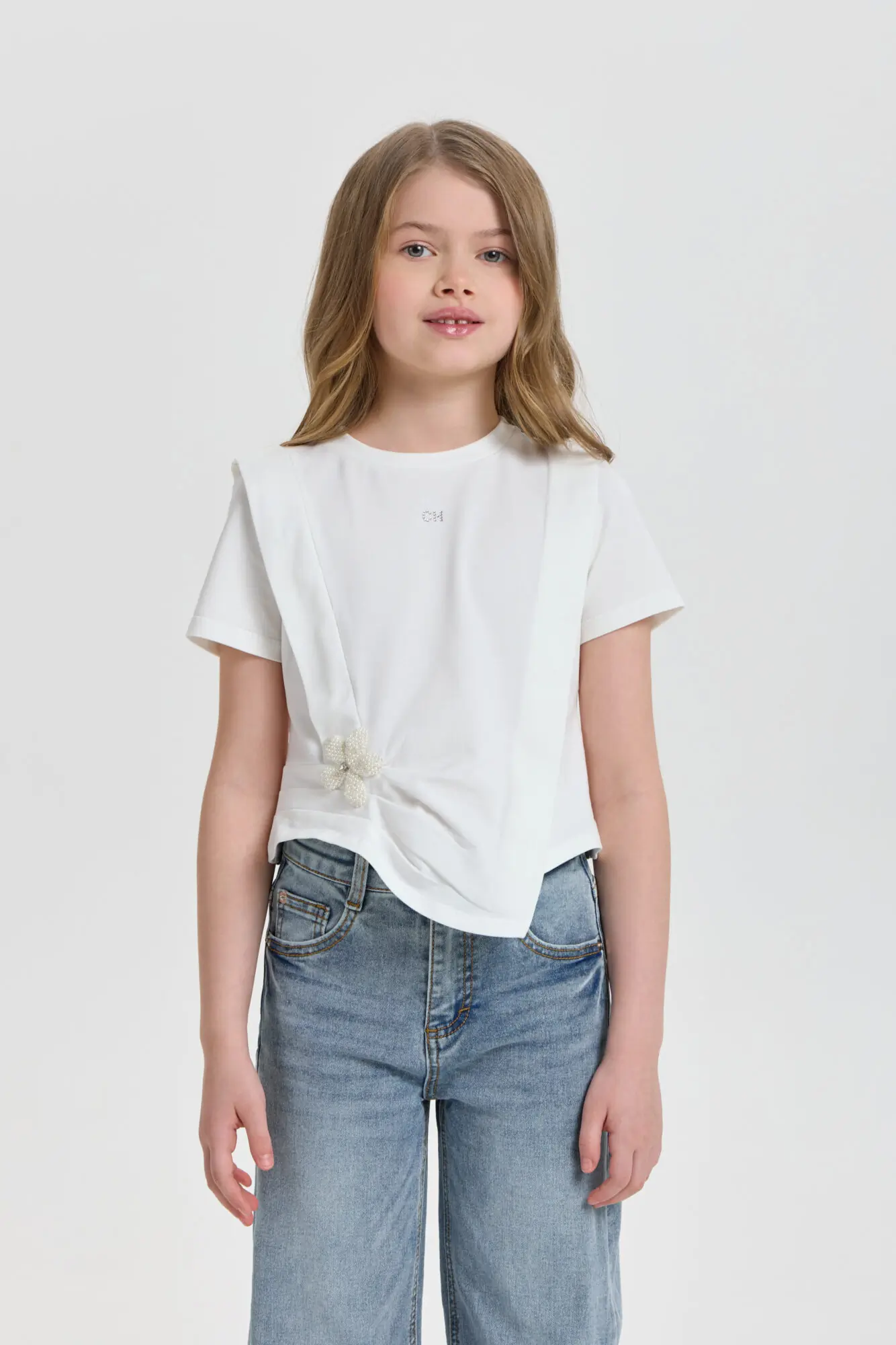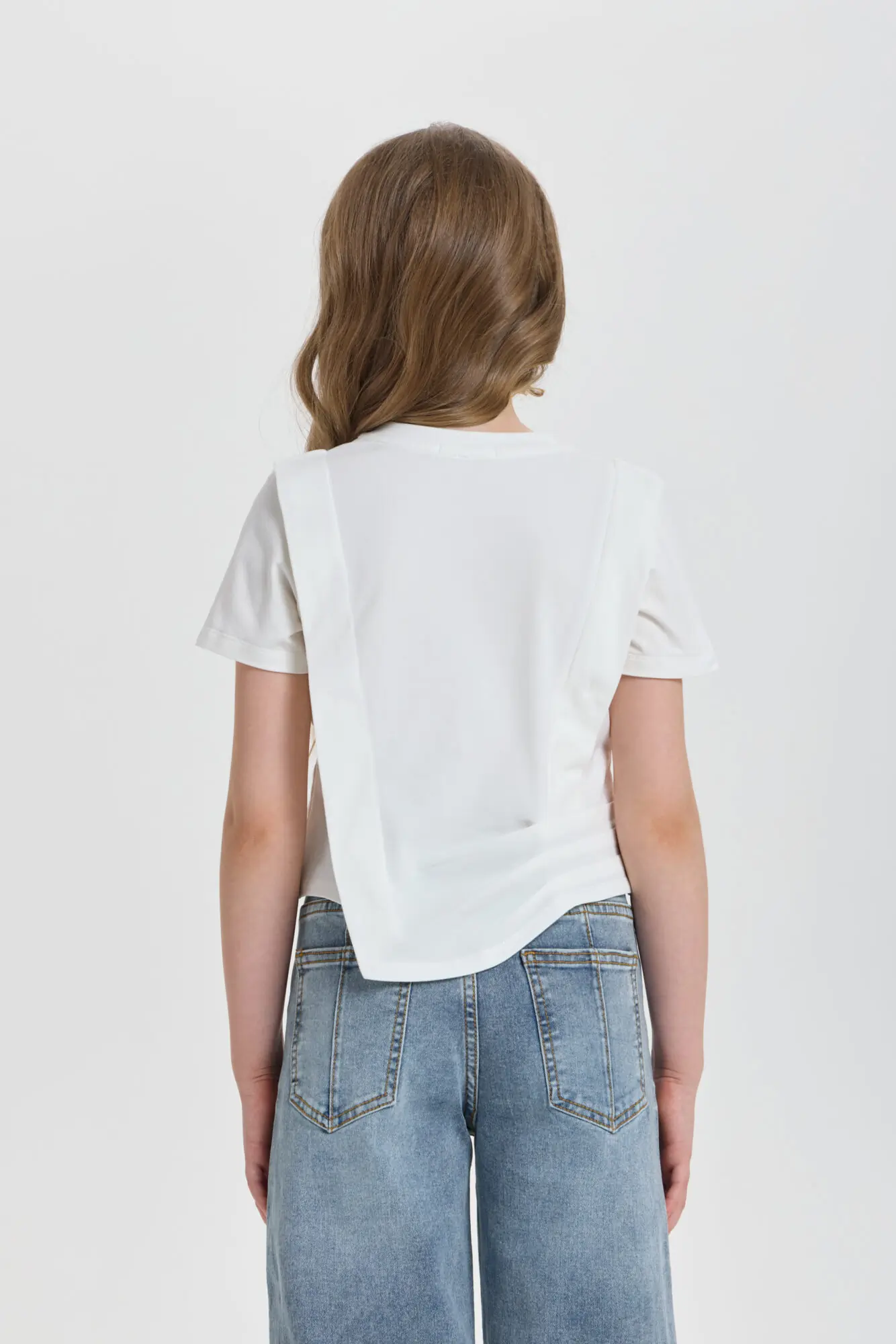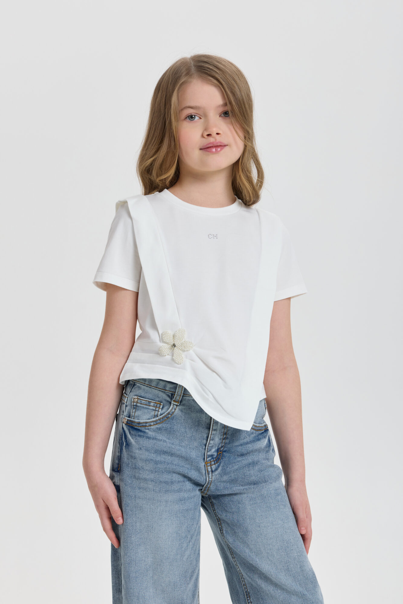 Футболка декором для девочки универсальная модель для любого случая. Футболка свободного кроя, рукава короткие, оригинальность изделию придает асимметричный подол и объёмный декор. Модель идеально подходит как ... для ежедневной носки, так и для праздничного события. Прекрасно комбинируется с брюками, джинсами и юбками.