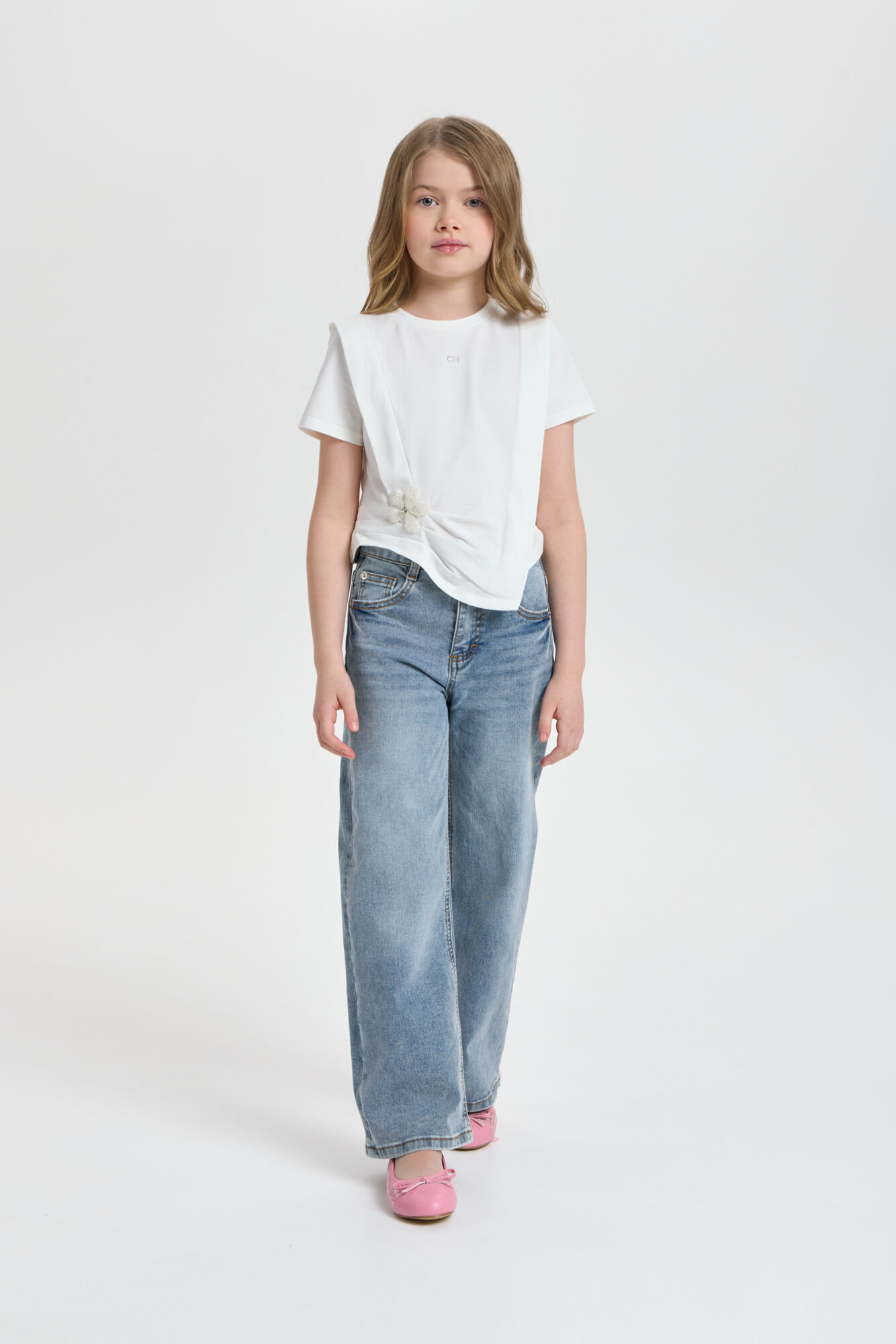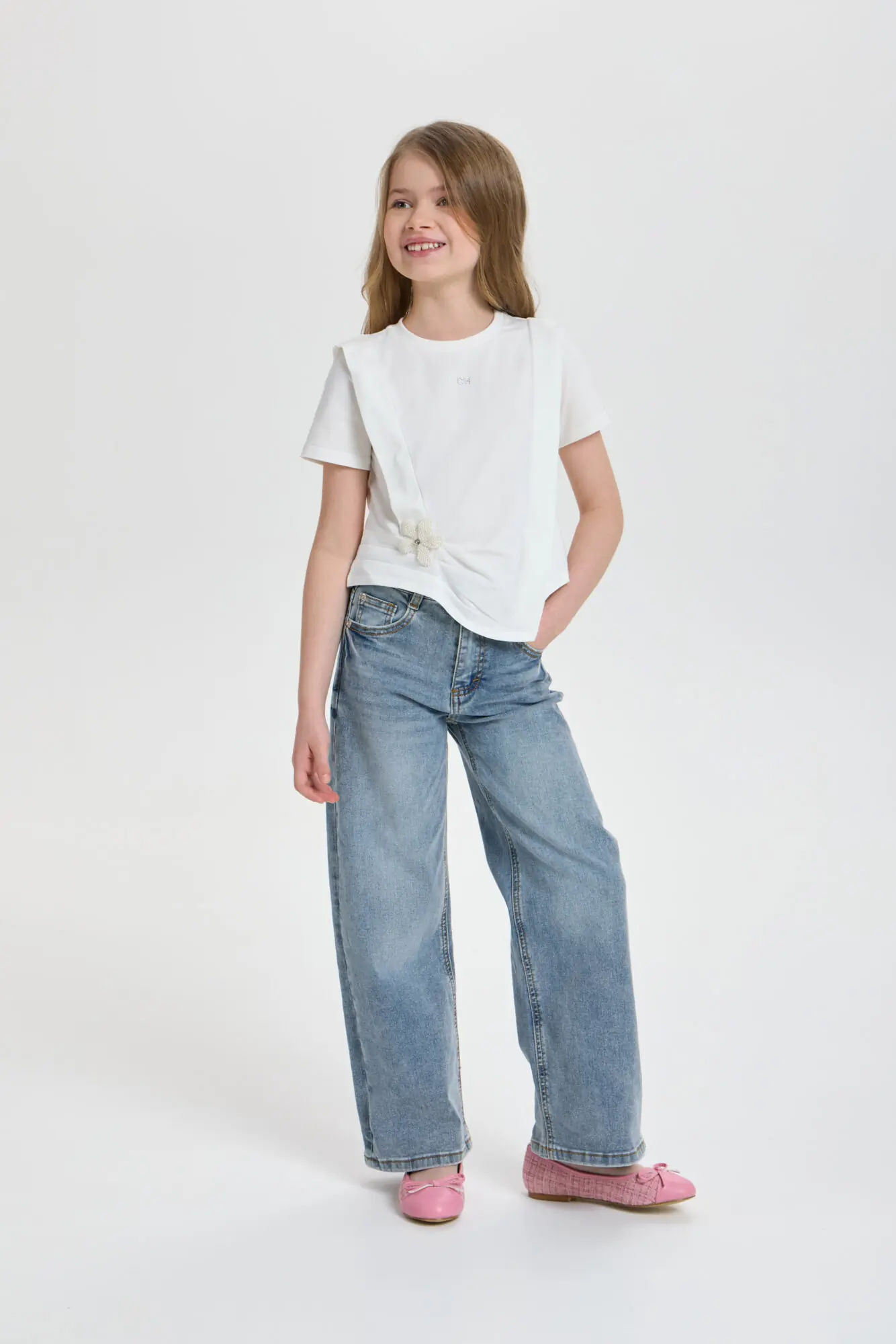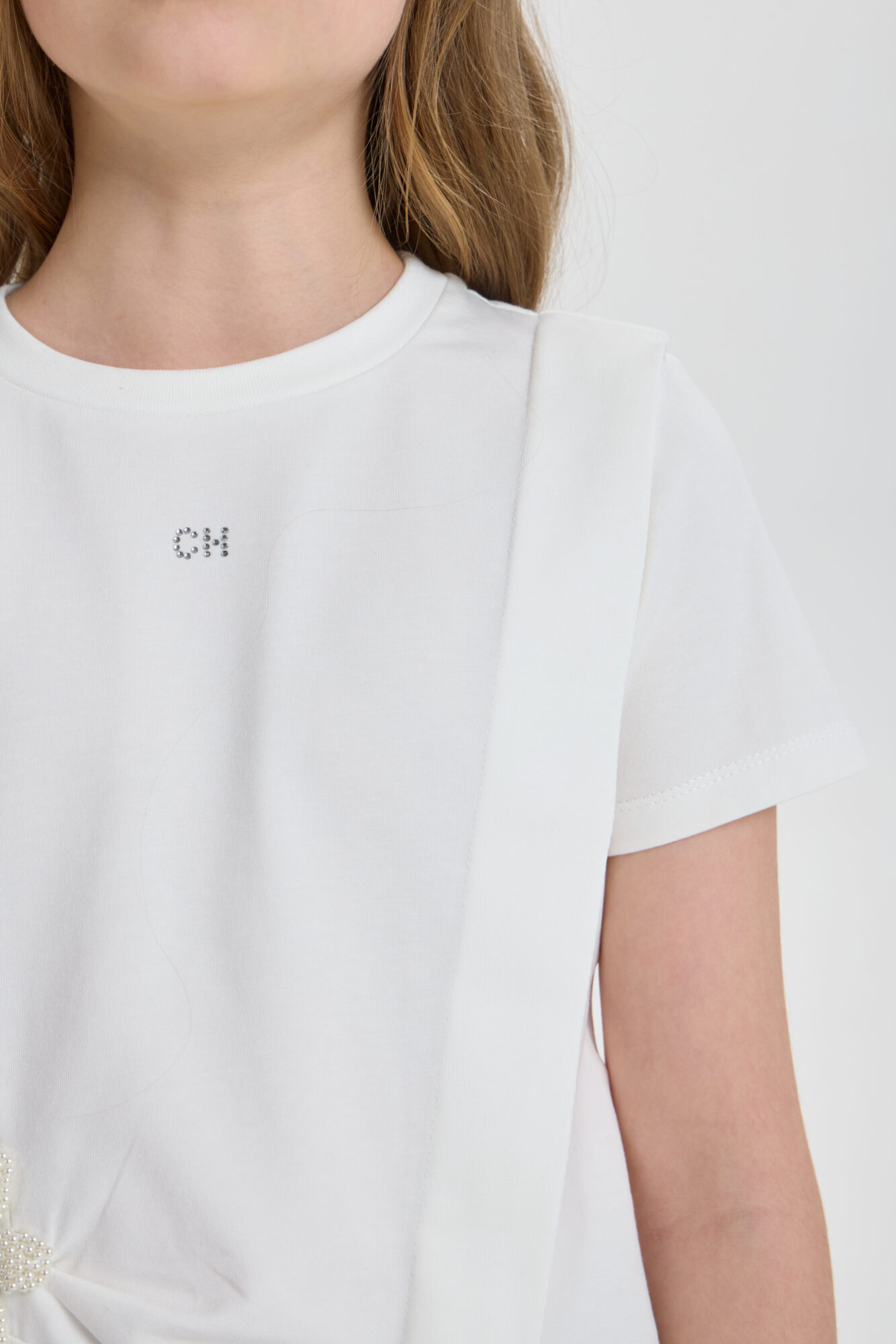Футболка декором для девочки универсальная модель для любого случая. Футболка свободного кроя, рукава короткие, оригинальность изделию придает асимметричный подол и объёмный декор. Модель идеально подходит как ... для ежедневной носки, так и для праздничного события. Прекрасно комбинируется с брюками, джинсами и юбками.