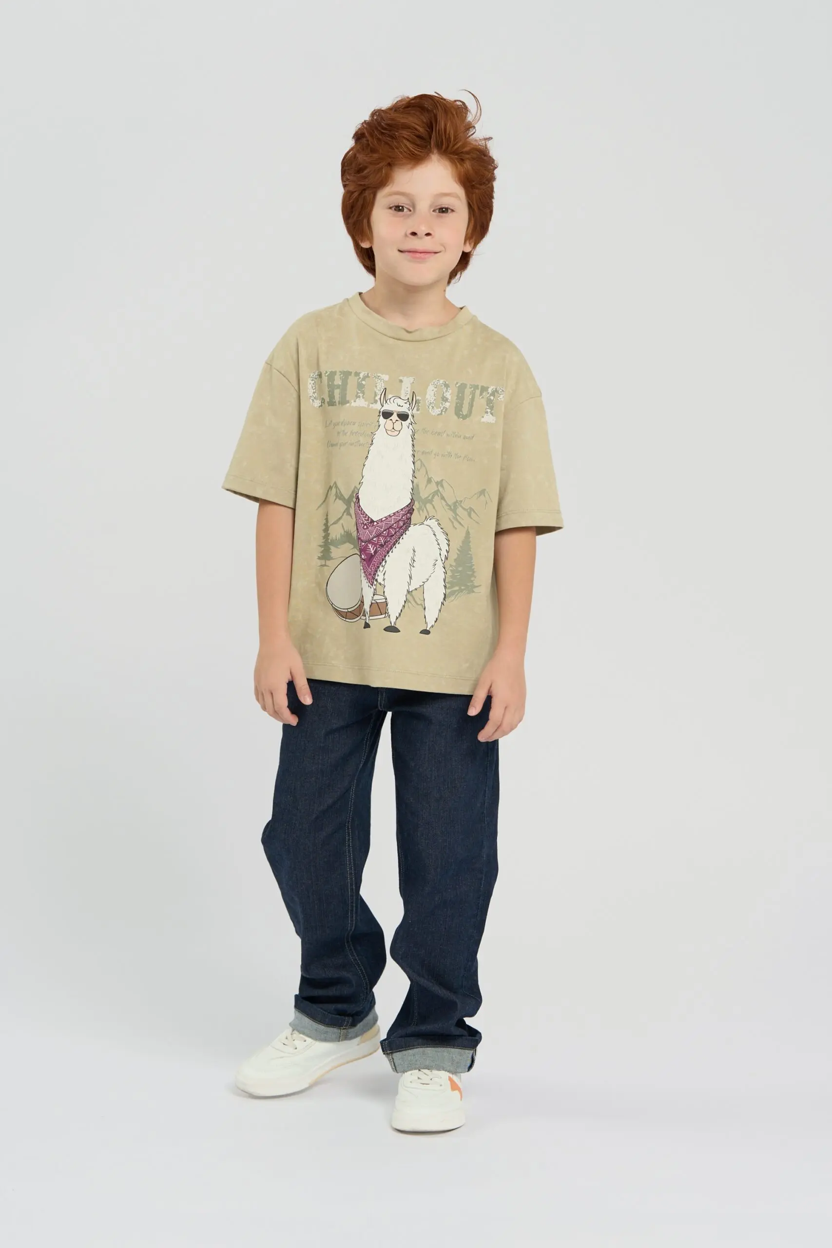 Модная футболка для мальчика выполнена в актуальном дизайне, основу которого составляет сюжетный принт с забавной альпакой в главной роли. Модель выполнена в трендовом цвете хаки. Комфортный ... прямой силуэт дарит свободу и не сковывает движения даже самых активных детей. Натуральный хлопок в составе ткани эффективно регулирует температуру, обеспечивая комфорт для тела.