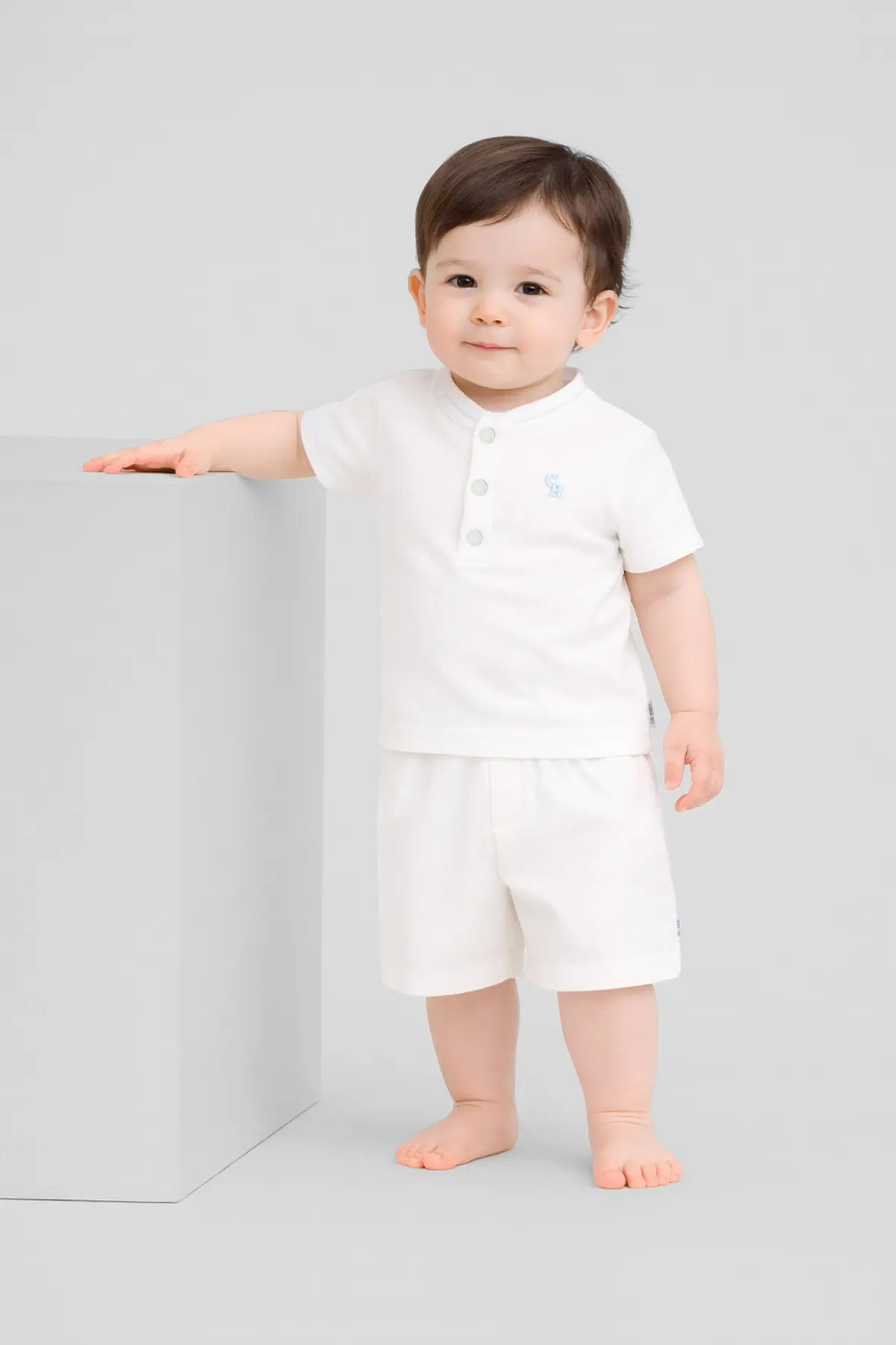 Стильная футболка в светлой цветовой гамме станет практичным и современным элементом гардероба мальчика. Модель свободного силуэта выполнена из мягкого трикотажного полотна, которое приятно к телу и ... обеспечивает комфорт в течение дня. V - обозная горловина с воротником и короткие рукава формируют удобную посадку, а кнопки на плече делают процесс переодевания более простым и быстрым. Такая футболка отлично подойдёт для повседневной носки, прогулок и активного отдыха, легко комбинируясь с различными вещами и помогая создавать стильные образы.