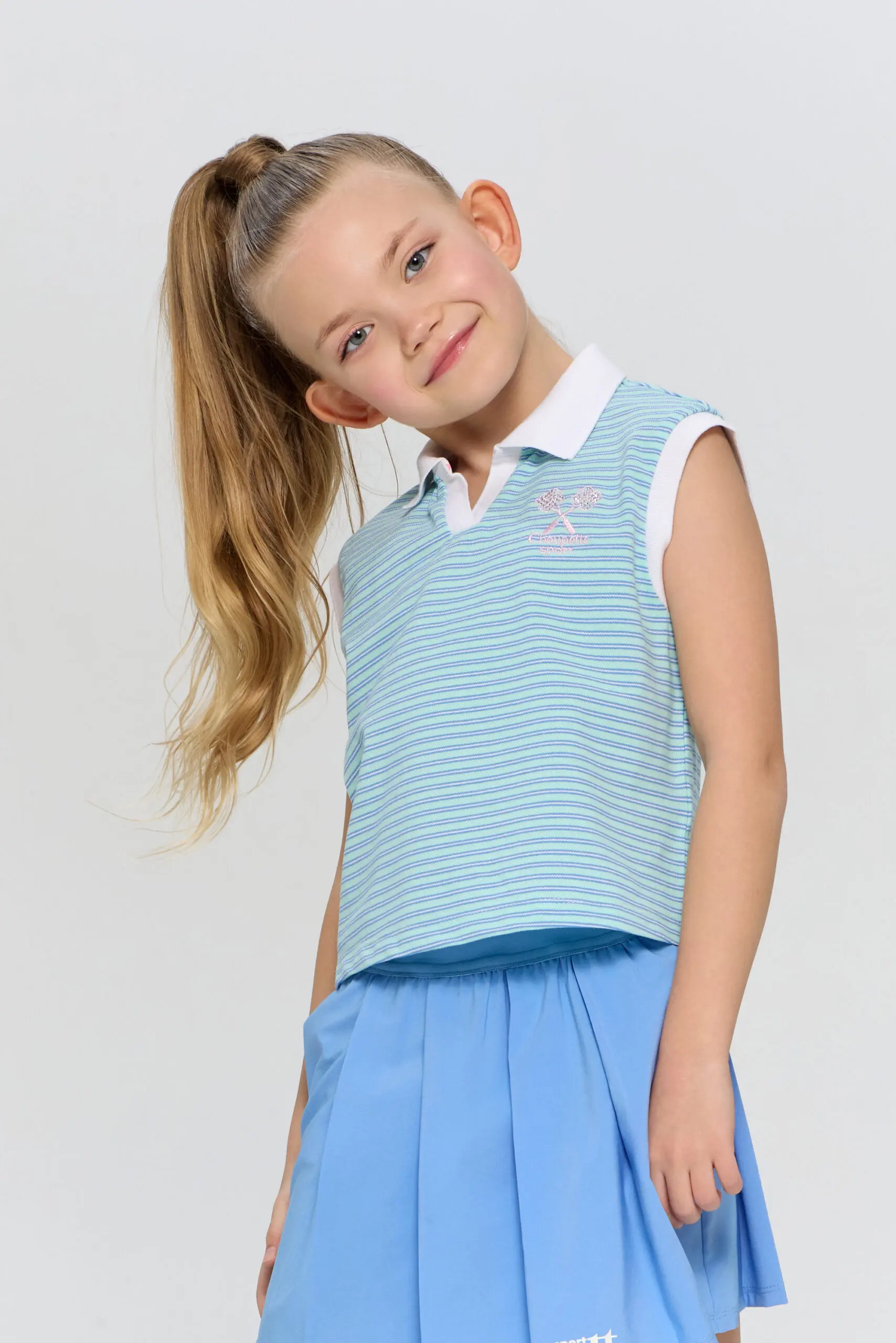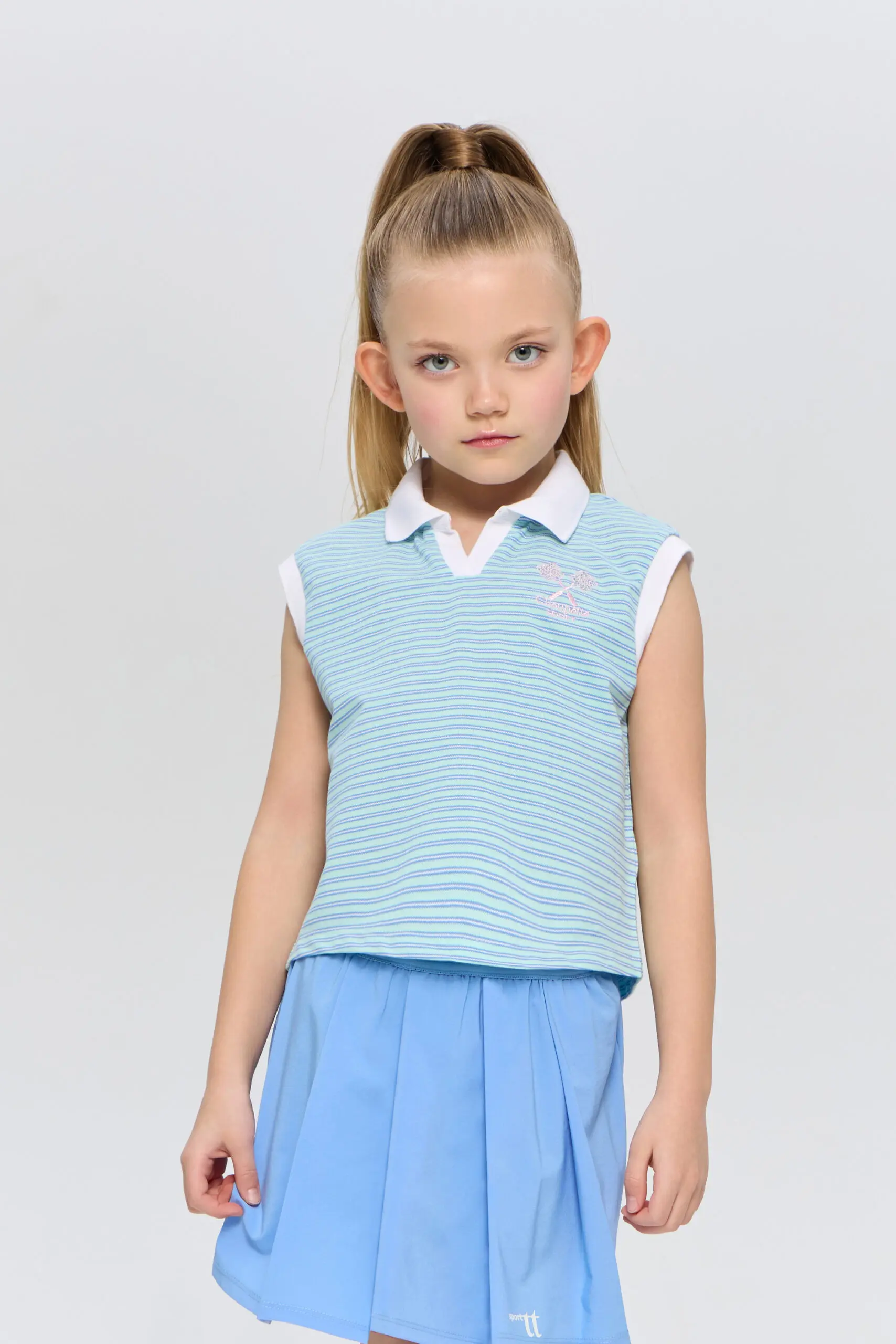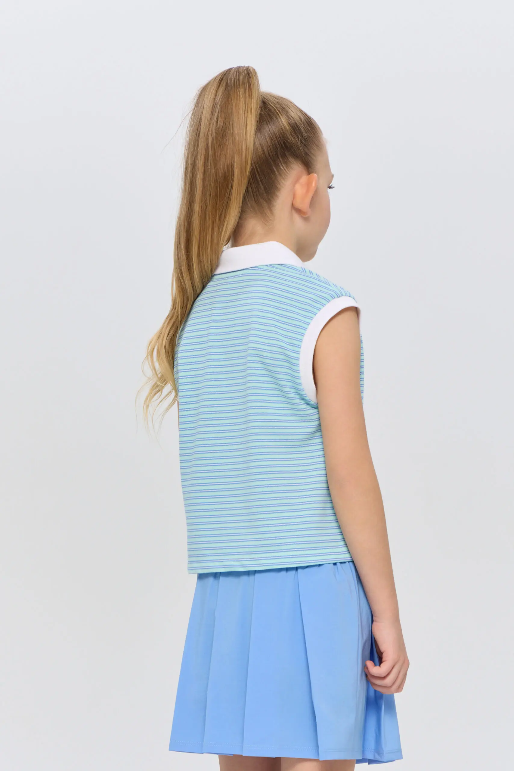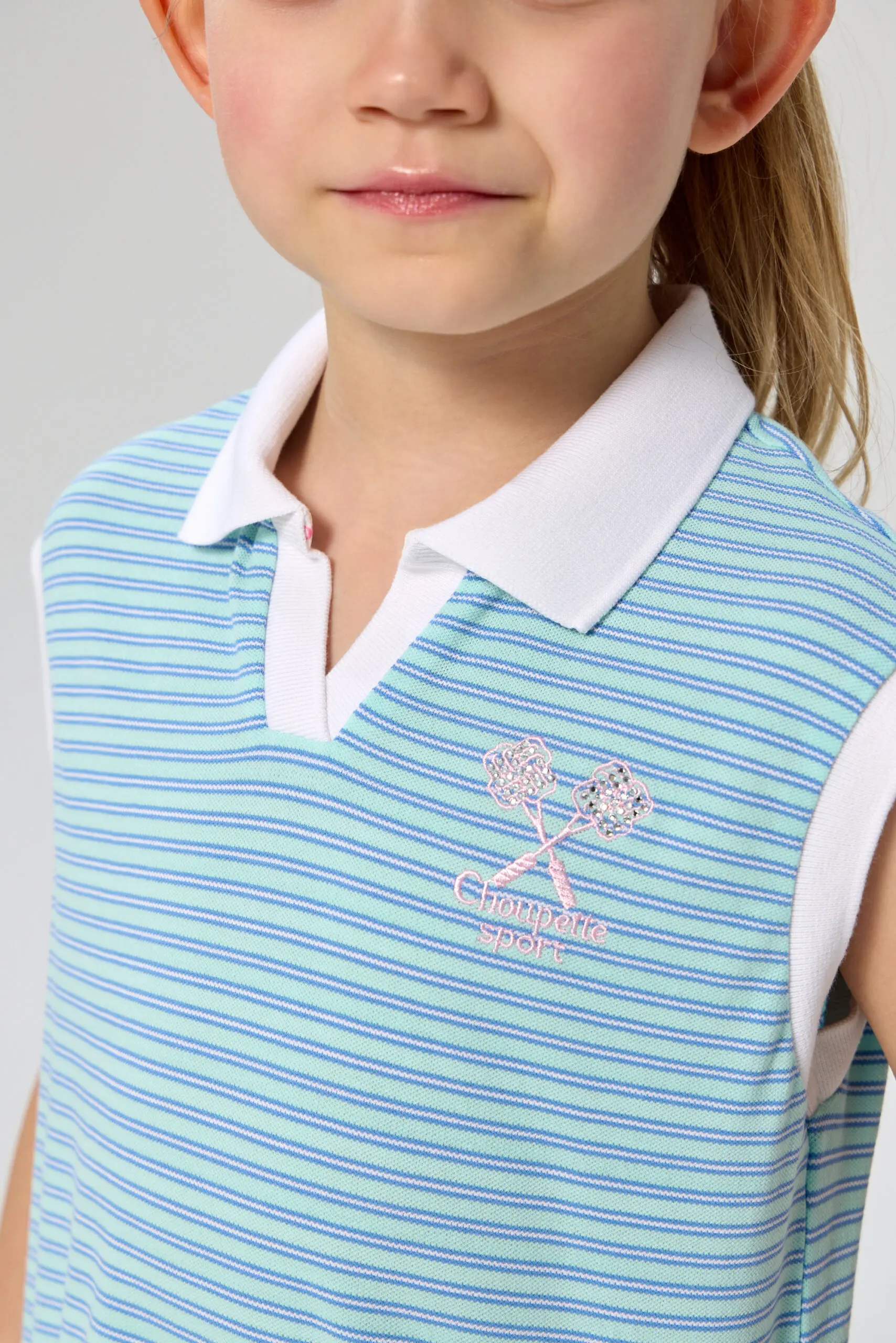 Футболка-поло для девочек без рукавов подходит как для игры в теннис, так и для создания стильных городских комплектов. Это идеальный выбор для активных детей, которые увлекаются ... спортом и ценят комфорт. Модель изготовлена из легкого и дышащего материала на основе хлопка, гарантирующего хорошую циркуляцию воздуха, что особенно важно во время активных игр на корте. Футболка декорирована контрастным воротником-поло и дизайнерской вышивкой в виде ракеток.