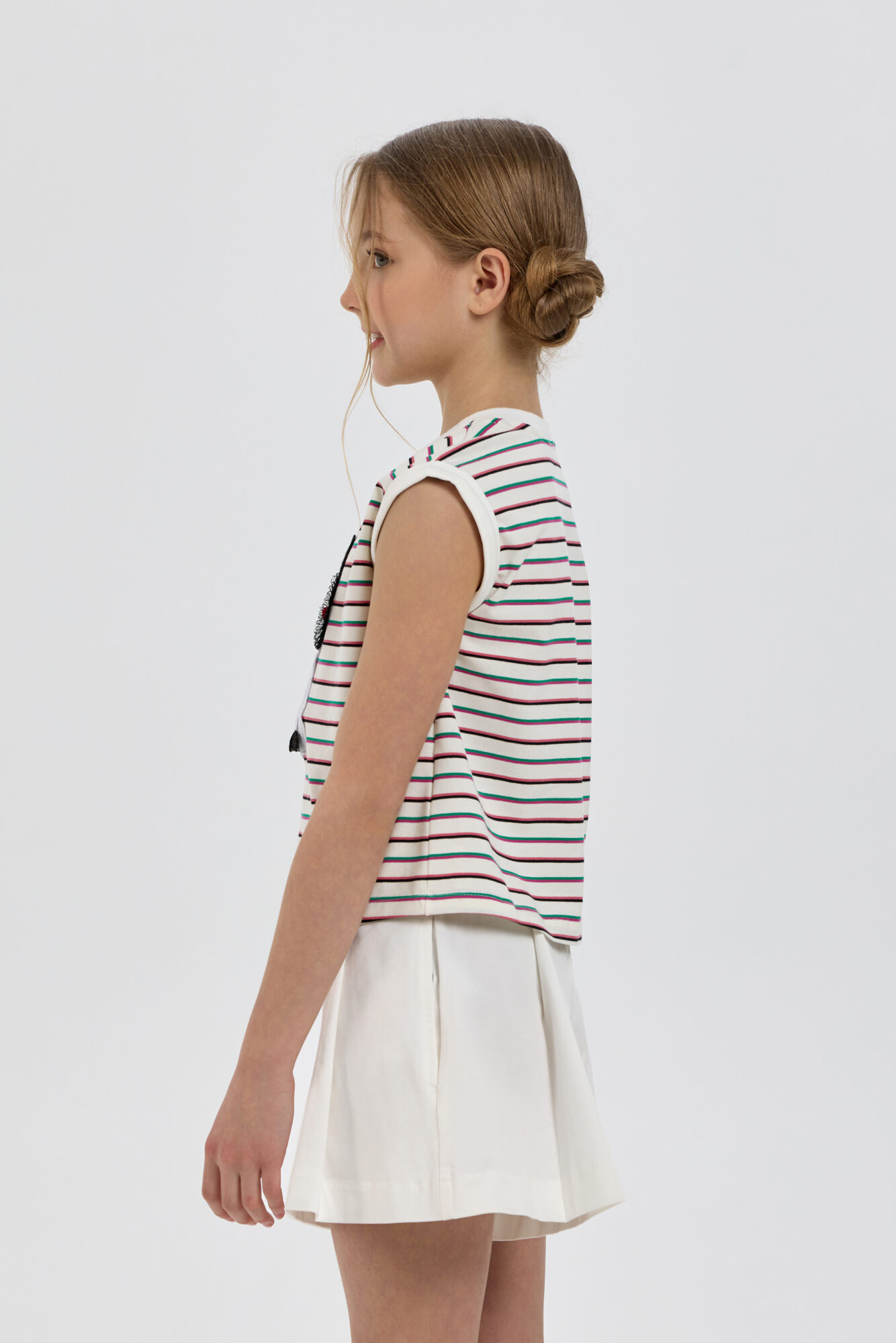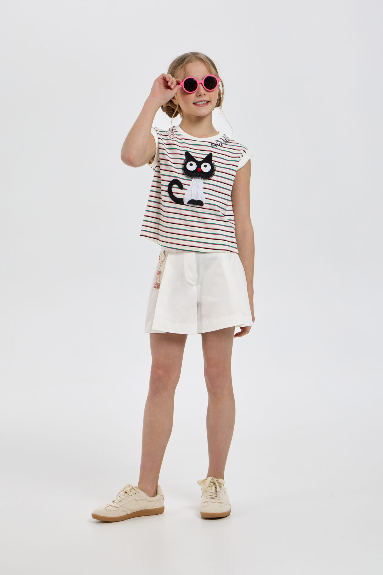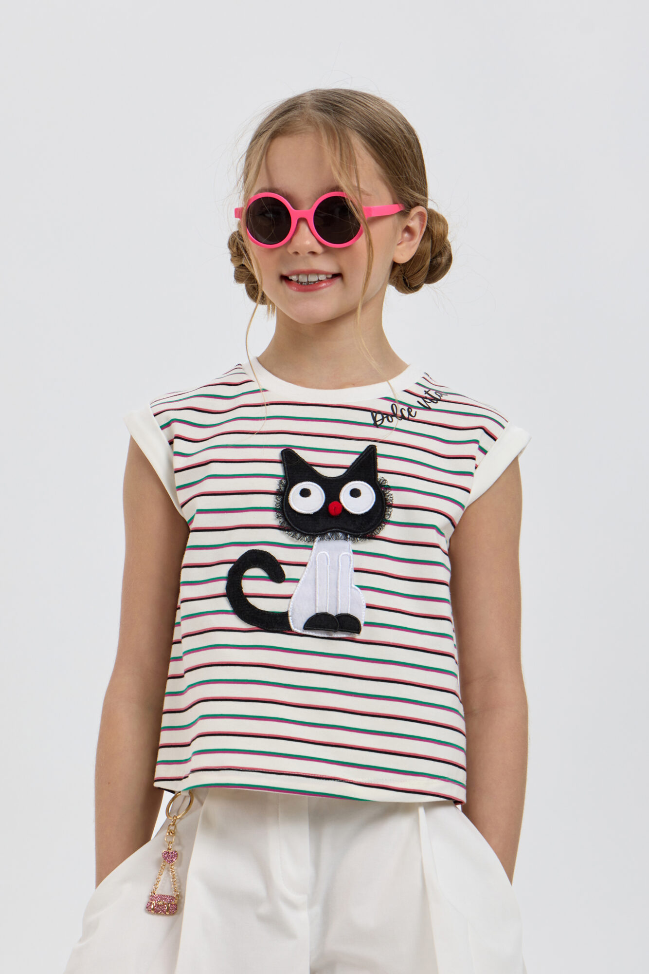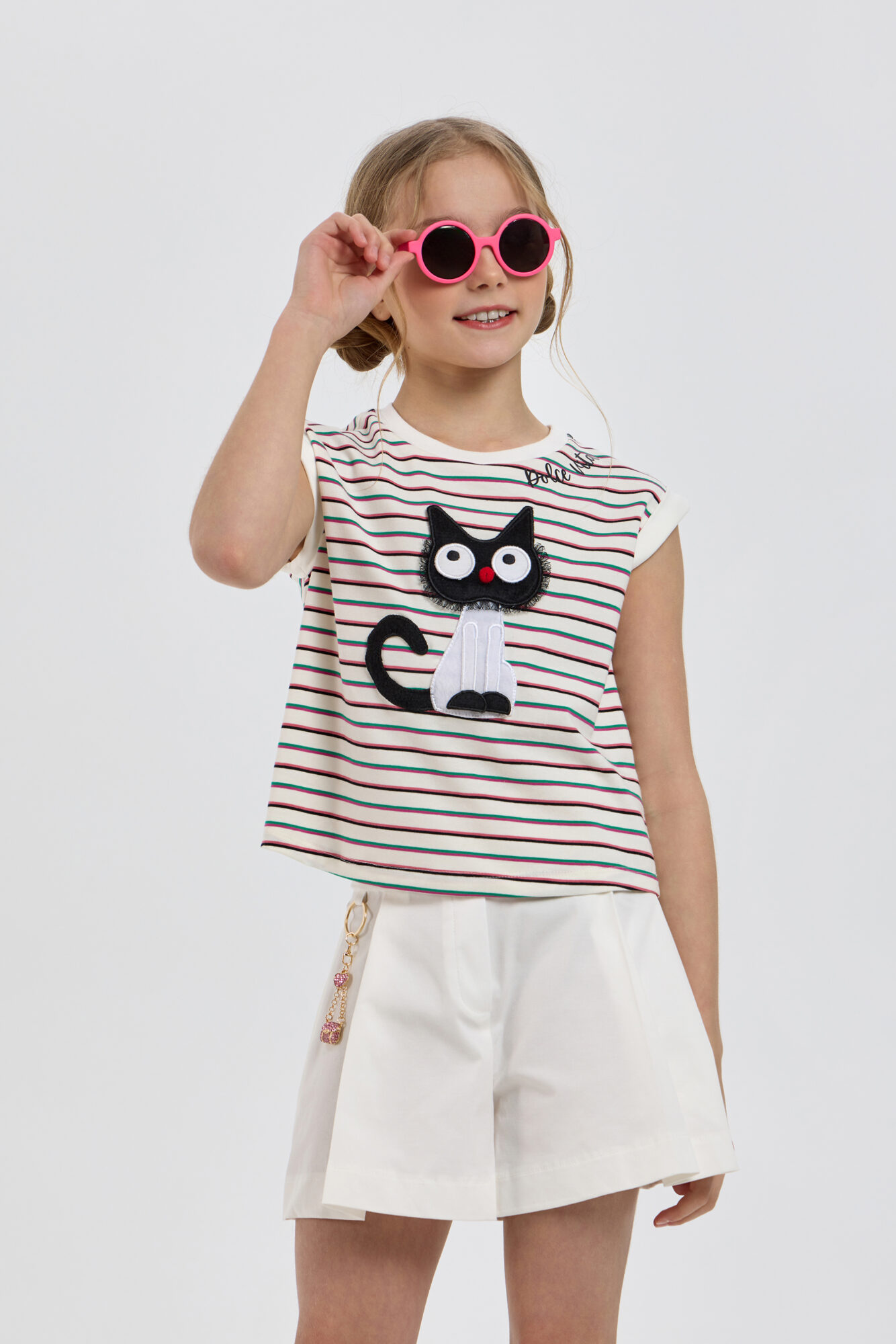 Футболка, украшенная аппликацией, объединяет в себе стиль, удобство и отличное качество. Модель прямого силуэта изготовлена из высококачественной ткани. Круглый вырез горловины и короткие рукава оформлены контрастной ... окантовкой. Модным акцентом служит объемная аппликация очаровательного котенка. Изделие выполнено из хлопка, что гарантирует комфорт и износостойкость. Футболка прекрасно смотрится как с шортами и джинсами, создавая легкий и непринужденный образ, так и с юбками.
