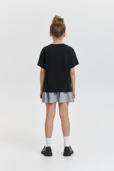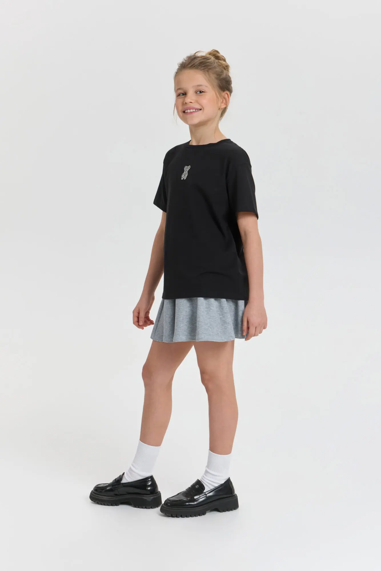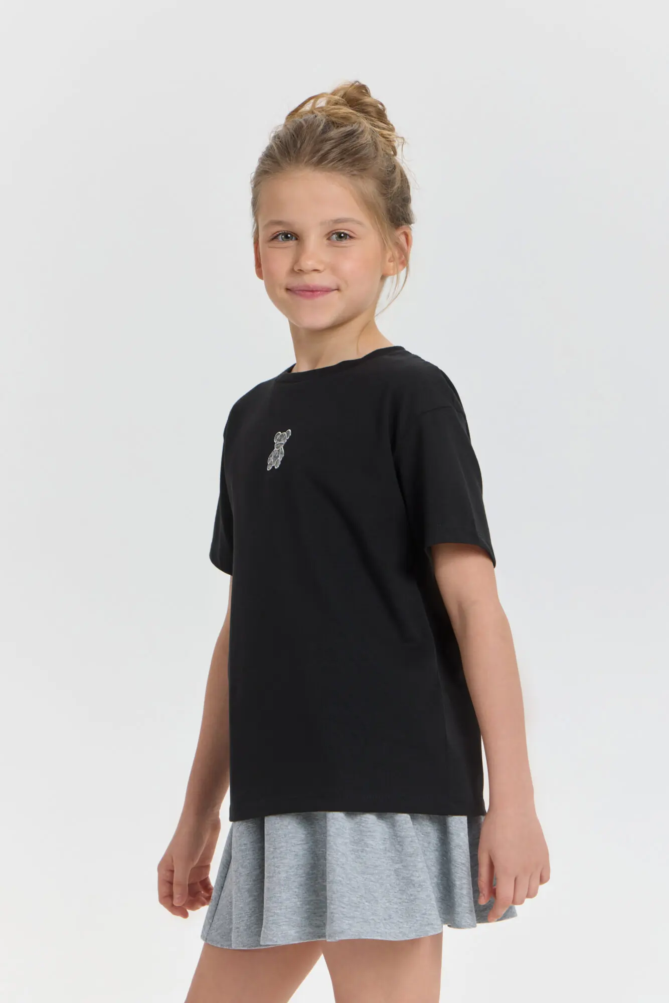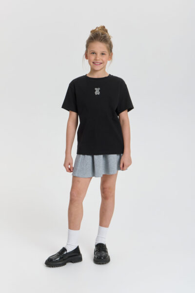 В гардеробе каждой модной девочки обязательно должна быть стильная черная футболка. Эта трендовая модель с оригинальным дизайном и необычным декором поможет создавать эффектные и запоминающиеся луки. ... Изюминка этой футболки – короткие рукава, украшенные сеткой со стразами, которые делают ее неповторимой и привлекательной. Футболка отлично сочетается как с элегантными юбками и брюками, так и с повседневными джинсами.
