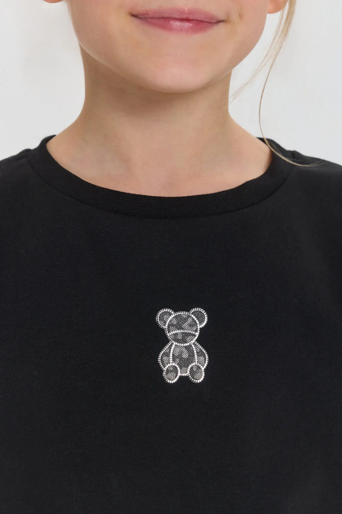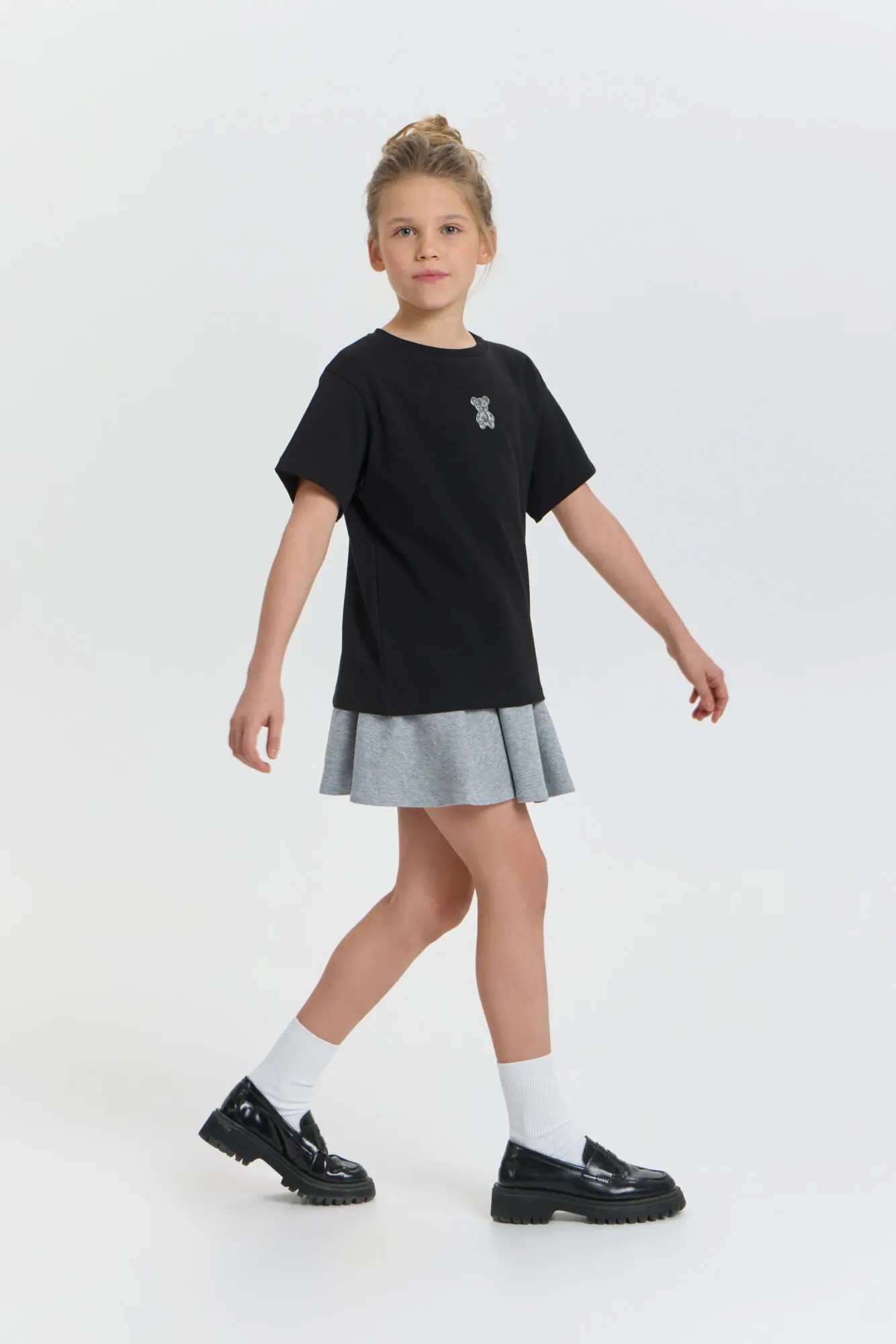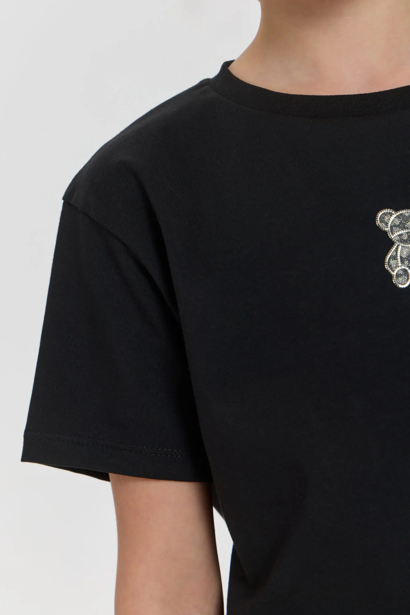 В гардеробе каждой модной девочки обязательно должна быть стильная черная футболка. Эта трендовая модель с оригинальным дизайном и необычным декором поможет создавать эффектные и запоминающиеся луки. ... Изюминка этой футболки – короткие рукава, украшенные сеткой со стразами, которые делают ее неповторимой и привлекательной. Футболка отлично сочетается как с элегантными юбками и брюками, так и с повседневными джинсами.