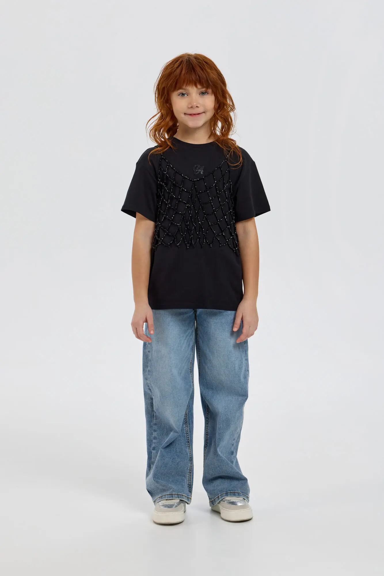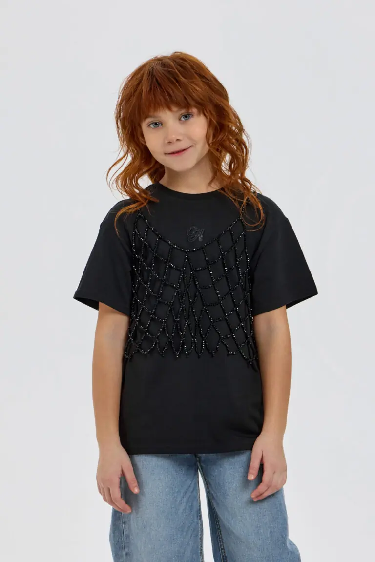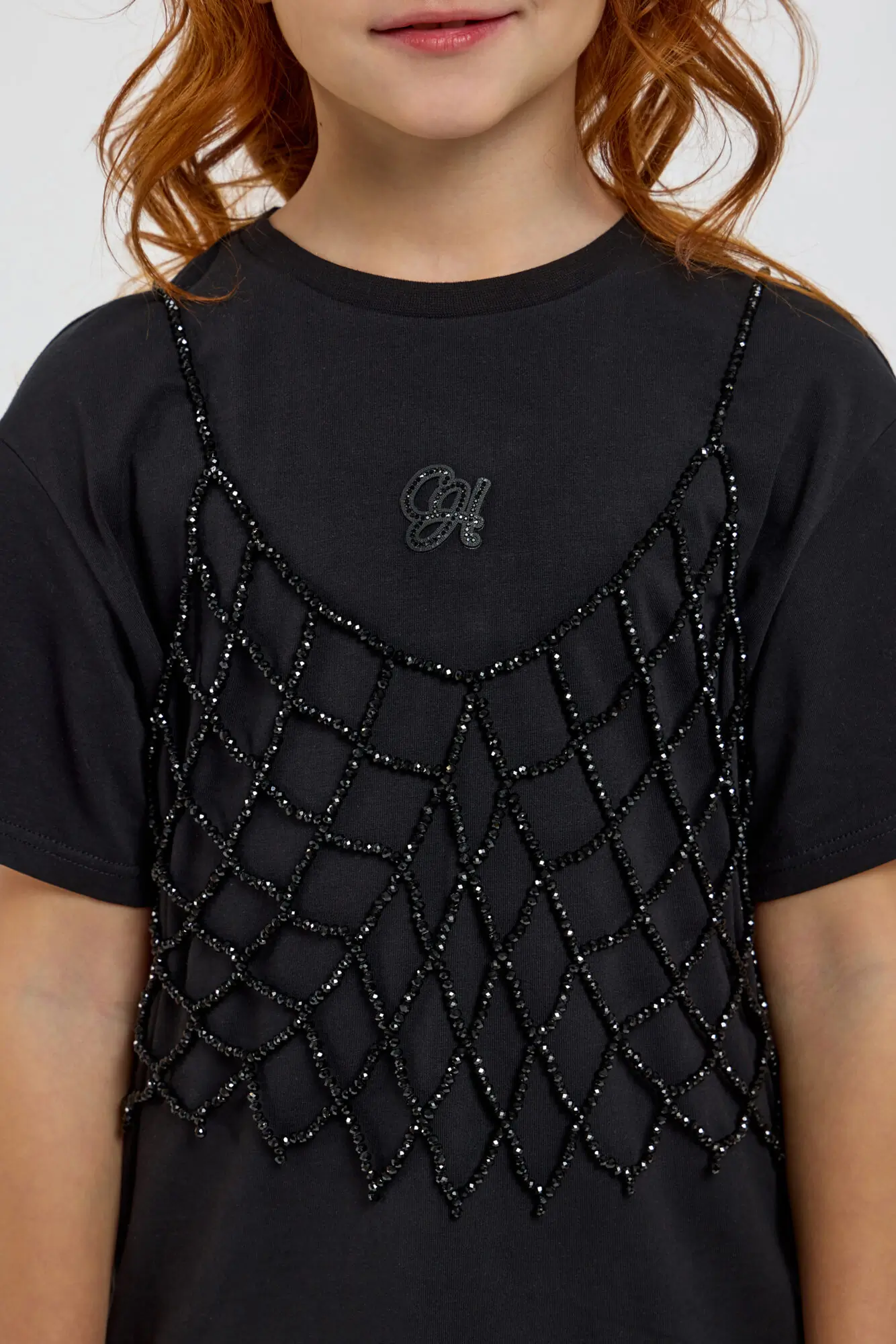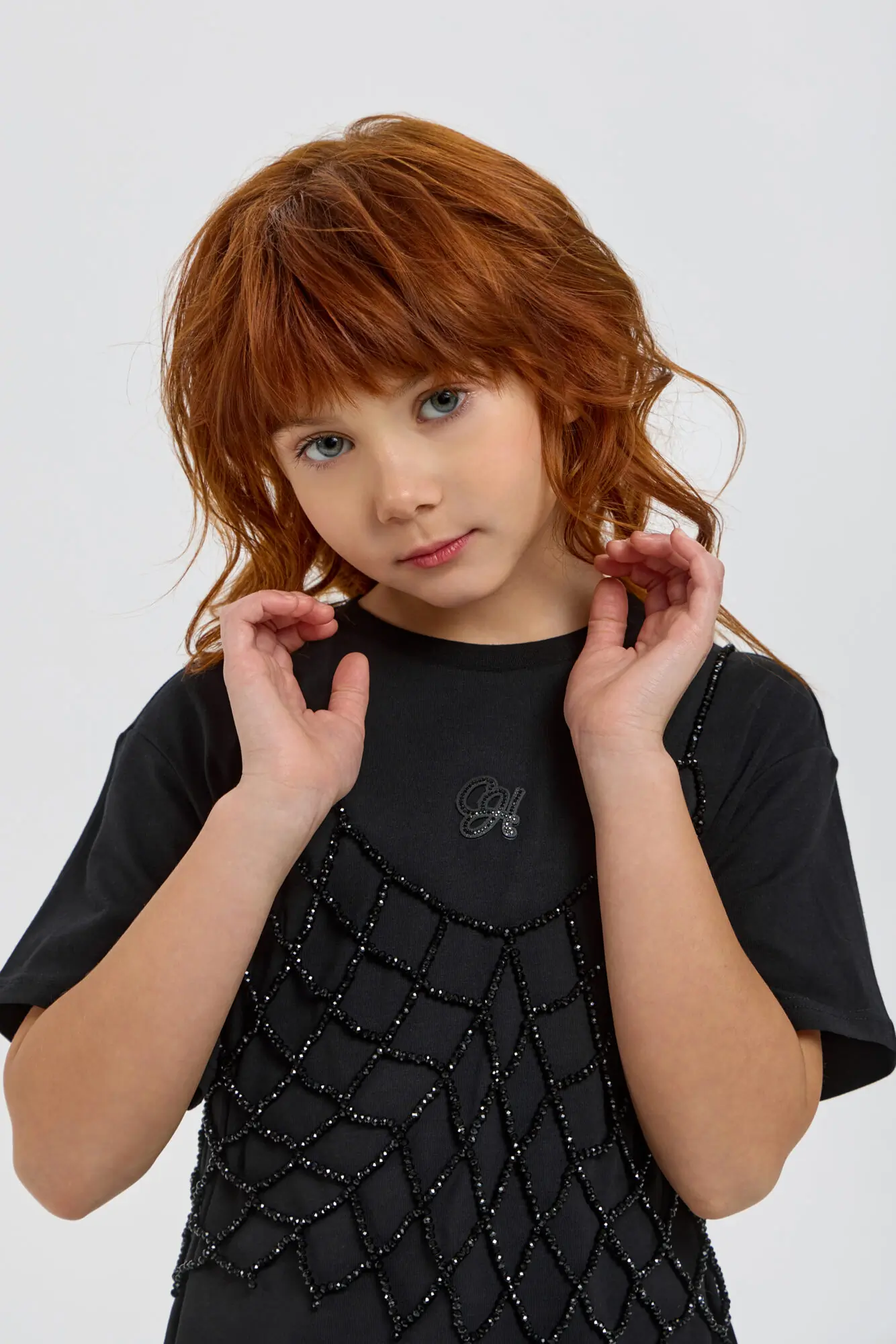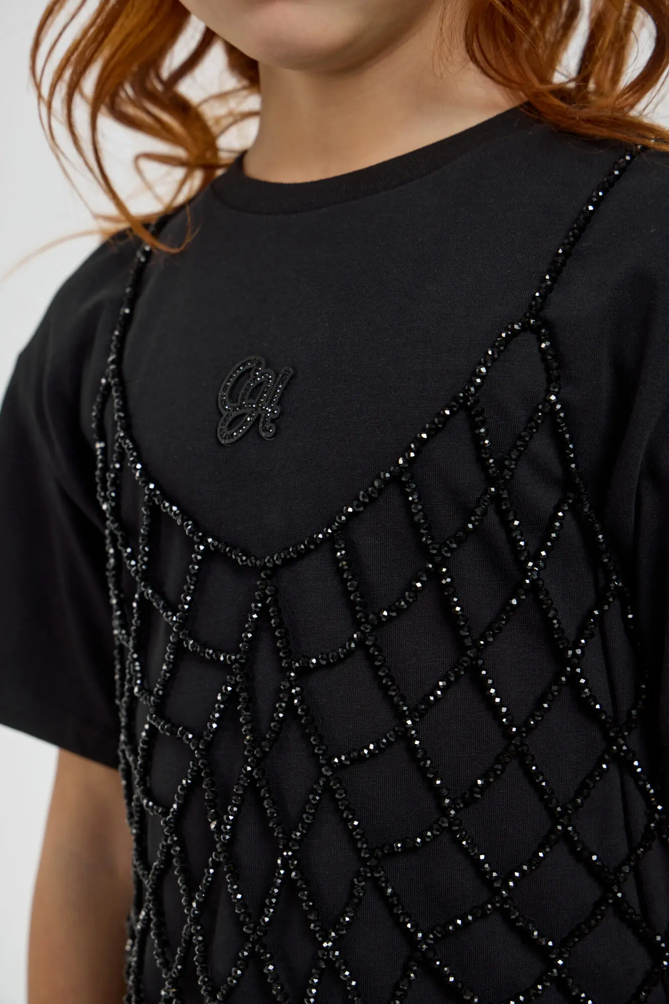 Несомненным фаворитом в гардеробе юной модницы станет черная дизайнерская футболка, дополненная майкой с бисерной отделкой! Свободный крой и рукава 3/4 делают эту футболку удобной и модной ... – идеальный выбор для тех, кто ценит комфорт. Дизайнеская майка, украшенная бисером, придает комплекту ультрамодный вид. В таком наряде можно смело пойти на встречу с друзьями или посетить любое торжество.