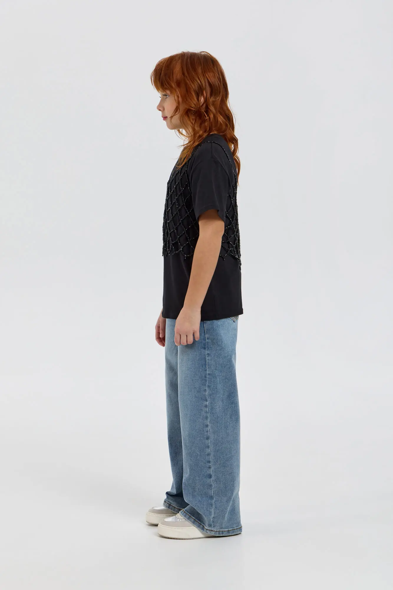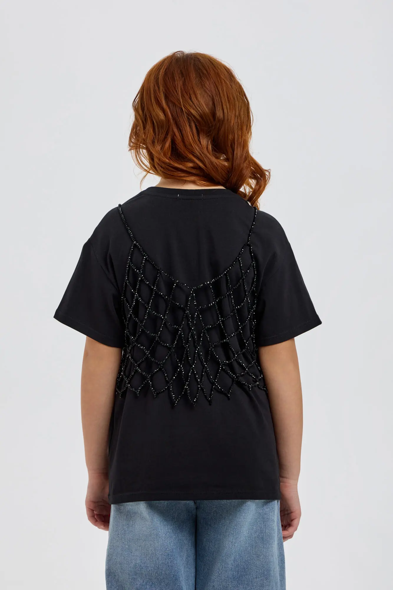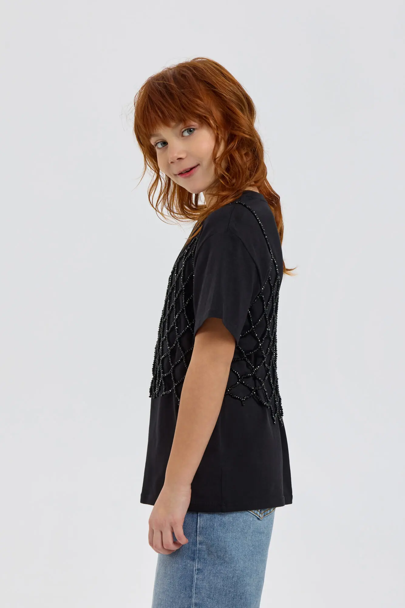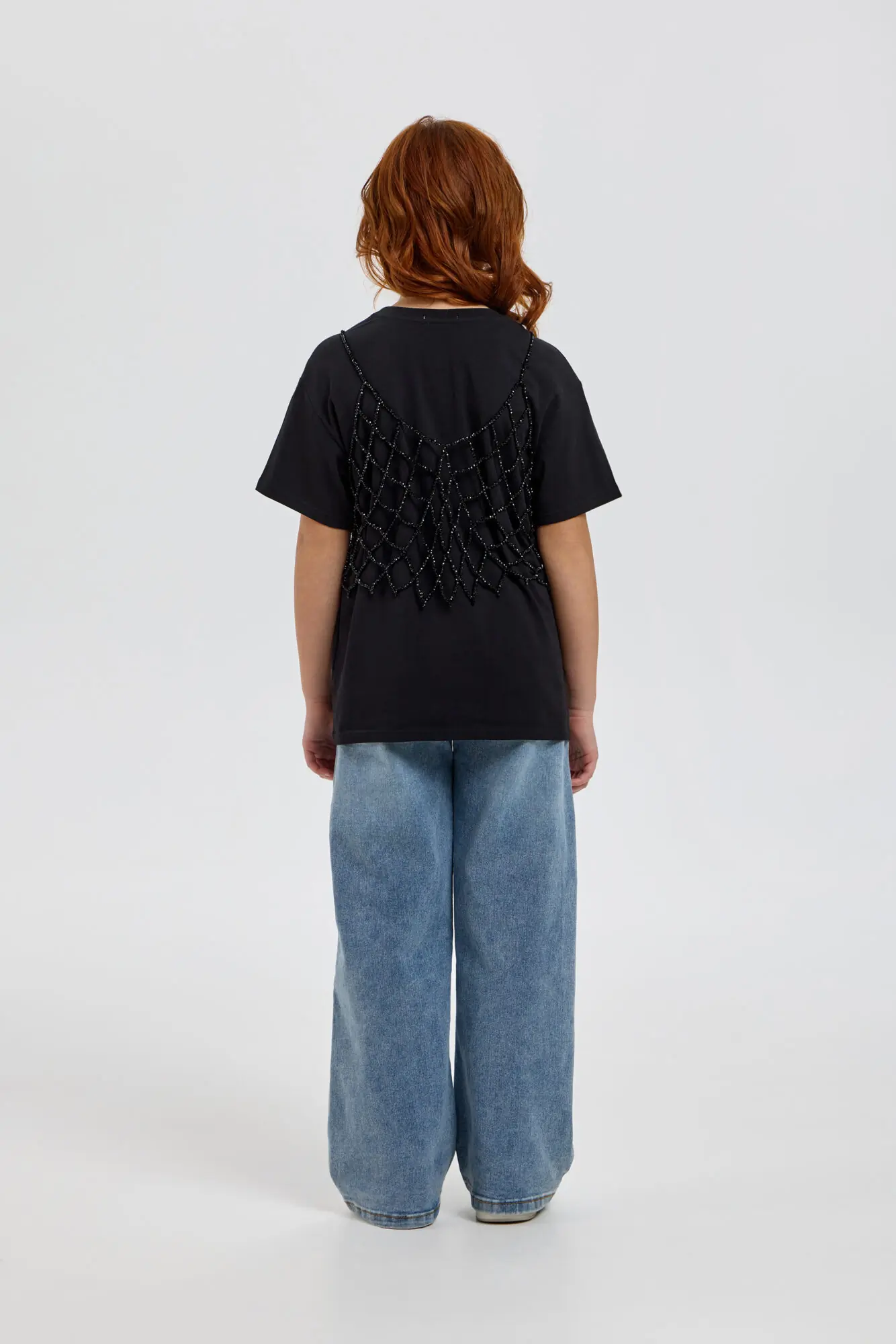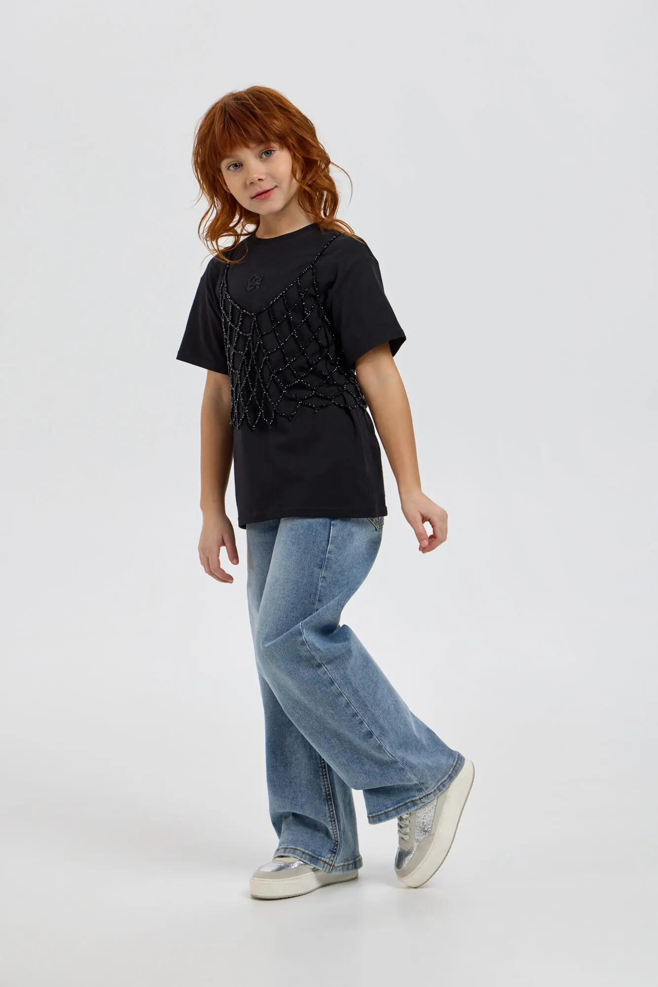 Несомненным фаворитом в гардеробе юной модницы станет черная дизайнерская футболка, дополненная майкой с бисерной отделкой! Свободный крой и рукава 3/4 делают эту футболку удобной и модной ... – идеальный выбор для тех, кто ценит комфорт. Дизайнеская майка, украшенная бисером, придает комплекту ультрамодный вид. В таком наряде можно смело пойти на встречу с друзьями или посетить любое торжество.
