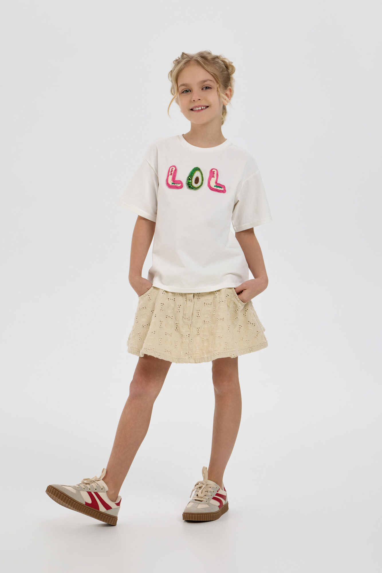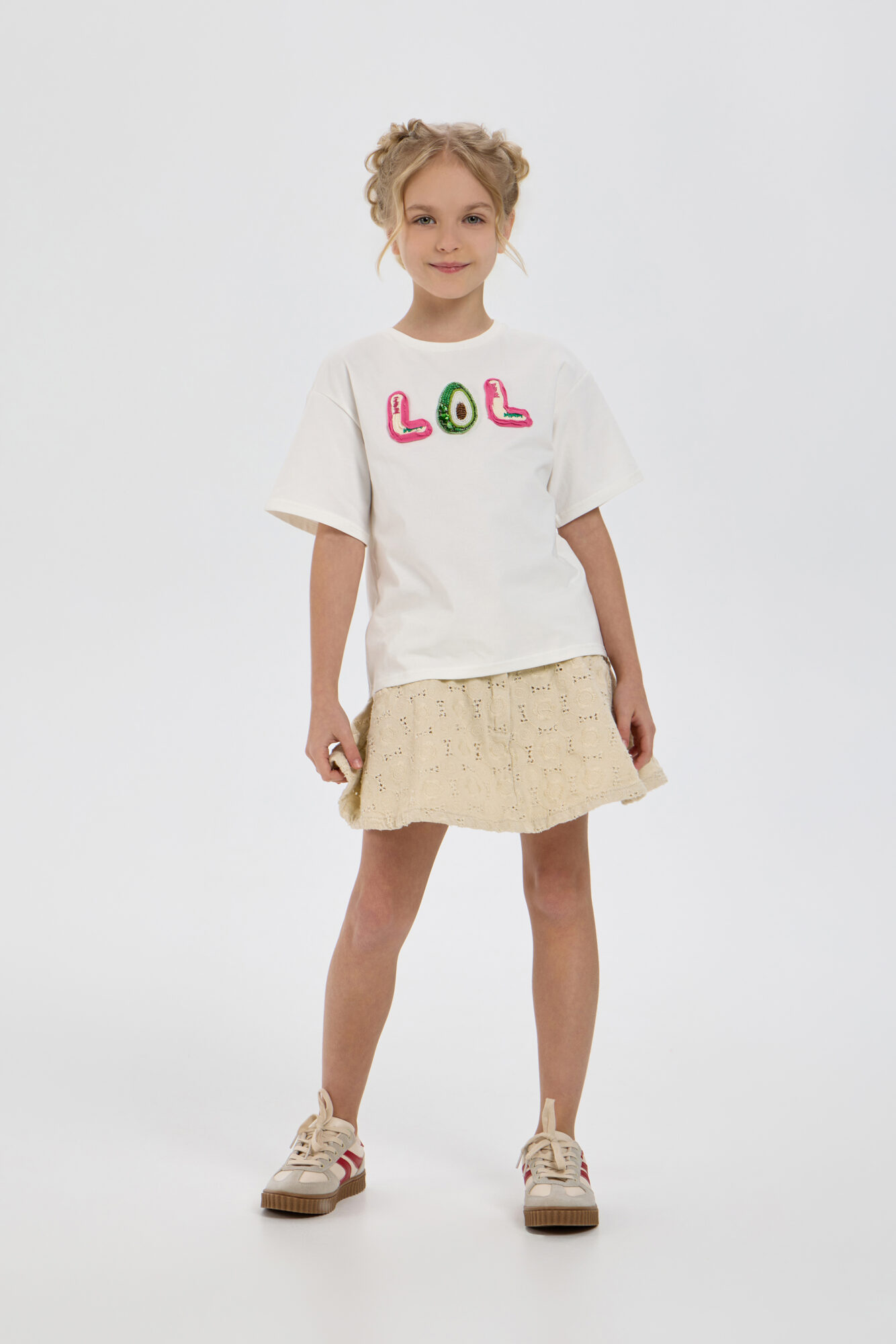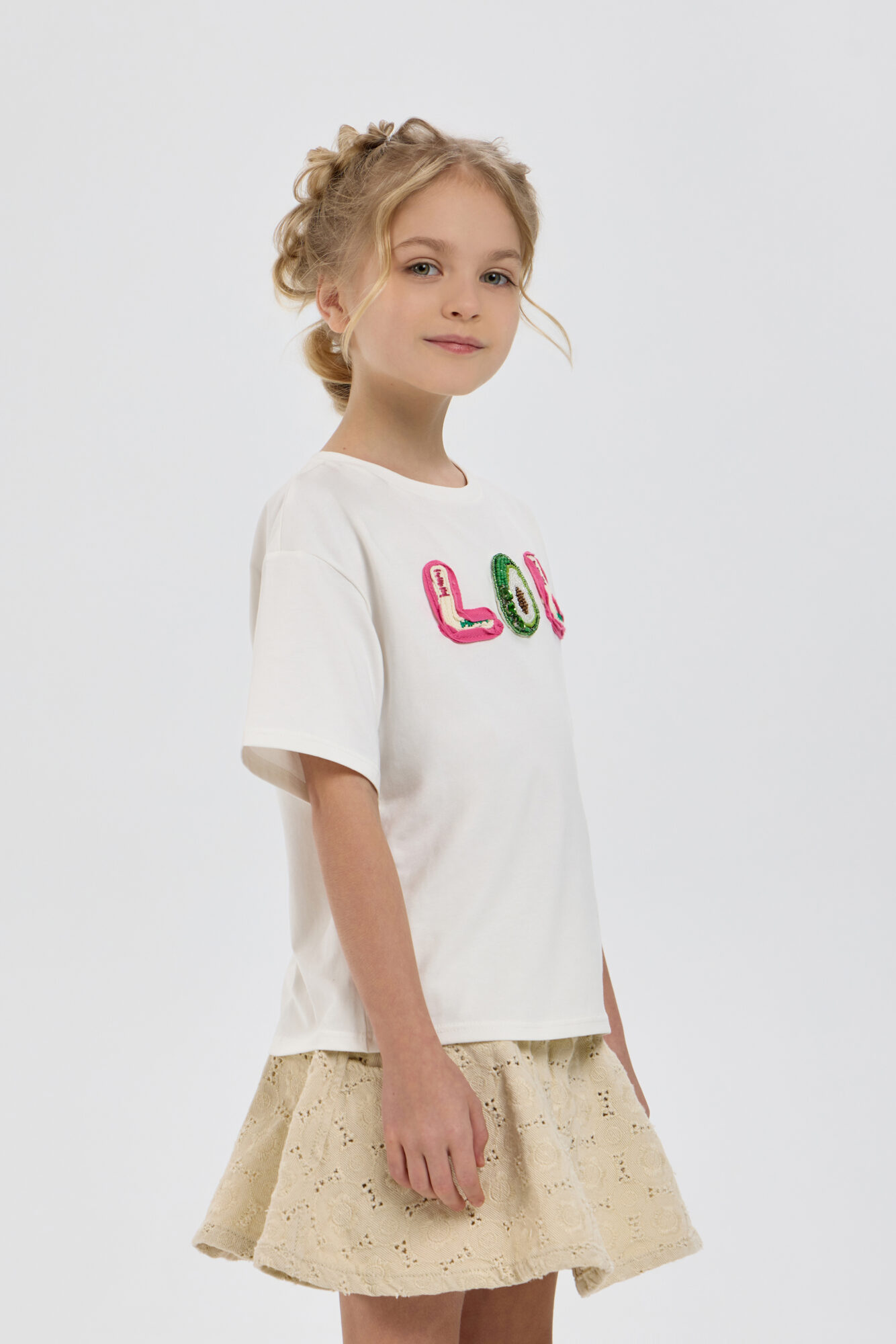 Современные модные тенденции ставят в приоритет хлопковые футболки с уникальным оформлением. Такая одежда становится идеальным выбором для весенне-летнего сезона. Представленная модель для девочки выполнена из высококачественного ... воздухопроницаемого материала приятного белого цвета, а объемный принт добавляет образу выразительности. Этот элемент базового гардероба позволяет без труда создать стильный и запоминающийся комплект.