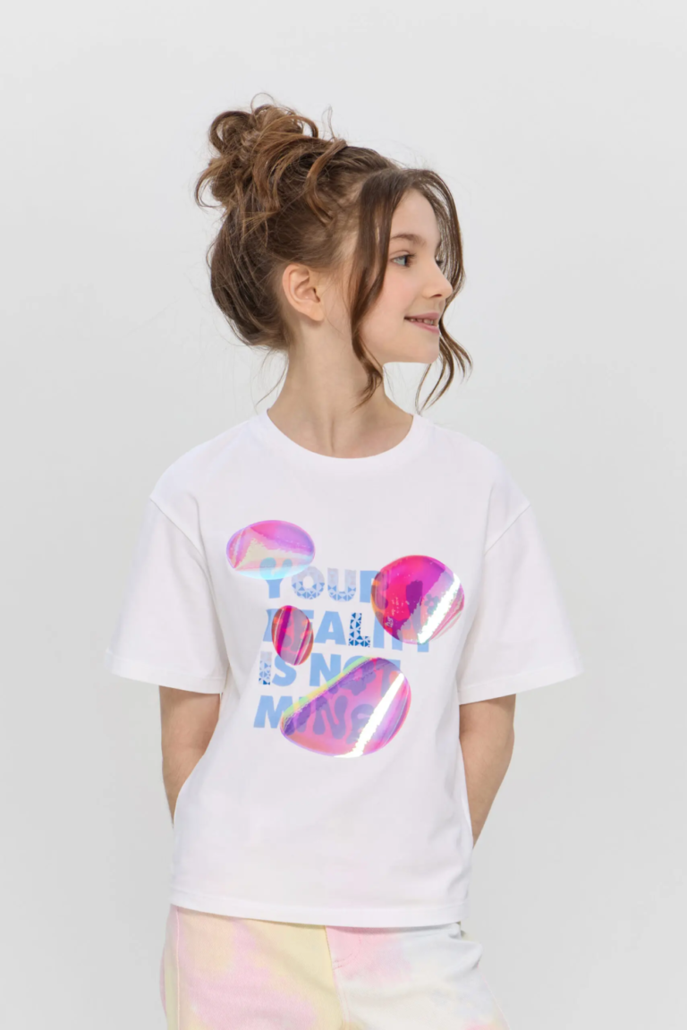 Футболка с принтом для девочки станет прекрасным дополнением к гардеробу юной модницы. Футболка изготовлена из мягкого и дышащего хлопкового материала. Модель полуприлегающего силуэта, линия плеча слегка ... занижена. Футболка имеет яркий принт, который добавляет индивидуальности и делает одежду более привлекательной для ребенка.