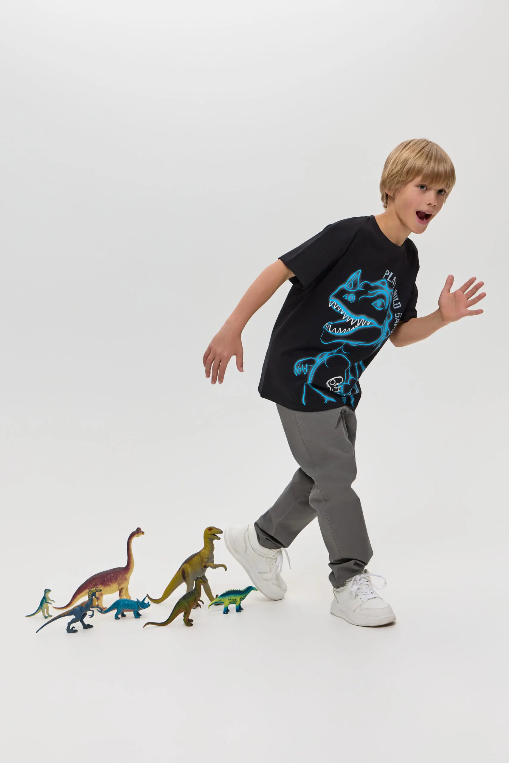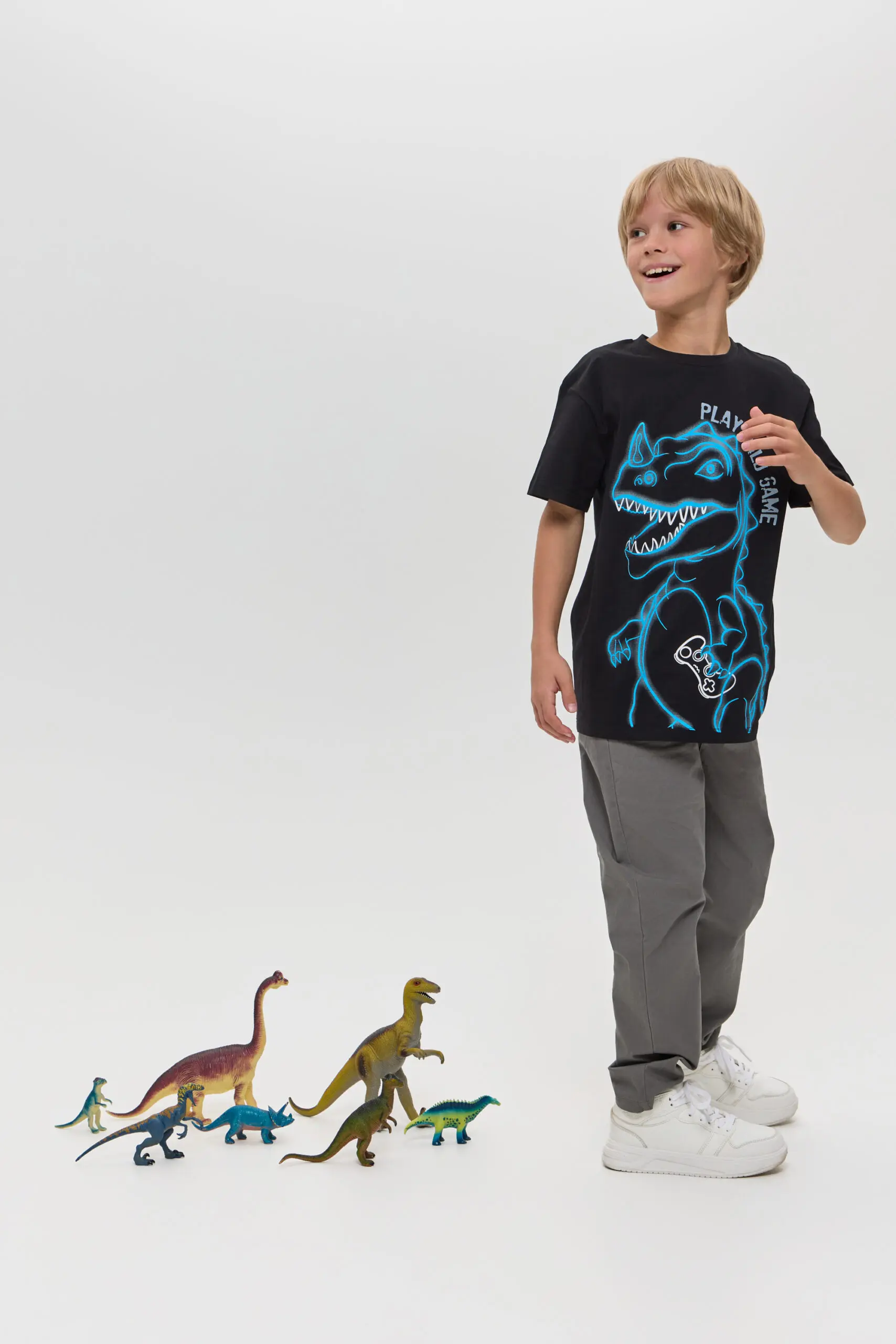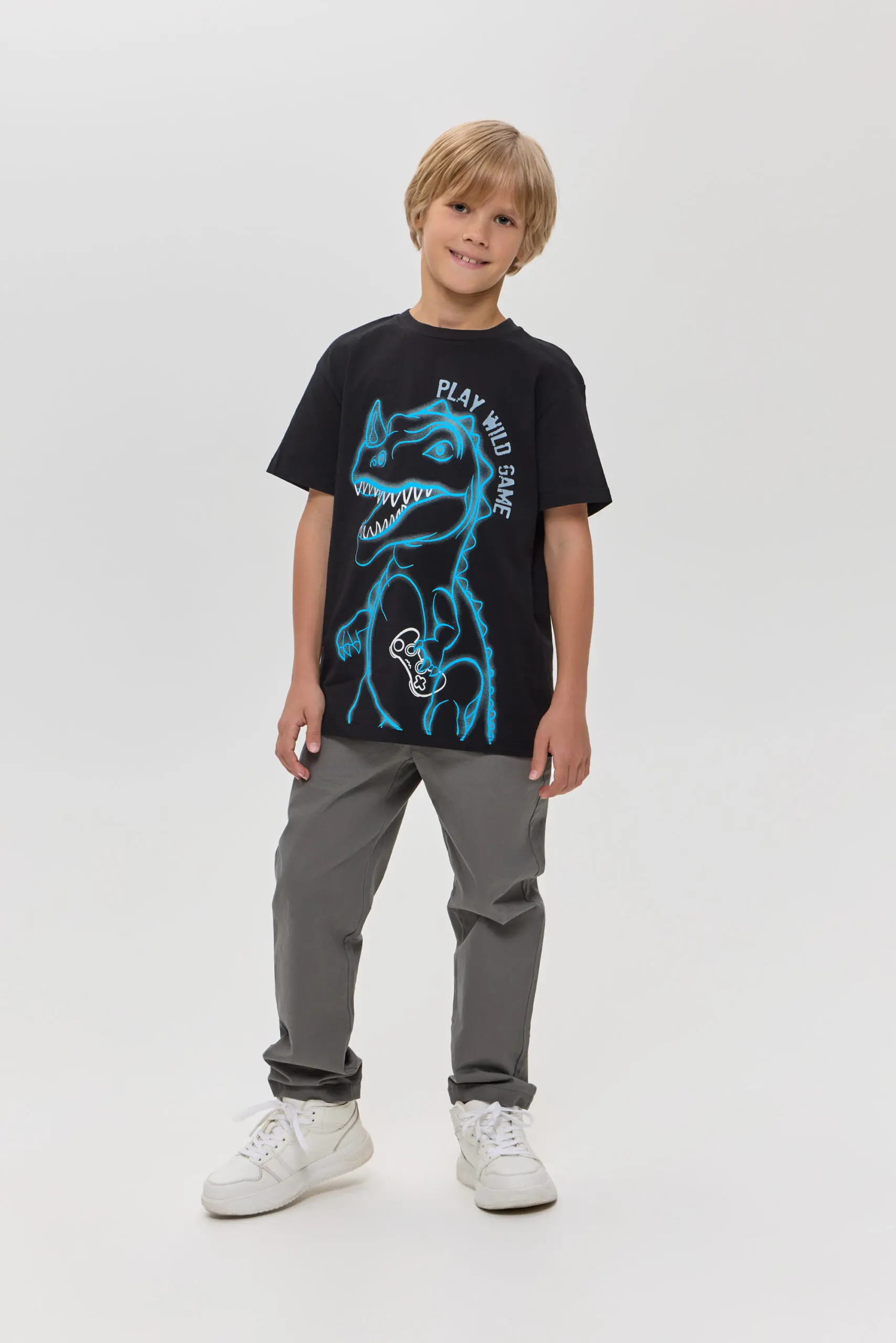 Детская футболка черного цвета с принтом в виде динозавра станет настоящим хитом в гардеробе вашего ребенка! Модель изготовлена из мягкого и приятного на ощупь материала. Футболка ... имеет классический крой с короткими рукавами, что делает её удобной для повседневной носки. Яркий принт динозавра на груди привлечет внимание и порадует маленьких любителей этих древних животных.