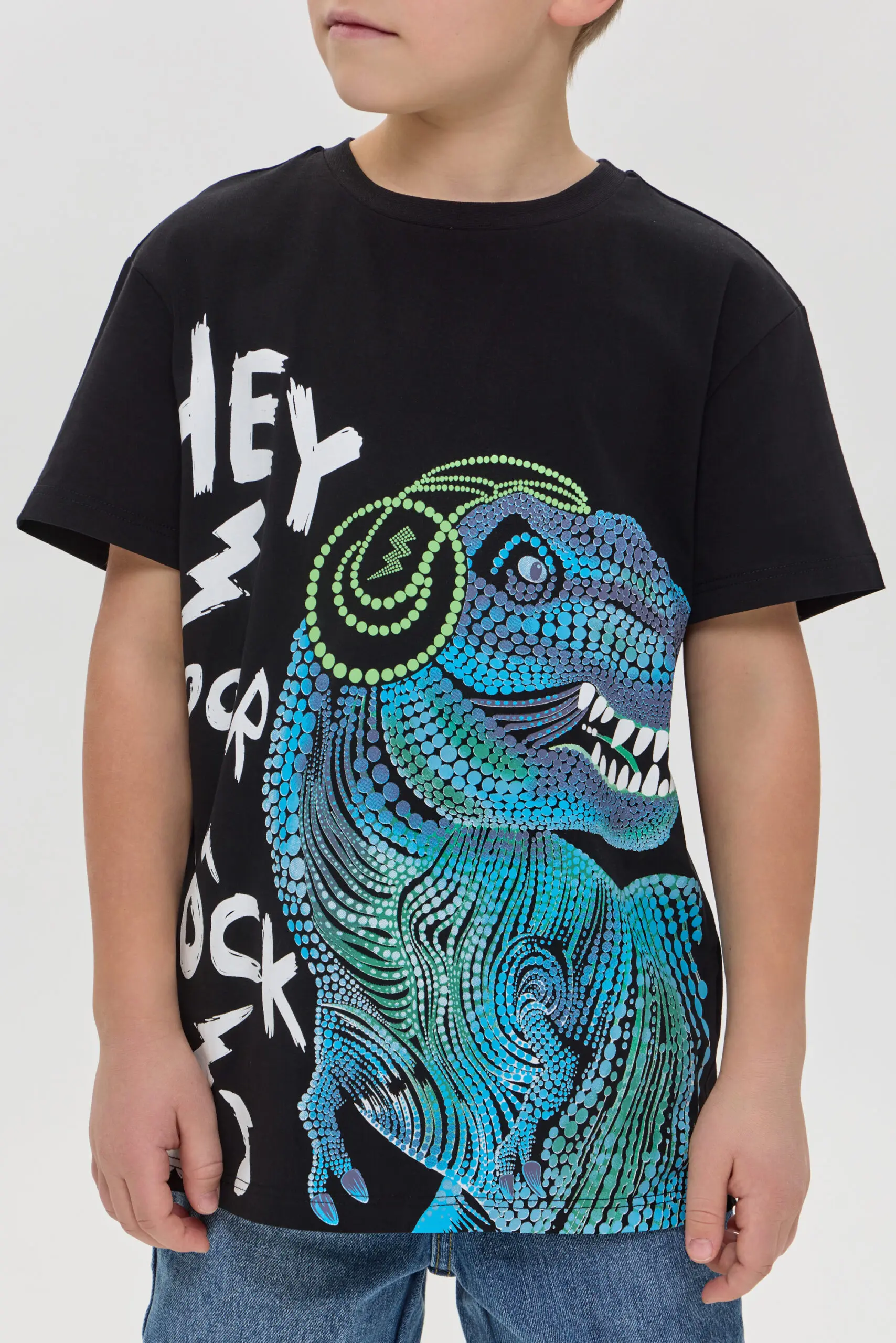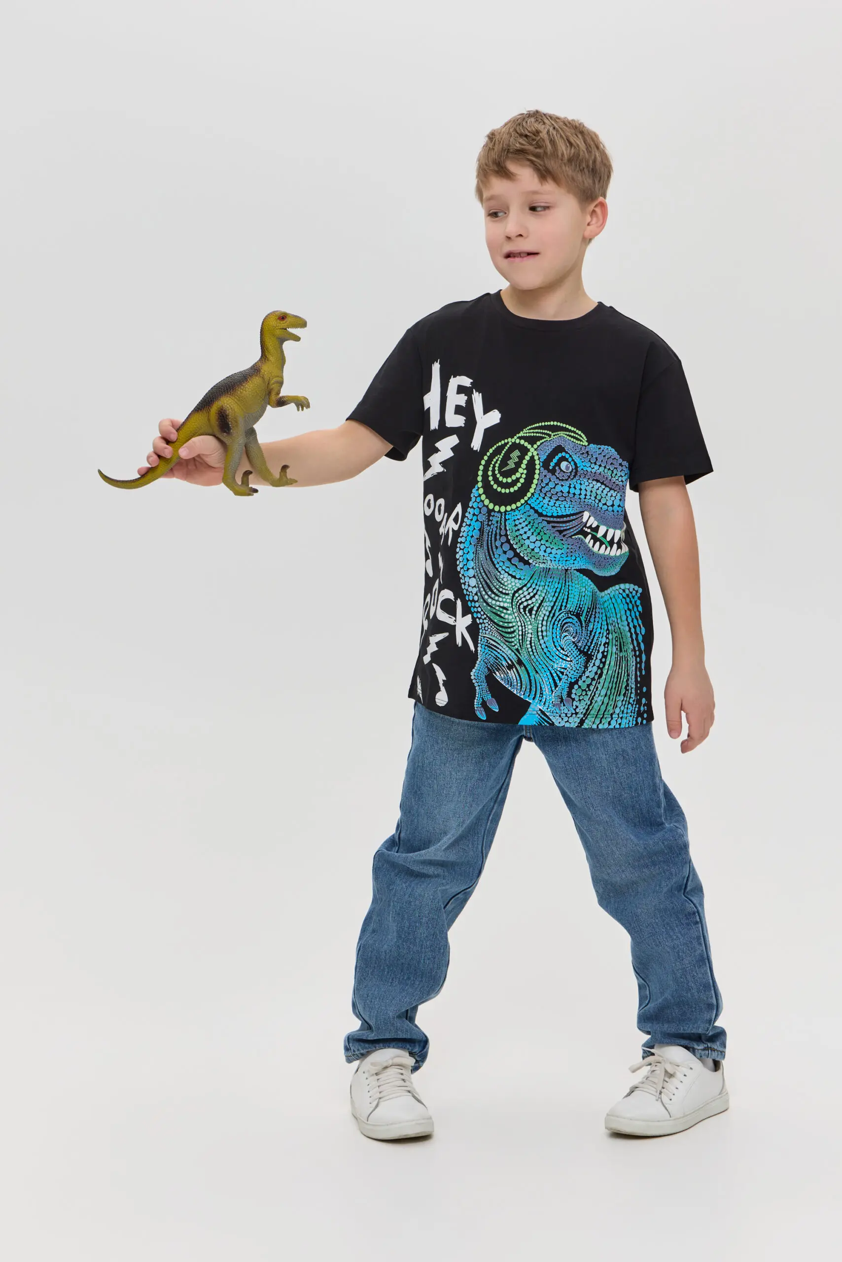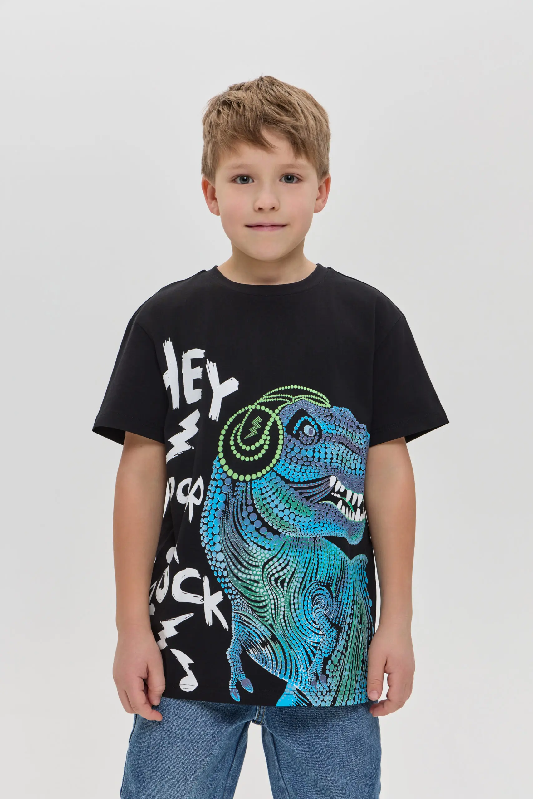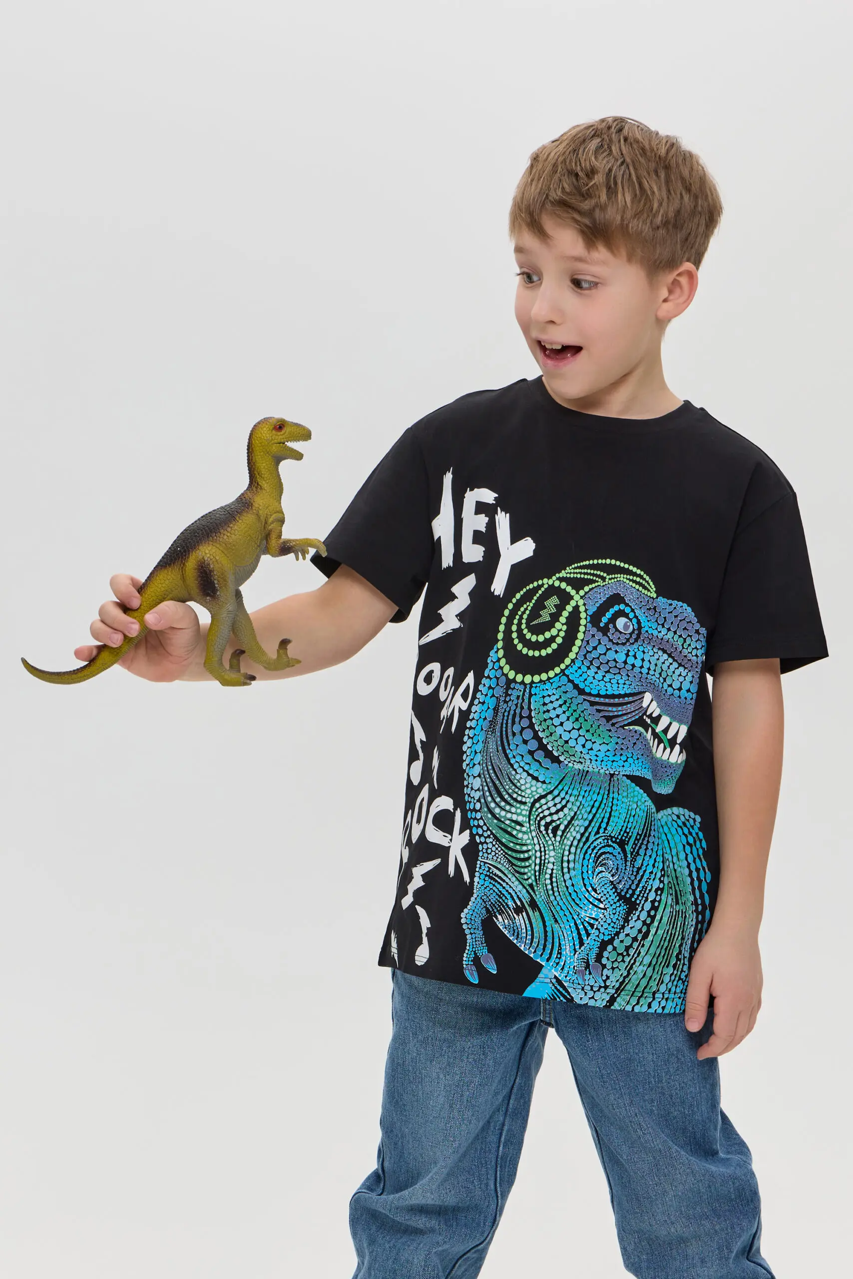 Стильная черная футболка с принтом станет отличным выбором для любителей оригинального дизайна! Футболка имеет классический круглый вырез горловины. Короткие рукава обеспечивают свободу движений и делают модель ... идеальной для теплой погоды. Главным акцентом модели является яркий принт в виде динозавра. Изображение выполнено в насыщенных цветах, что делает его заметным и привлекательным для ребенка. Футболка отлично сочетается с любой одеждой детского гардероба.