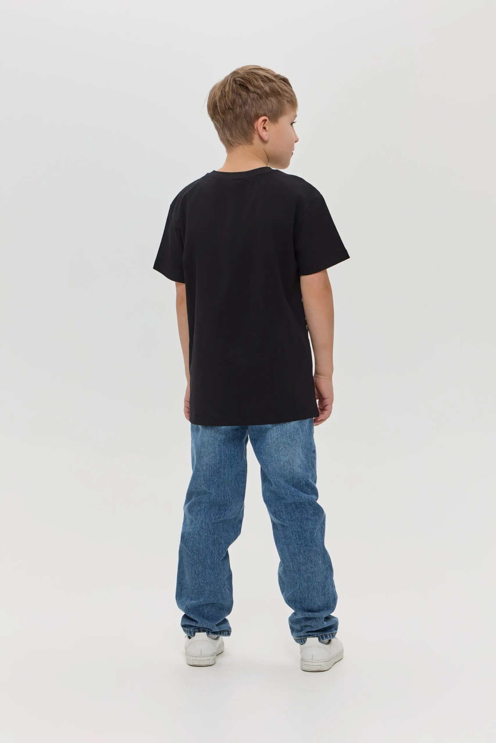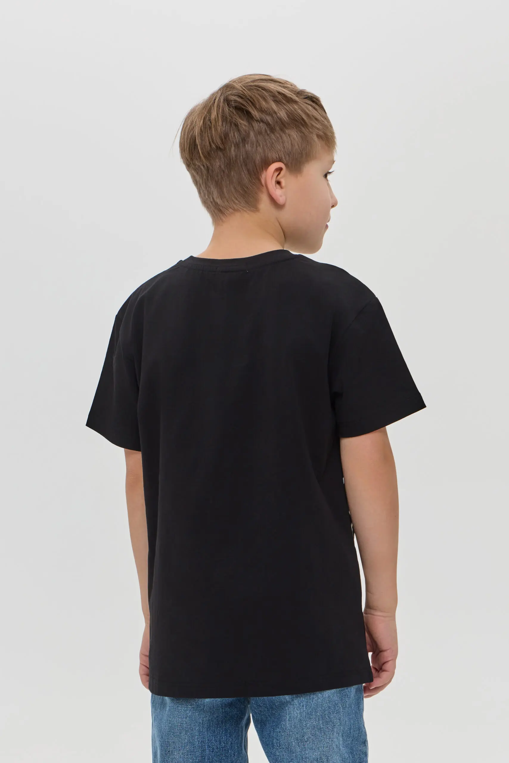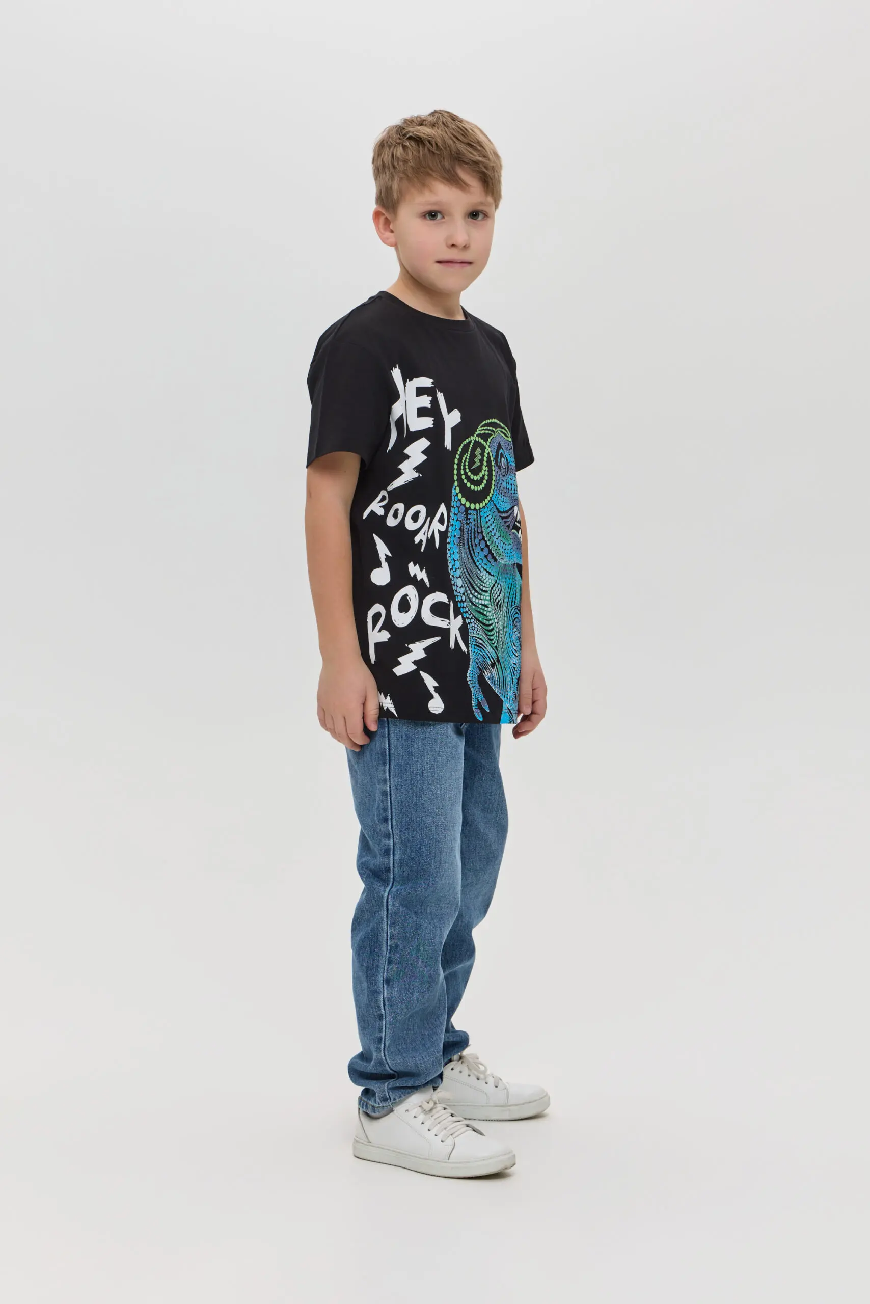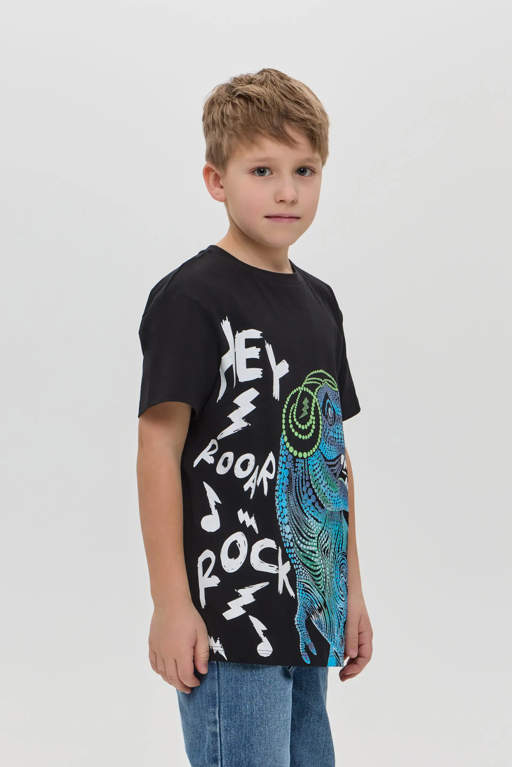 Стильная черная футболка с принтом станет отличным выбором для любителей оригинального дизайна! Футболка имеет классический круглый вырез горловины. Короткие рукава обеспечивают свободу движений и делают модель ... идеальной для теплой погоды. Главным акцентом модели является яркий принт в виде динозавра. Изображение выполнено в насыщенных цветах, что делает его заметным и привлекательным для ребенка. Футболка отлично сочетается с любой одеждой детского гардероба.