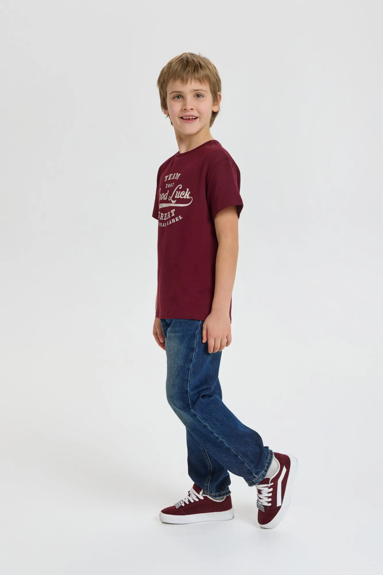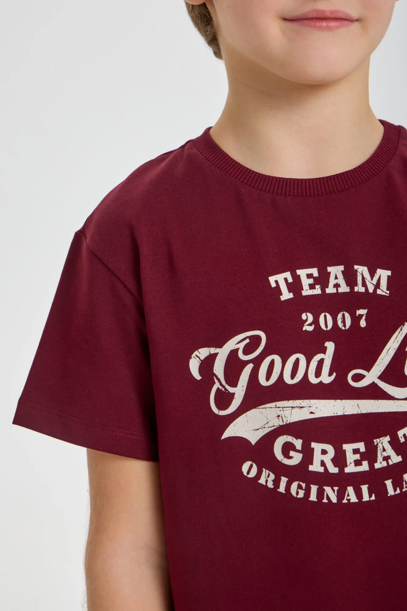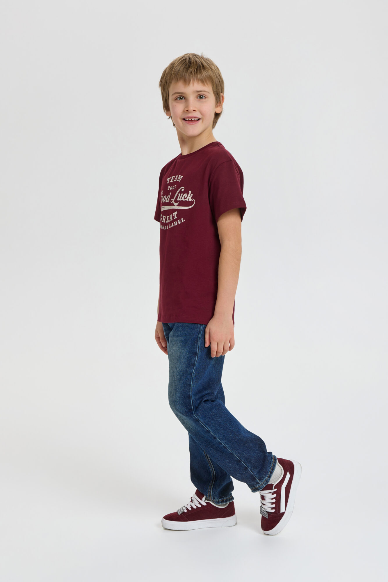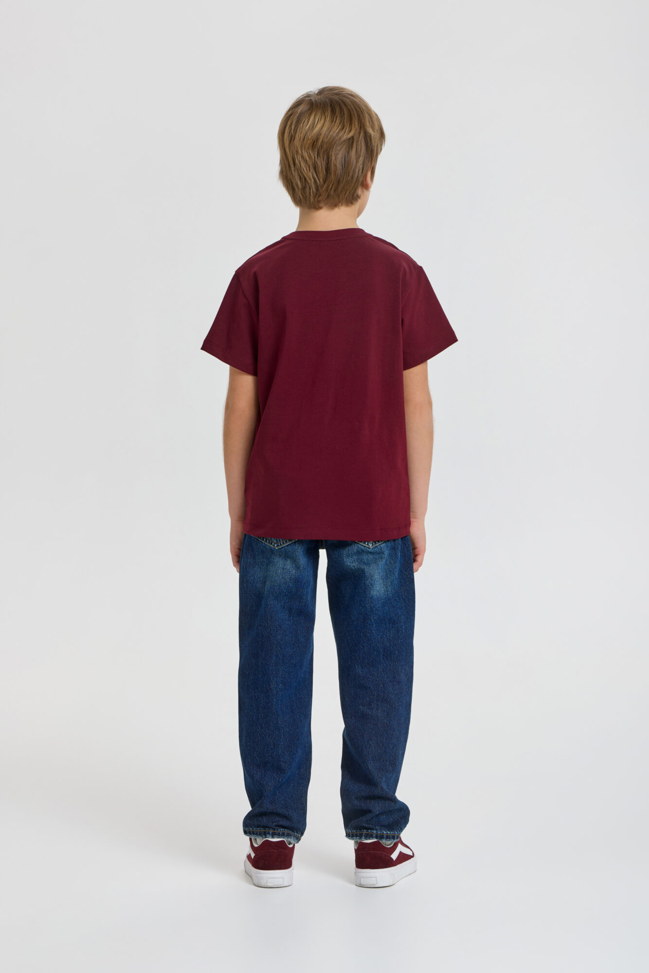 Яркая бордовая футболка – стильное дополнение к одежде для мальчика. Модель свободного кроя имеет круглый вырез, обработанный аккуратной тесьмой. Плечевой шов немного занижен, а рукава укорочены. Футболка изготовлена ... из нежного и мягкого хлопка. Оптимальная длина позволяет носить её разными способами. Оригинальный принт сразу бросается в глаза. Универсальная бордовая футболка идеально подойдет для весенних и летних образов юного модника.