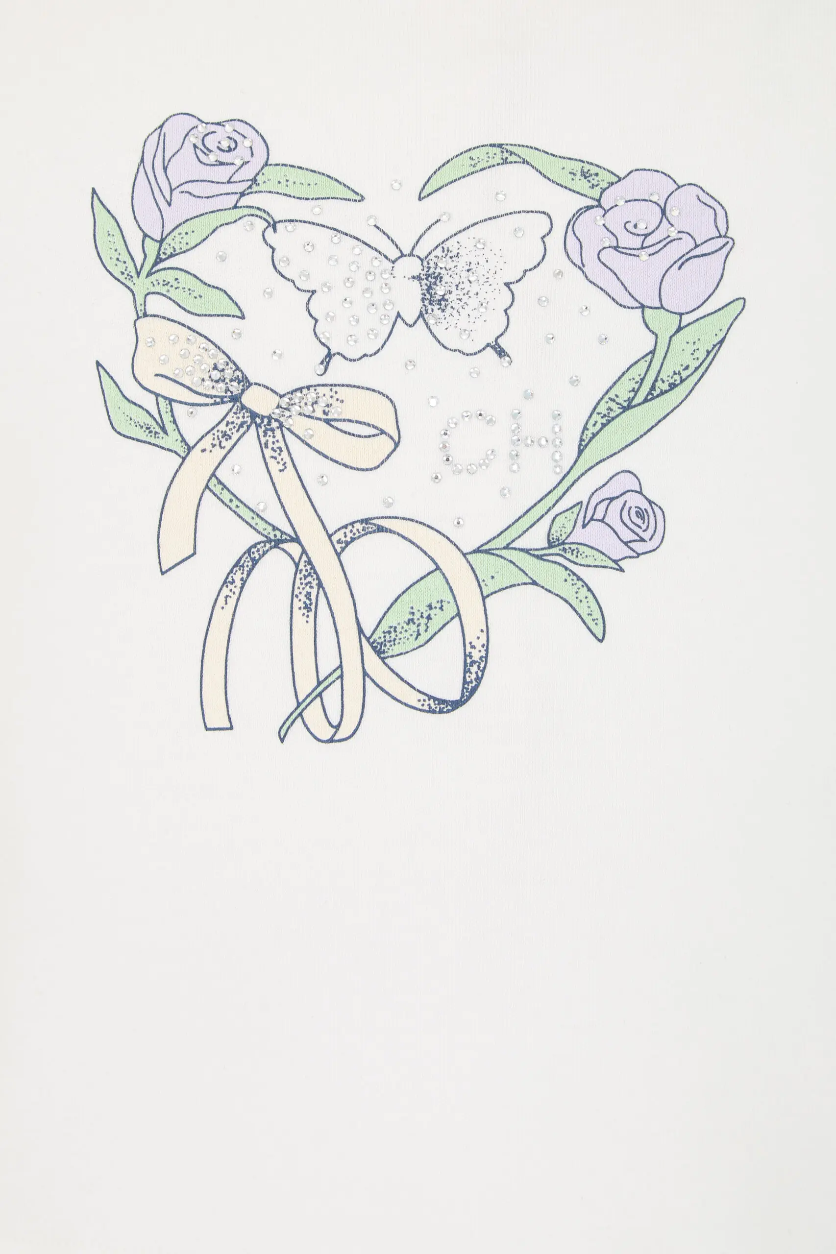 Футболка для девочки с принтом и стразами — идеальный выбор для маленькой модницы. Модель комфортного прямого силуэта изготовлена из 100% хлопка, что обеспечивает одежде отличную воздухопроницаемость ... и мягкость. Нежный цвет экрю позволяет легко сочетать футболку с различными элементами детского гардероба. Принт на футболке выполнен в ярких и привлекательных цветах.