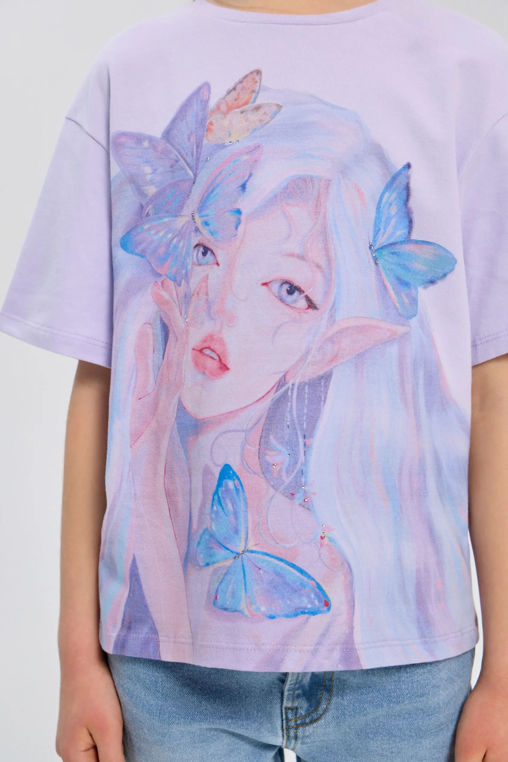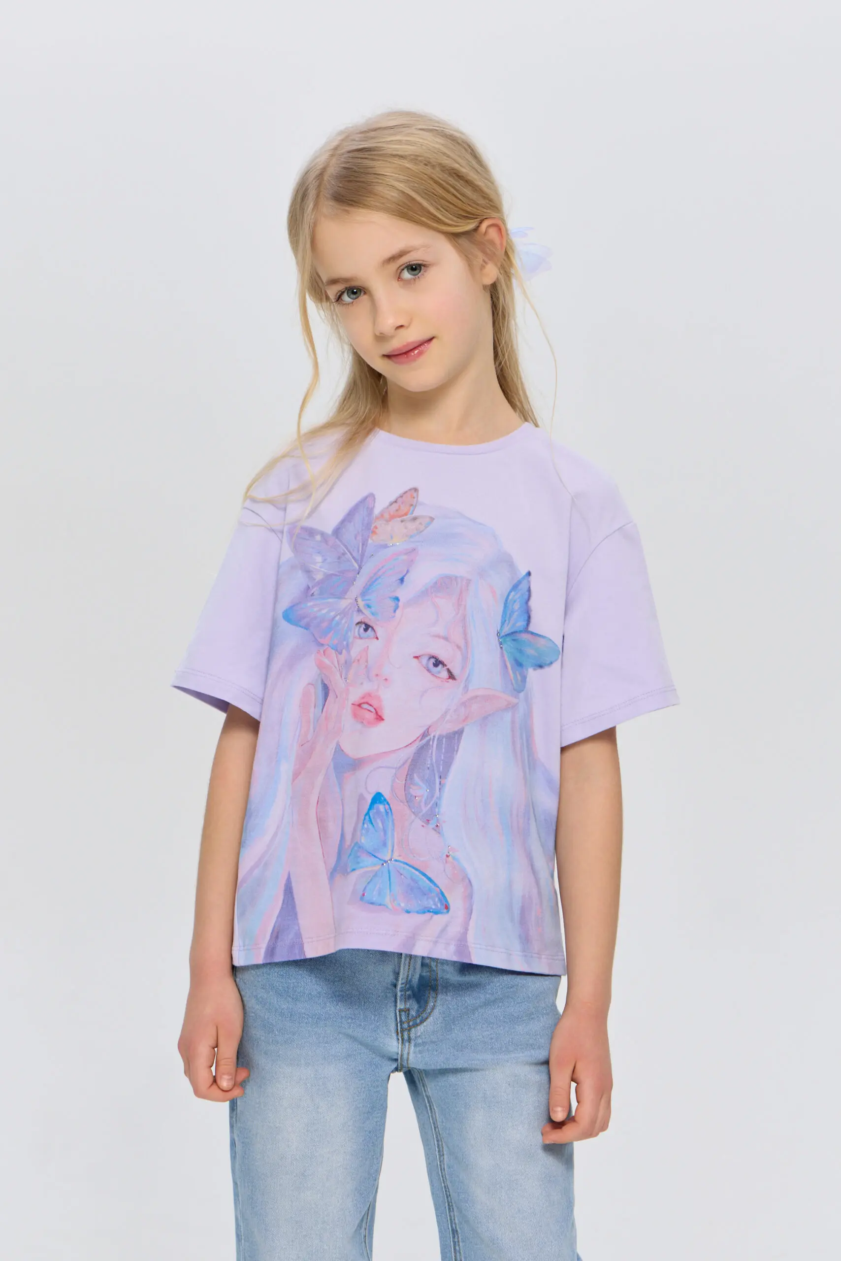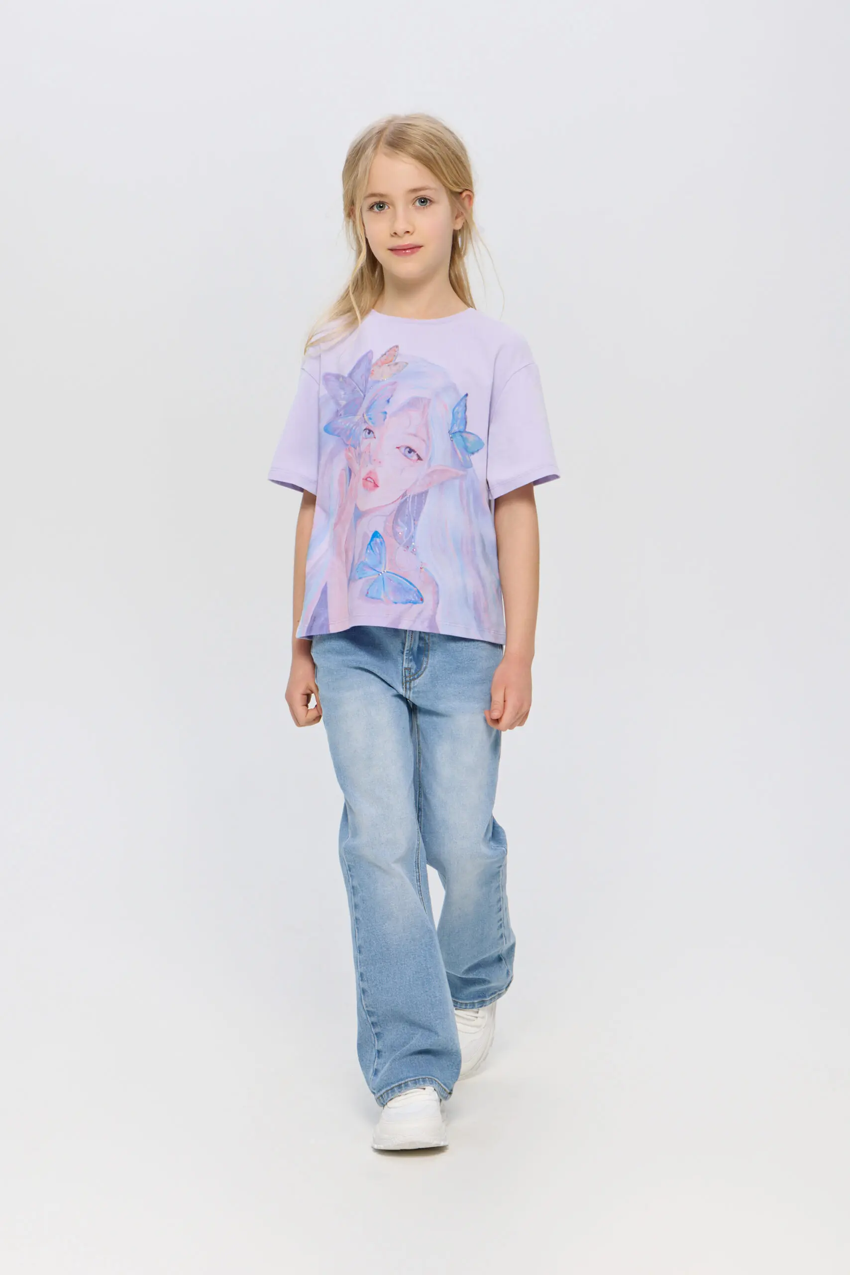 Принт на футболке добавляет индивидуальности ... и делает изделие более выразительным. В комплекте с футболкой идут заколки в виде бабочек. Они идеально подходят для создания стильных причесок и добавляют завершающий штрих к образу.