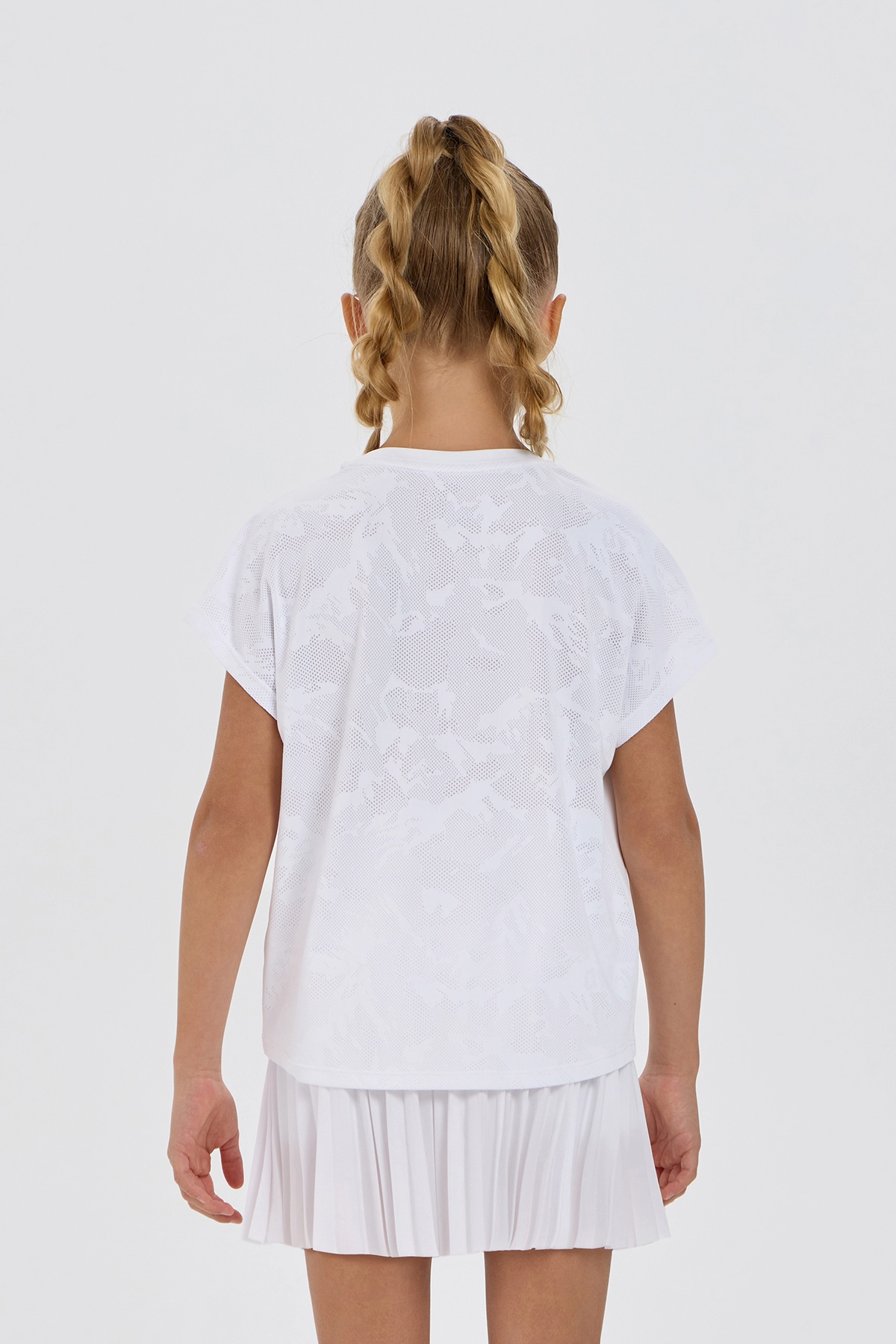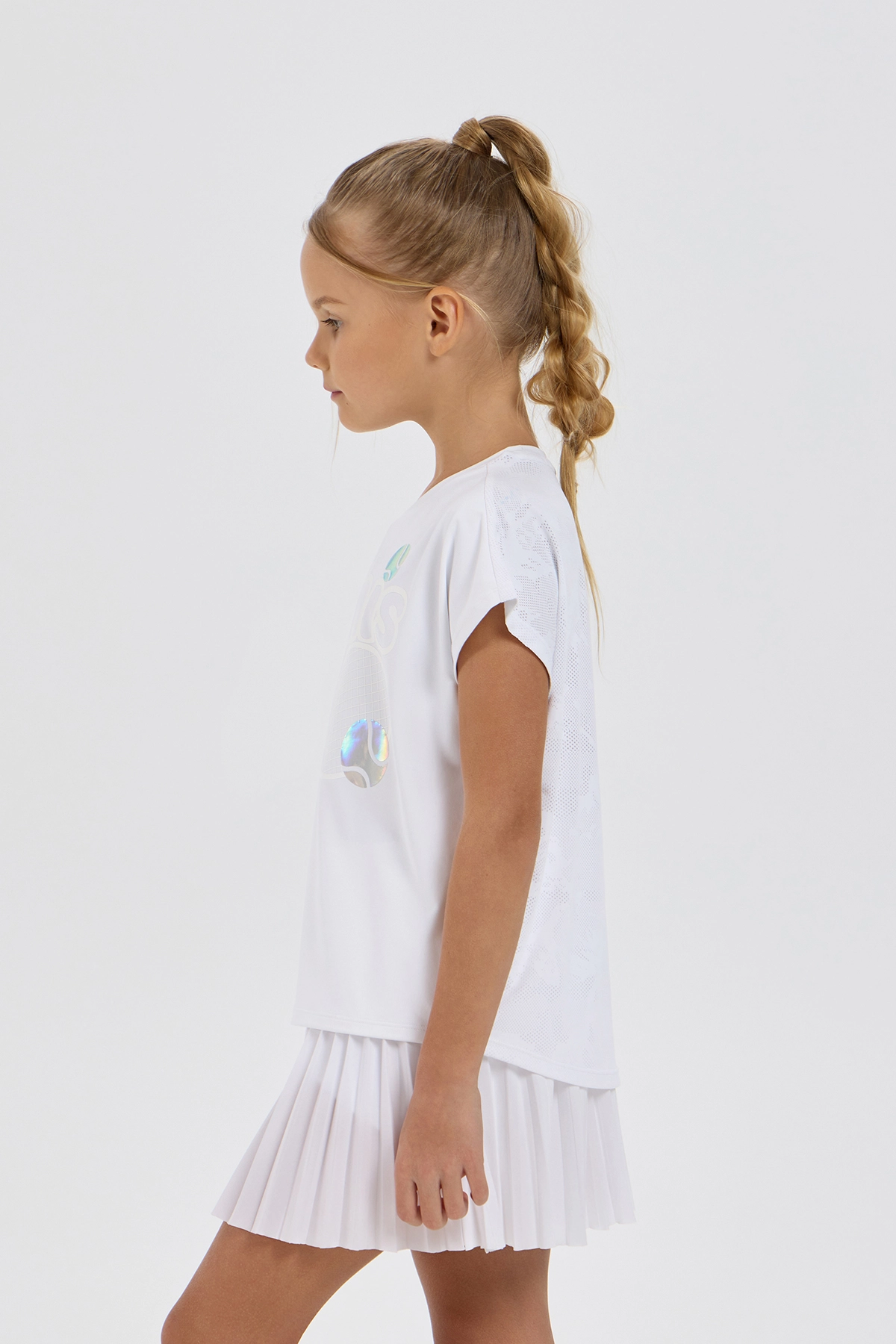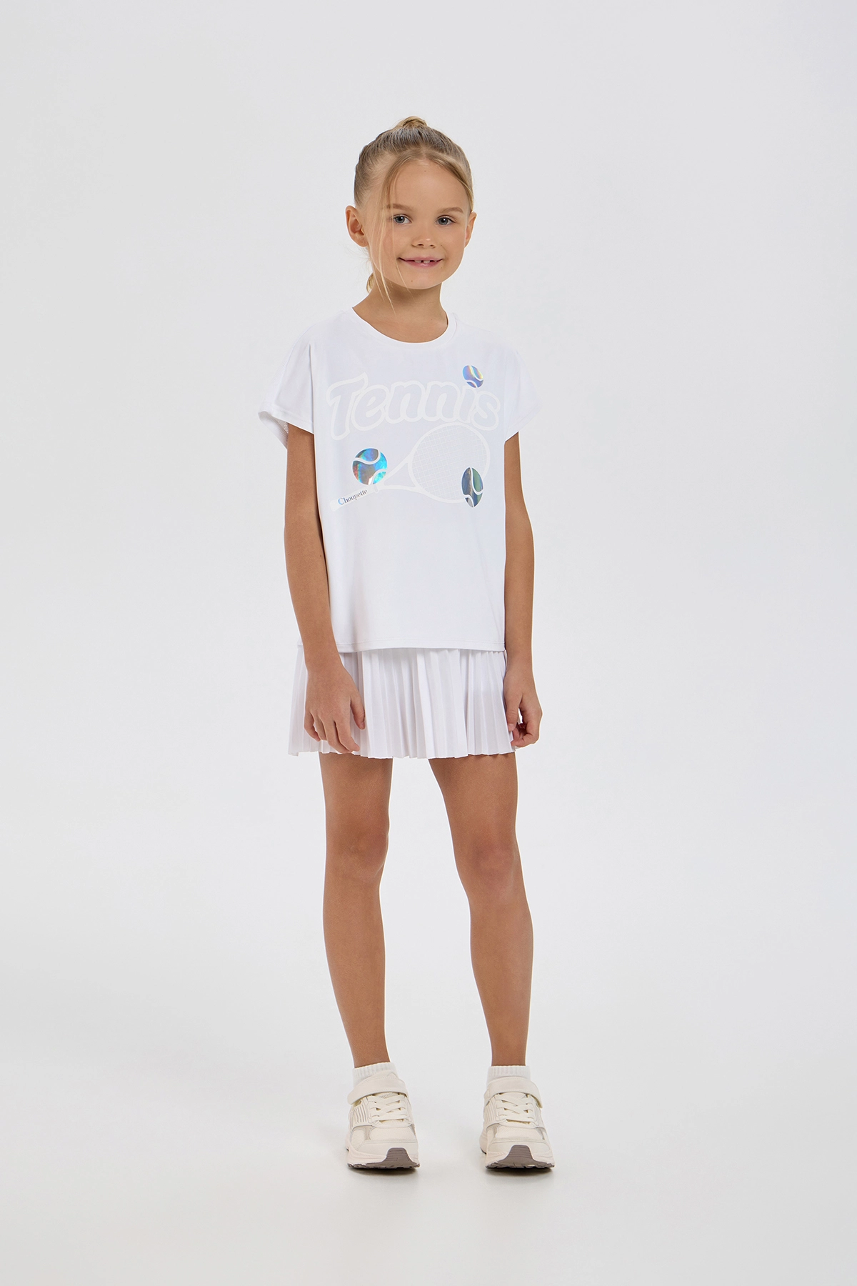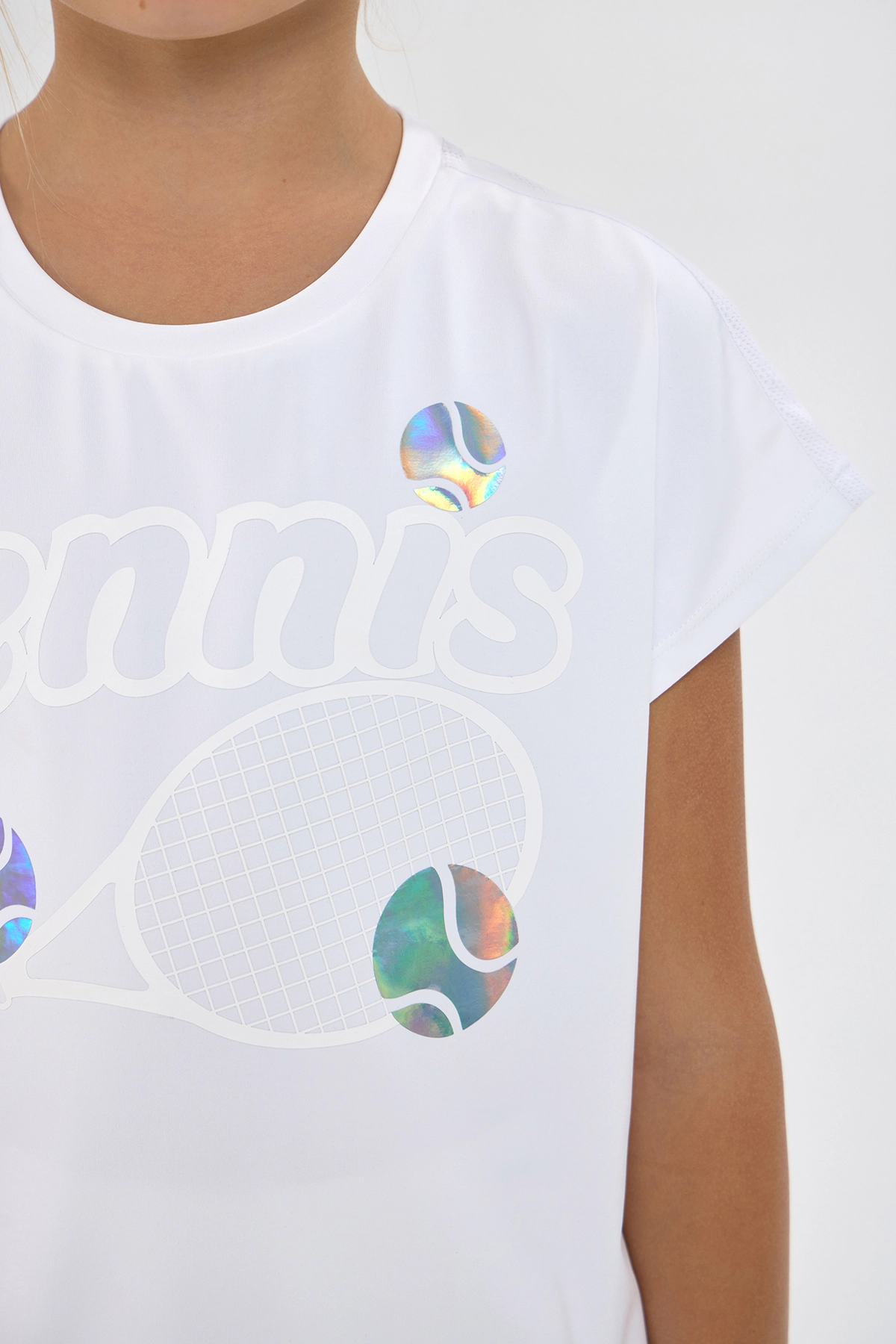 Стильная спортивная футболка для девочки идеально подходит для тренировок, игры в теннис или повседнвной носке. Модель свободного силуэта выполнена из мягкого и эластичного спортивного трикотажа. Классический ... круглый вырез и короткие рукава делают футболку универсальной и удобной для каждодневного использования. Футболка украшена крупным декоративным принтом с теннисной ракеткой и мячами с эффектом голографии, который придаёт образу яркий и современный характер. Она легко комбинируется со спортивными юбками, шортами и кроссовками, позволяя создавать лёгкие и стильные комплекты для активного дня. Благодаря свободному крою изделие не сковывает движения и обеспечивает комфорт во время любой активности. Лаконичная белая цветовая гамма в сочетании с переливающимися голографическими элементами выглядит эффектно и современно.