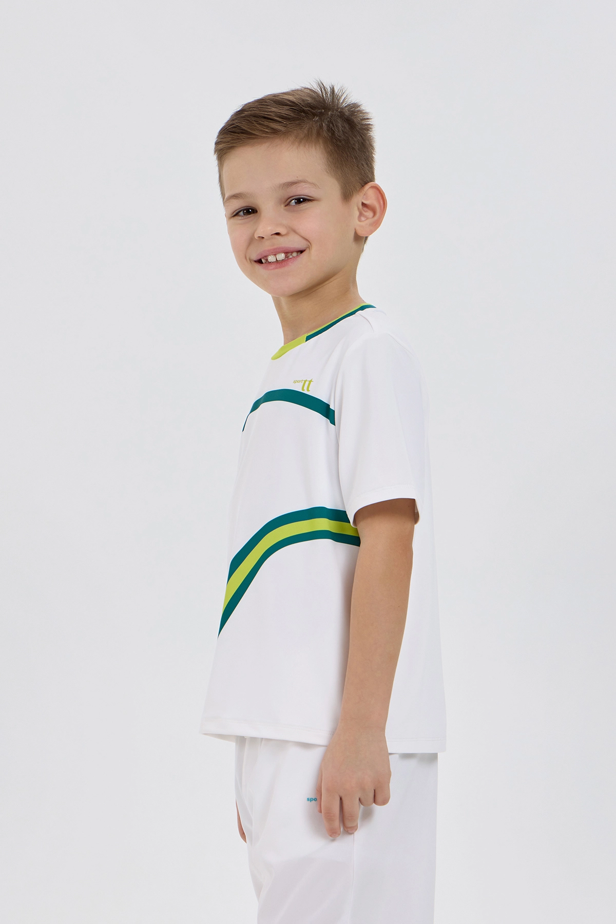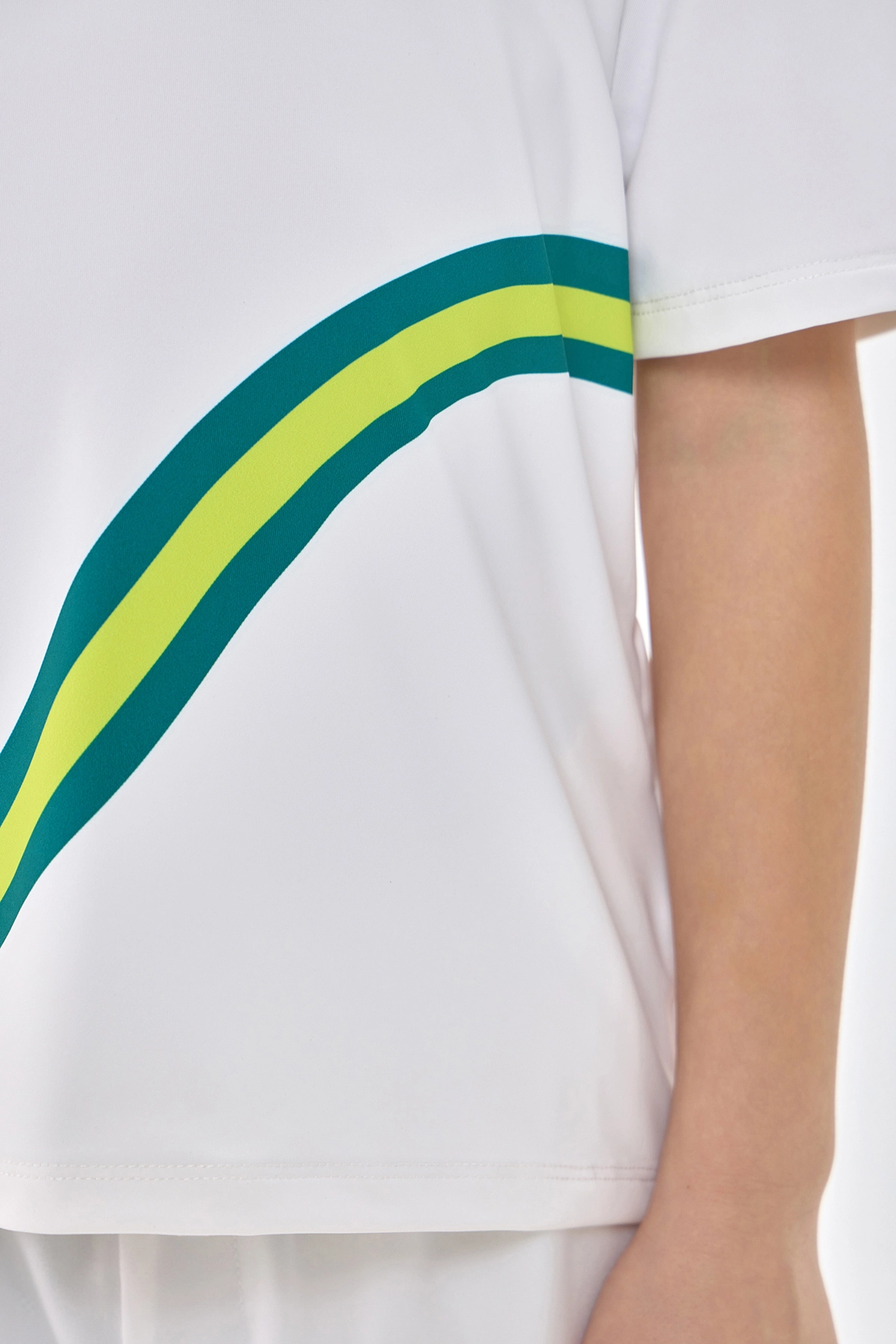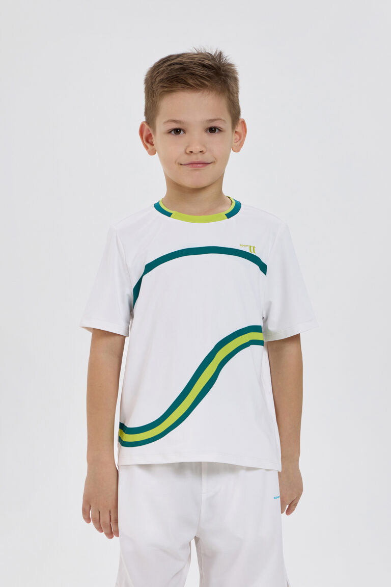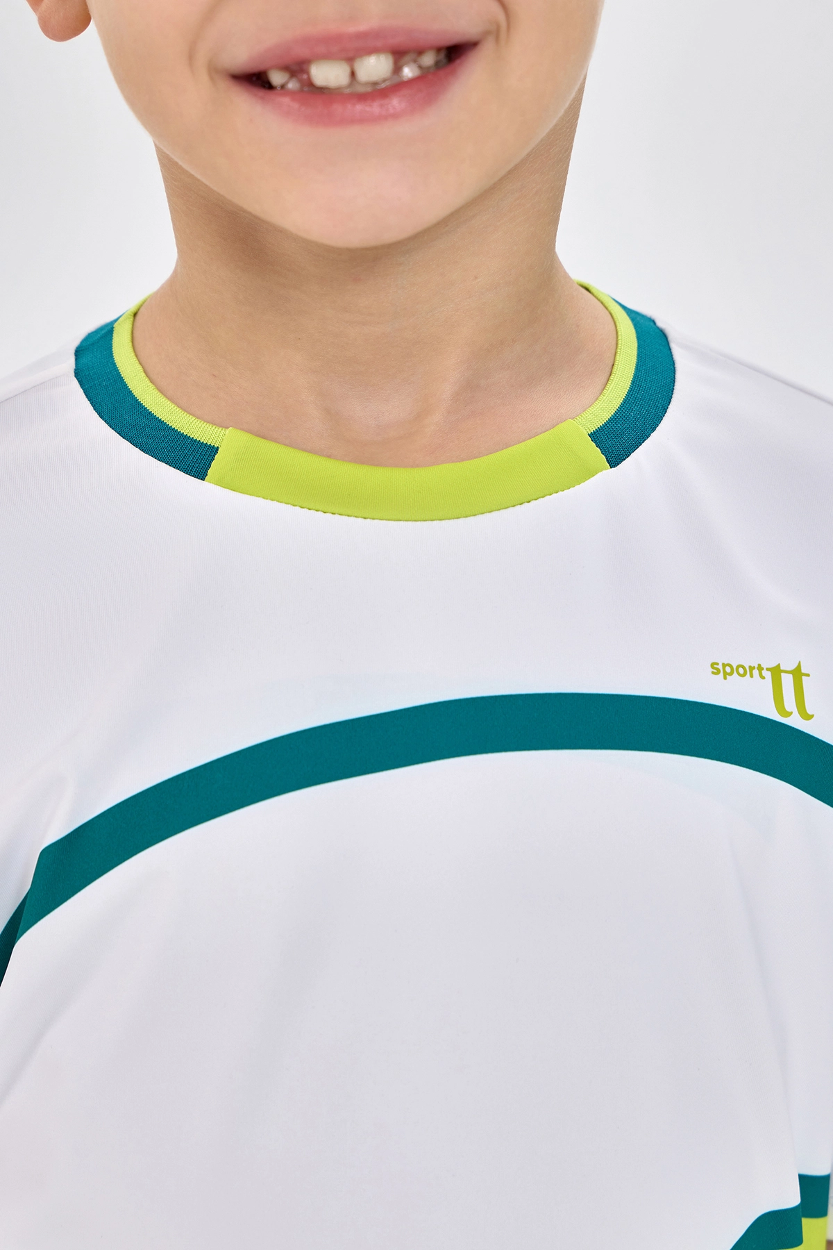 Яркая динамичная спортивная футболка свободного кроя выполнена из эластичного спортивного трикотажа. Модель с короткими рукавами, округлый вырез горловины обработан контрастной бейкой. Яркий принт в виде салатовых ... и темно-зеленых полосок акцентирует внимание и подчеркивает спортивный характер. Футболка отлично подойдет для занятий спортом, танцами, тренировок, студийных выступлений.