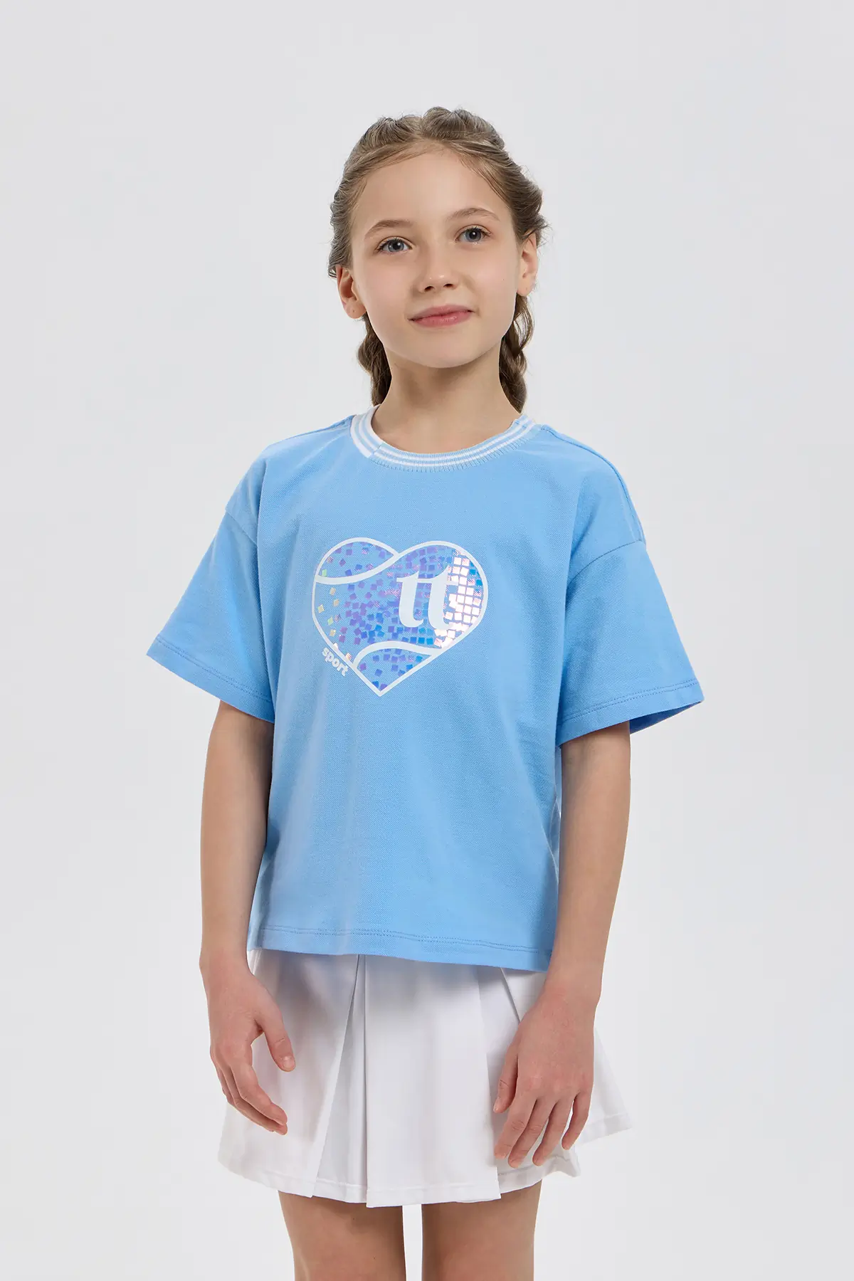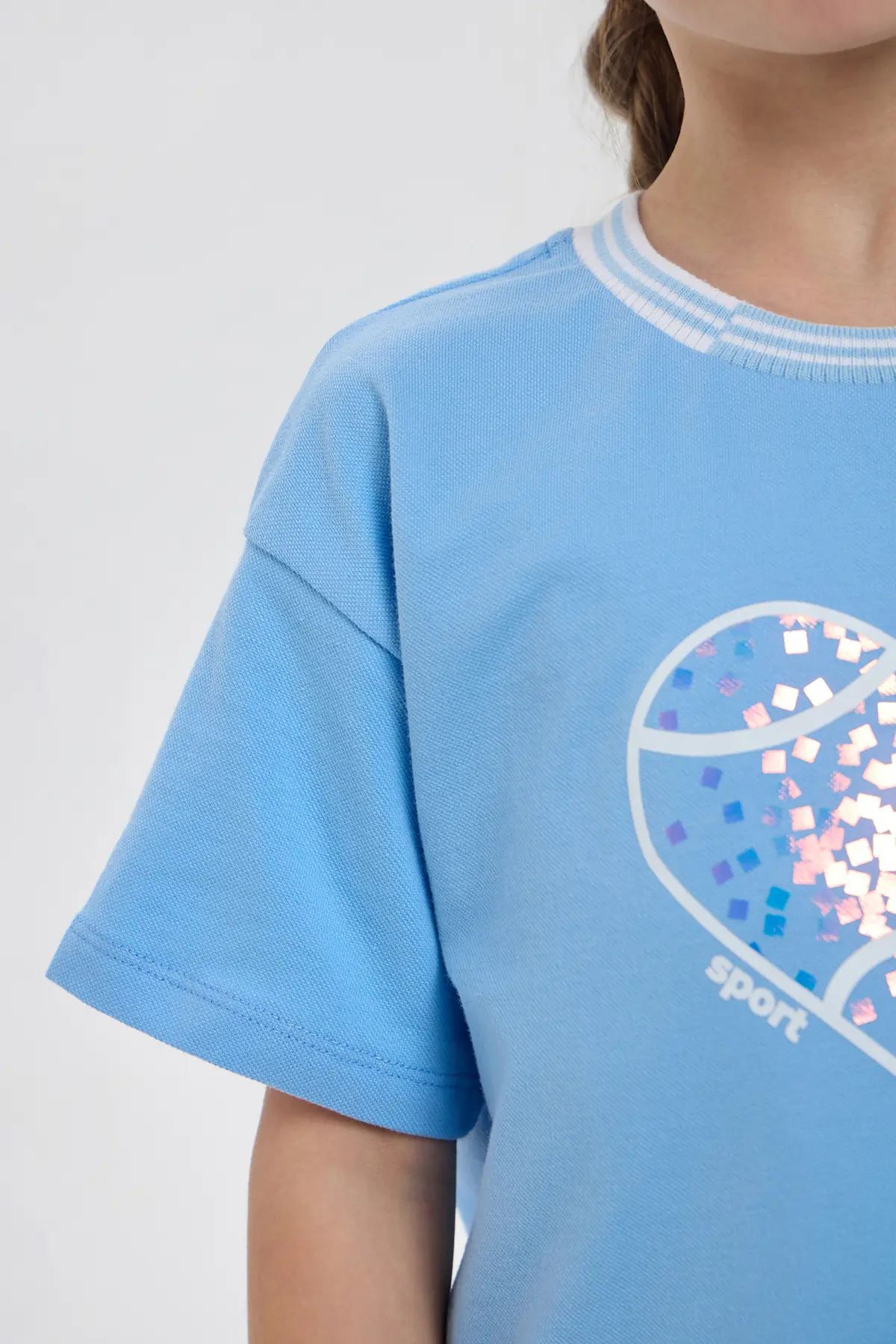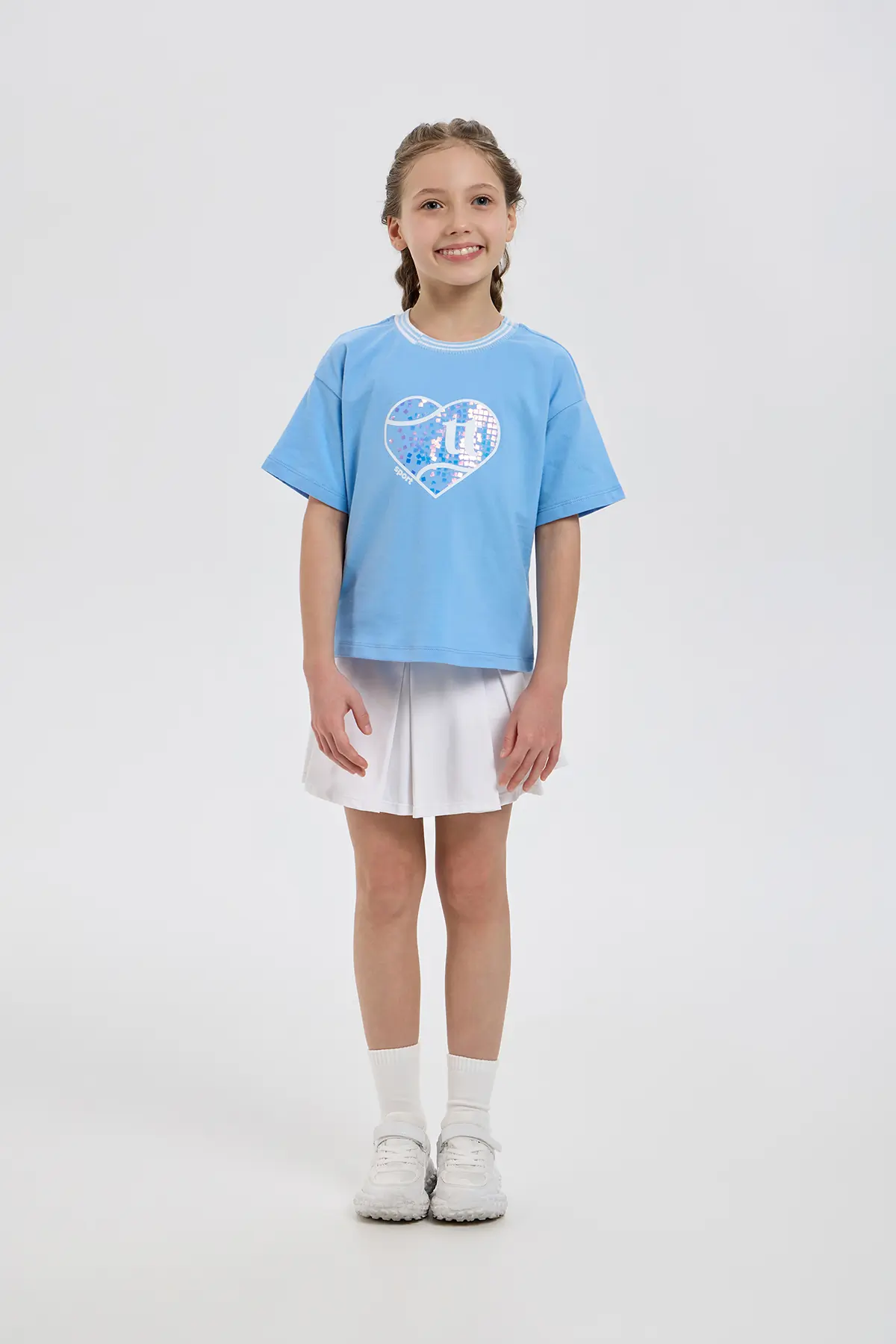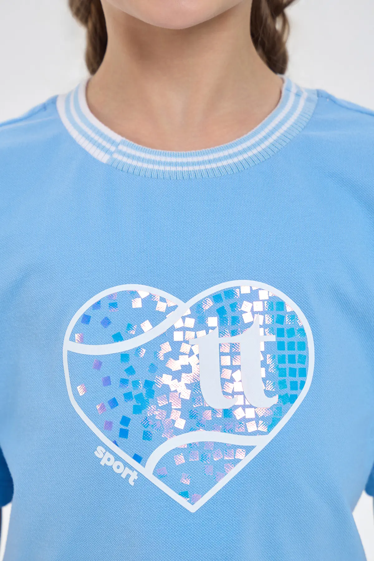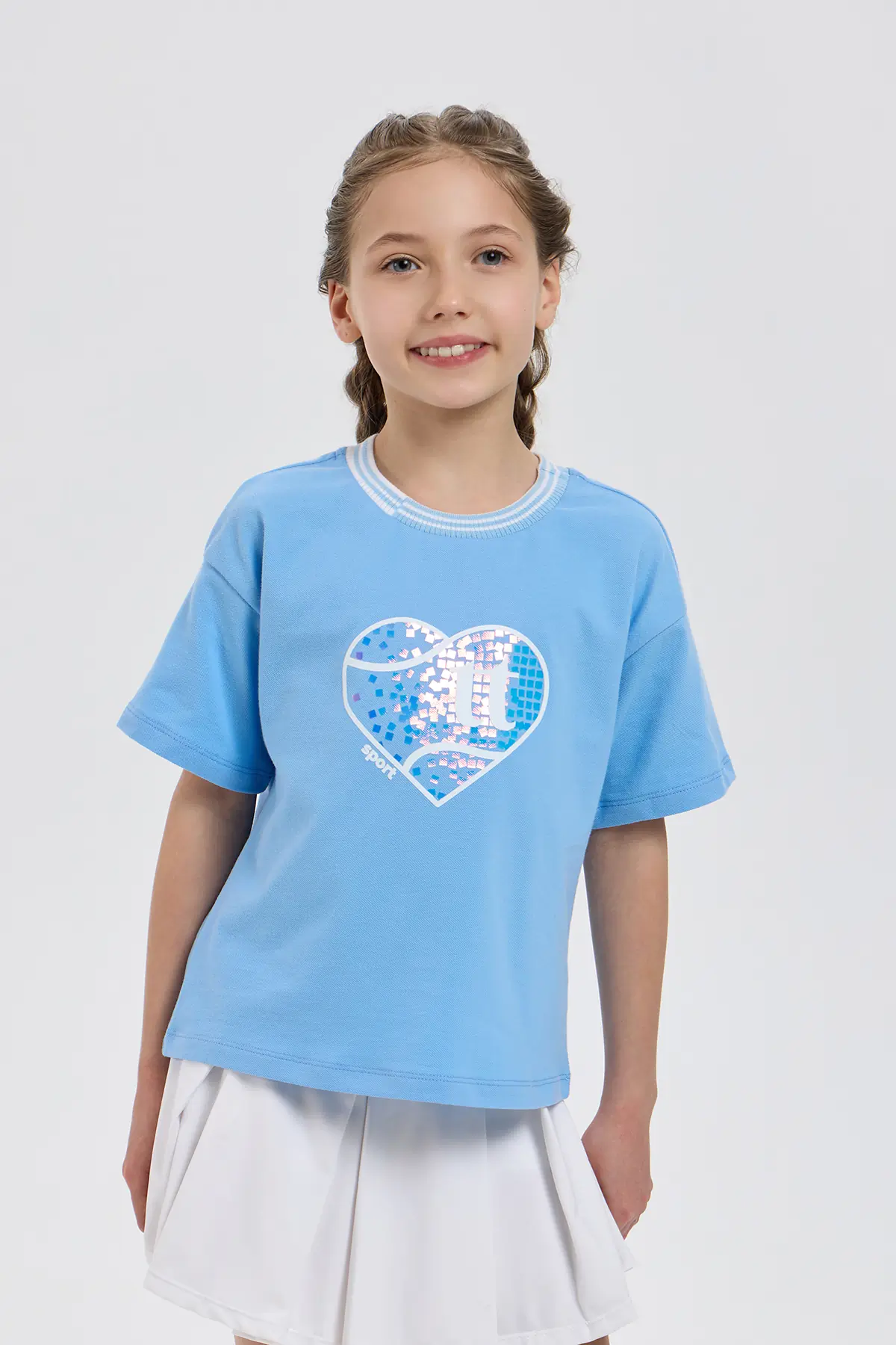 Стильная спортивная футболка нежного голубого оттенка создана для девочек, ведущих активный образ жизни. Модель свободного силуэта выполнена из мягкого и приятного к телу трикотажа, который обеспечивает ... комфорт и свободу движений во время тренировок и активных занятий. Классический круглый вырез и короткие рукава делают модель удобной и универсальной для повседневного использования. Футболка дополнена аккуратным декоративным принтом на груди, который придаёт образу современный и динамичный характер. Футболка отлично подходит для танцевальных тренировок, репетиций, занятий спортом и повседневной носки. Она легко комбинируется с юбками, шортами, легинсами и спортивной обувью, позволяя создавать стильные и комфортные образы для активного дня. Благодаря свободному крою модель не сковывает движения и отлично подходит для занятий в студии. Нежная голубая цветовая гамма выглядит свежо и современно. Такой оттенок является актуальным трендом в детской спортивной и уличной моде