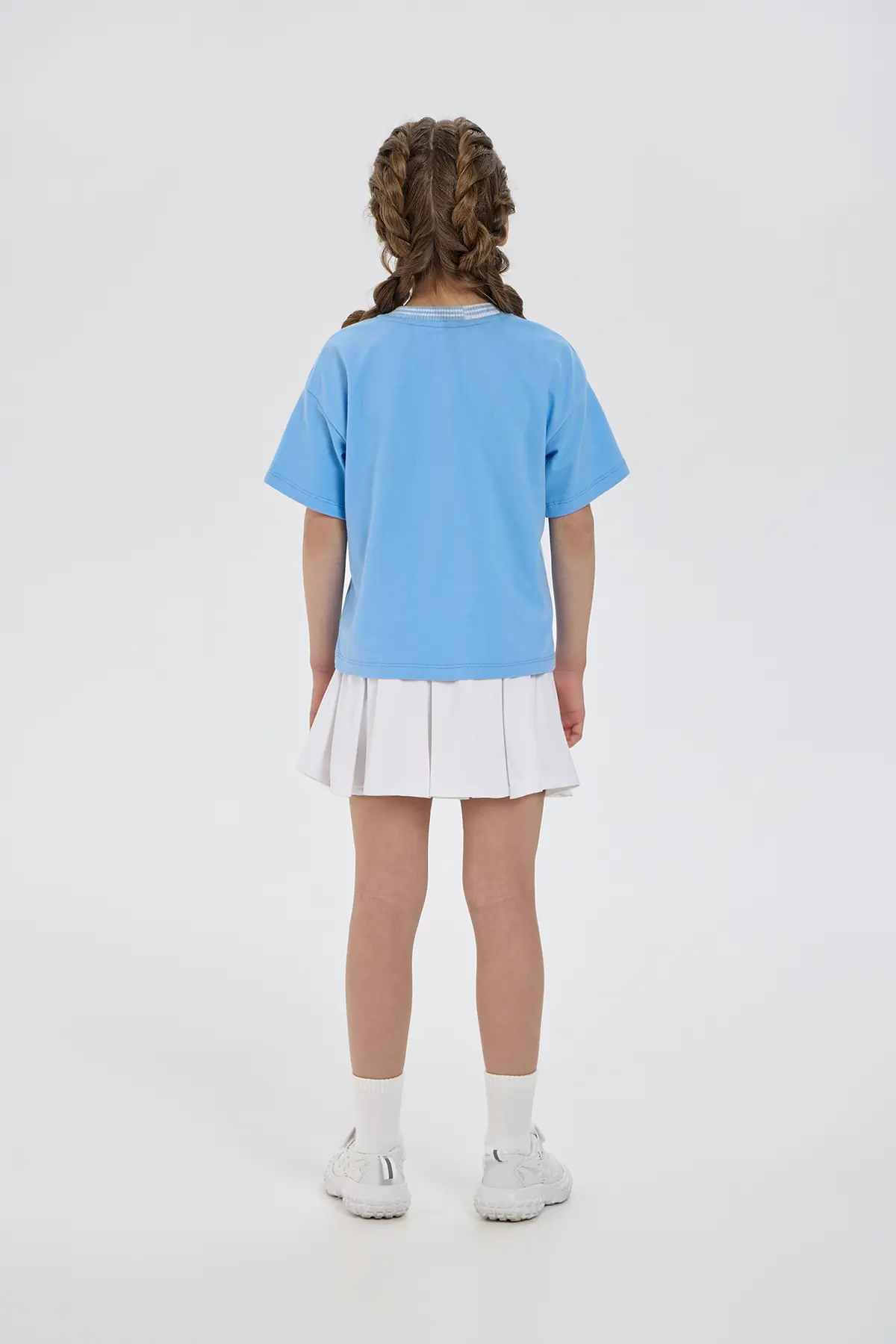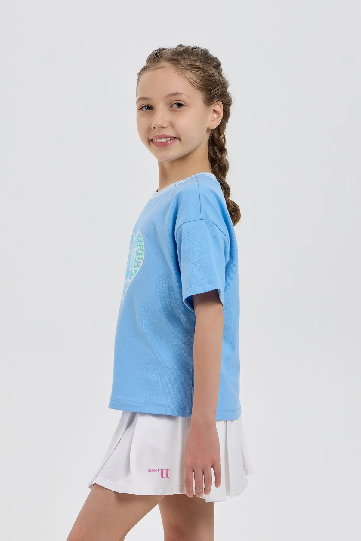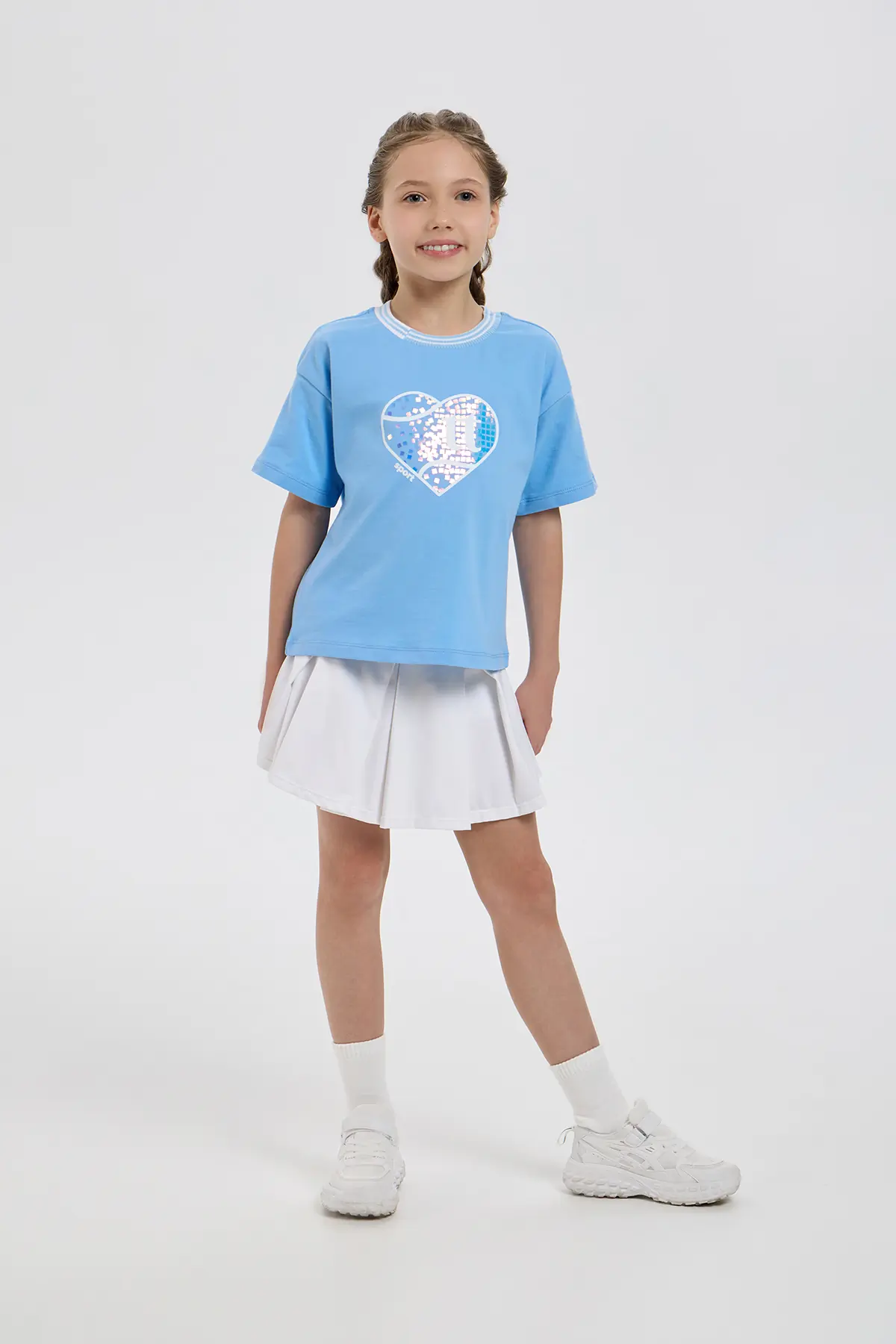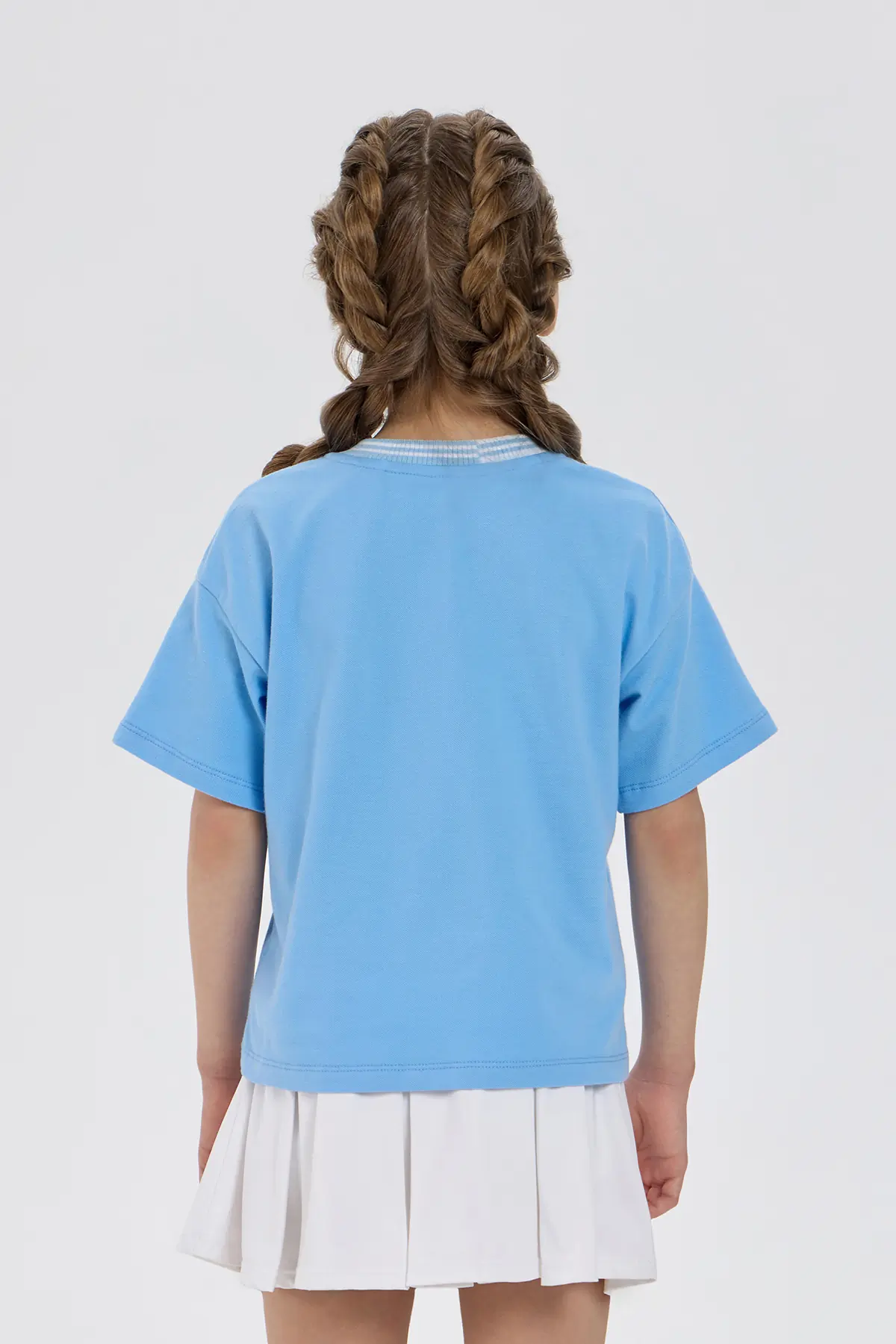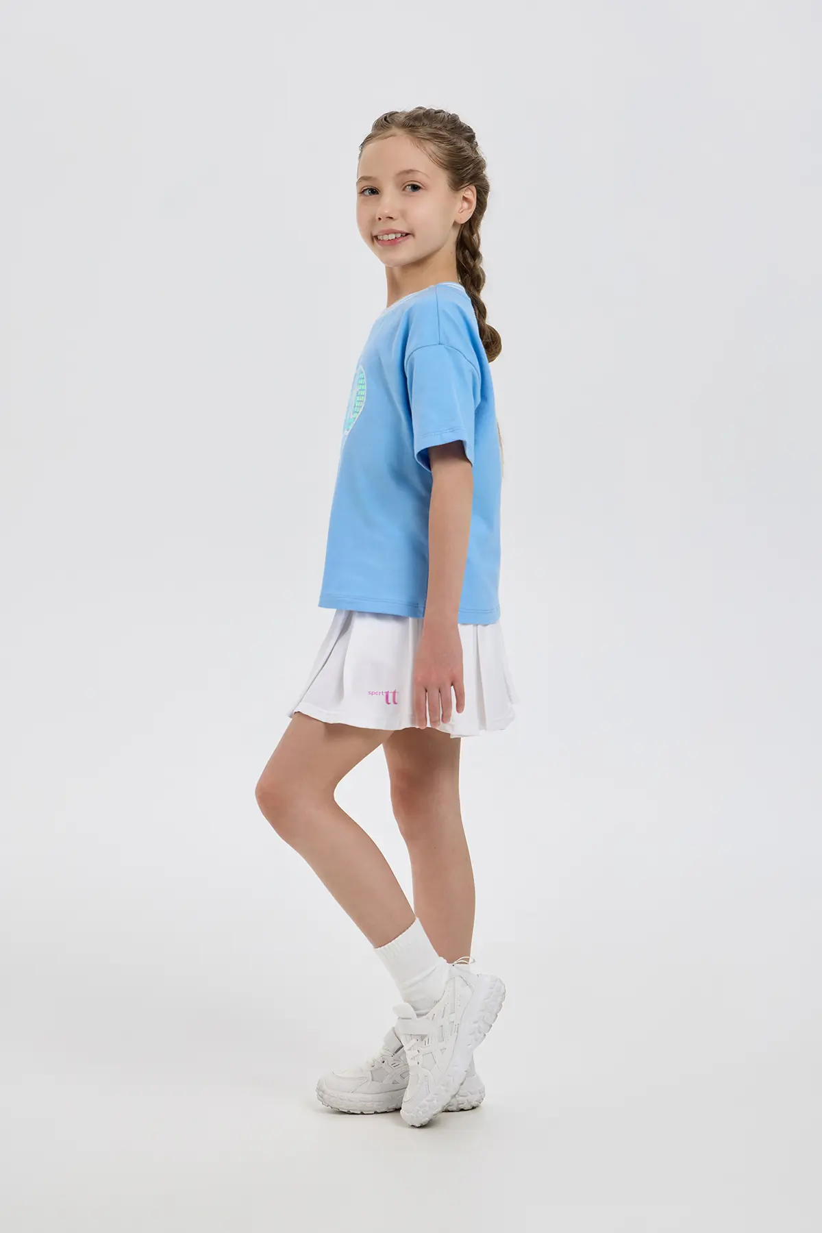 Стильная спортивная футболка нежного голубого оттенка создана для девочек, ведущих активный образ жизни. Модель свободного силуэта выполнена из мягкого и приятного к телу трикотажа, который обеспечивает ... комфорт и свободу движений во время тренировок и активных занятий. Классический круглый вырез и короткие рукава делают модель удобной и универсальной для повседневного использования. Футболка дополнена аккуратным декоративным принтом на груди, который придаёт образу современный и динамичный характер. Футболка отлично подходит для танцевальных тренировок, репетиций, занятий спортом и повседневной носки. Она легко комбинируется с юбками, шортами, легинсами и спортивной обувью, позволяя создавать стильные и комфортные образы для активного дня. Благодаря свободному крою модель не сковывает движения и отлично подходит для занятий в студии. Нежная голубая цветовая гамма выглядит свежо и современно. Такой оттенок является актуальным трендом в детской спортивной и уличной моде