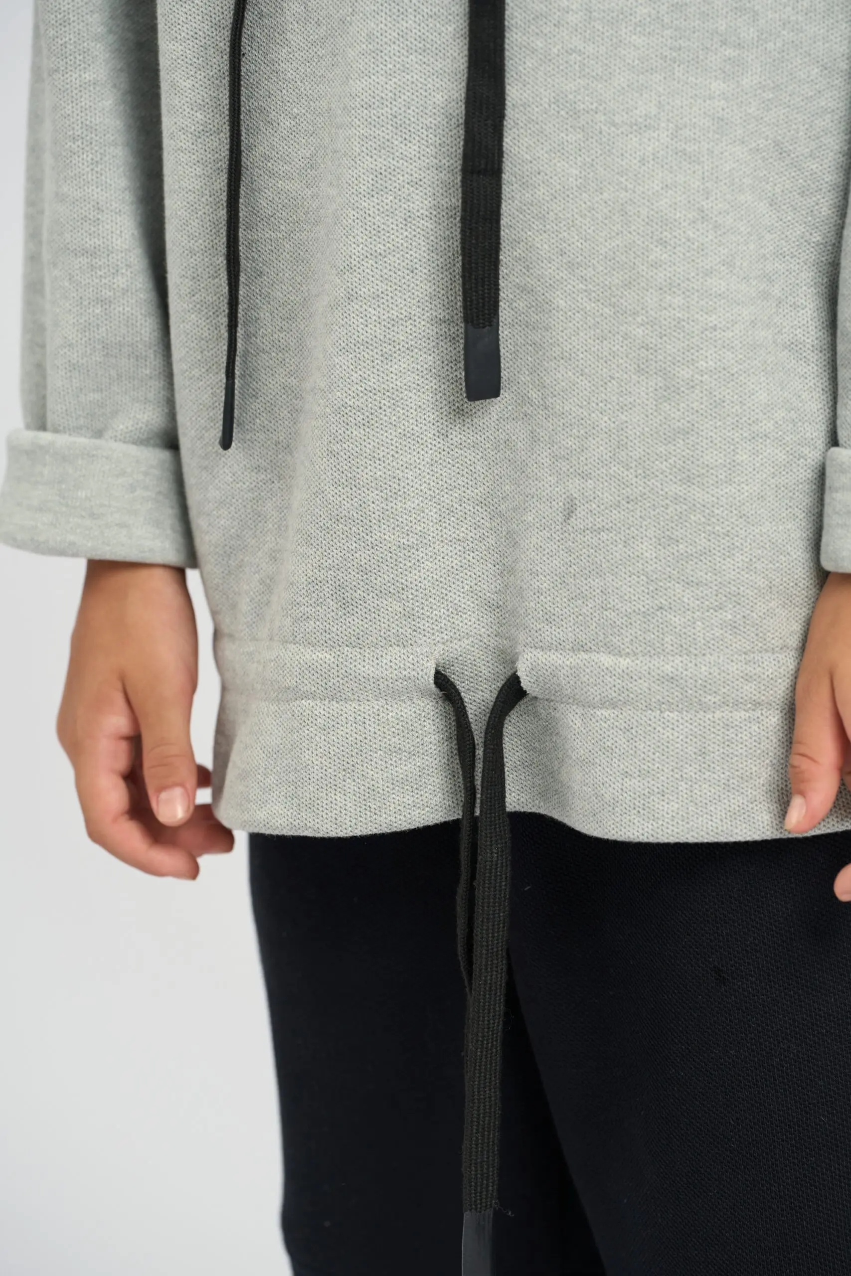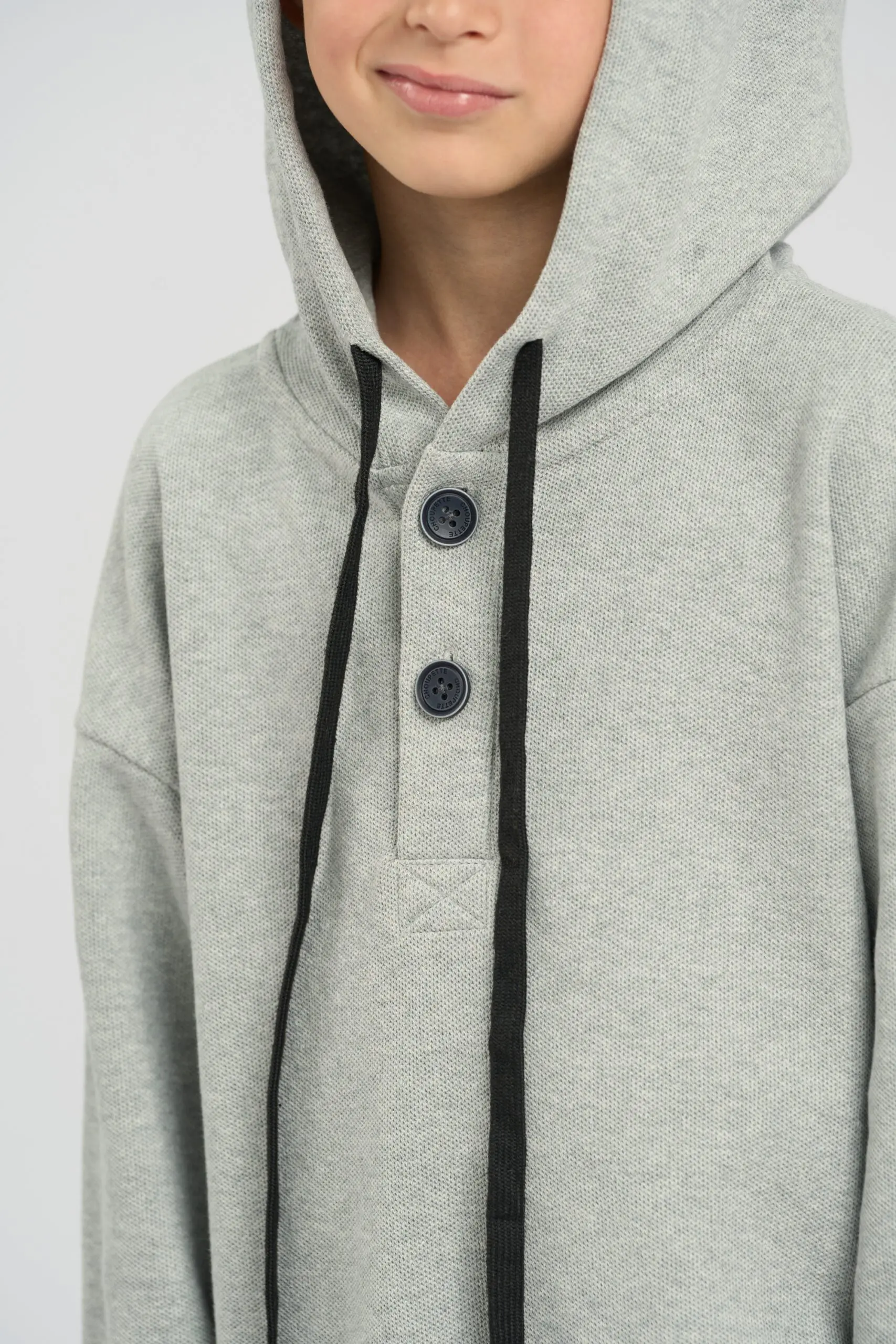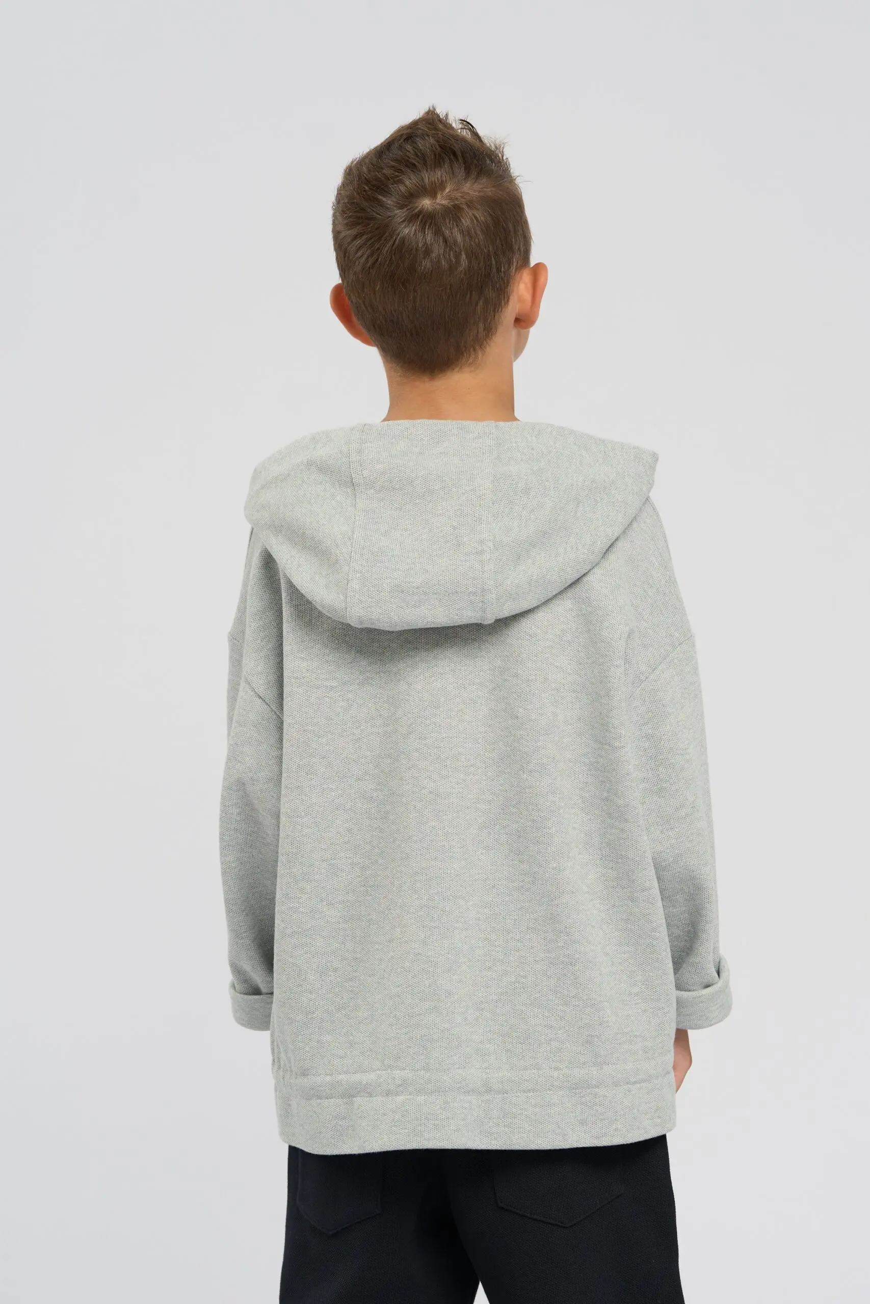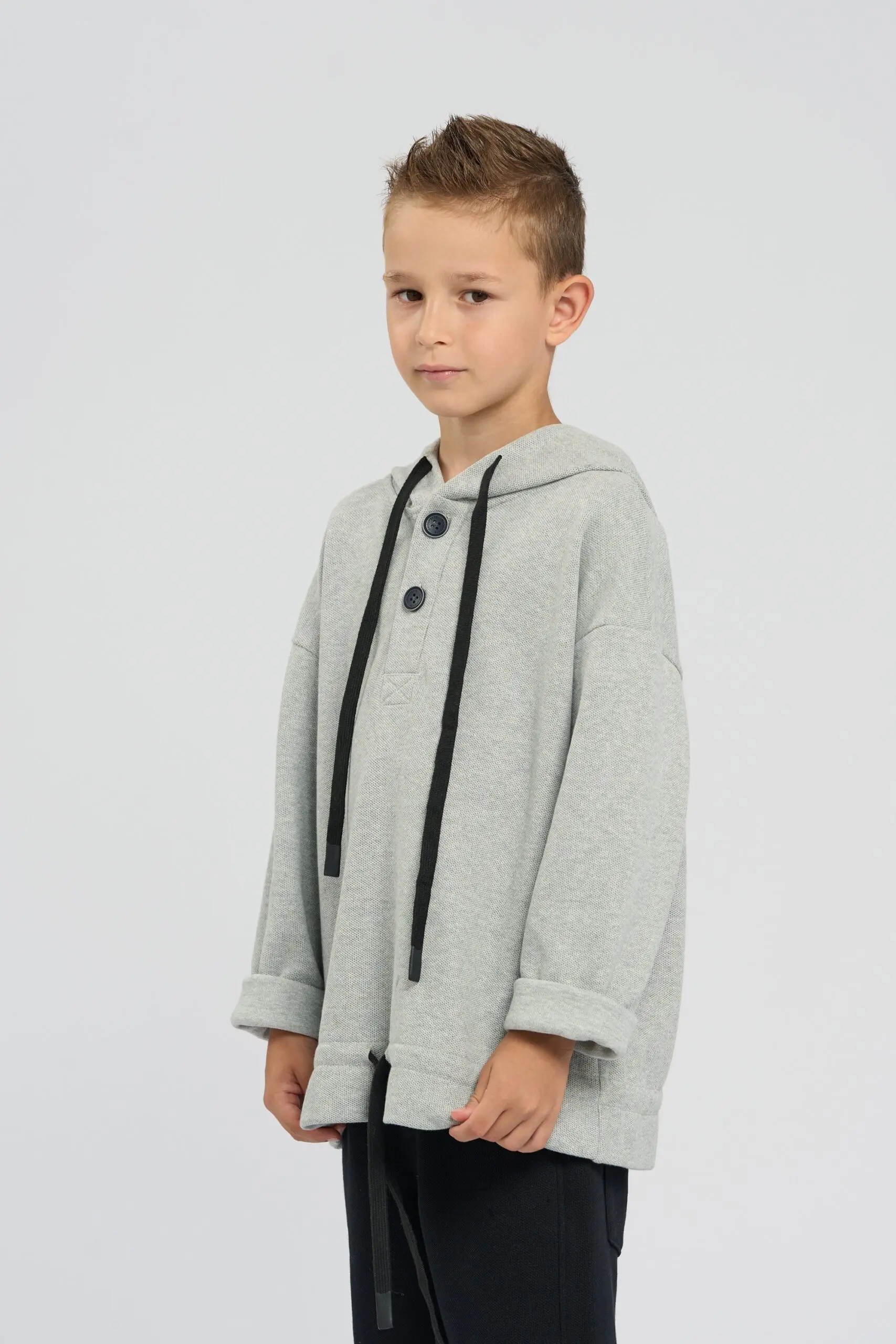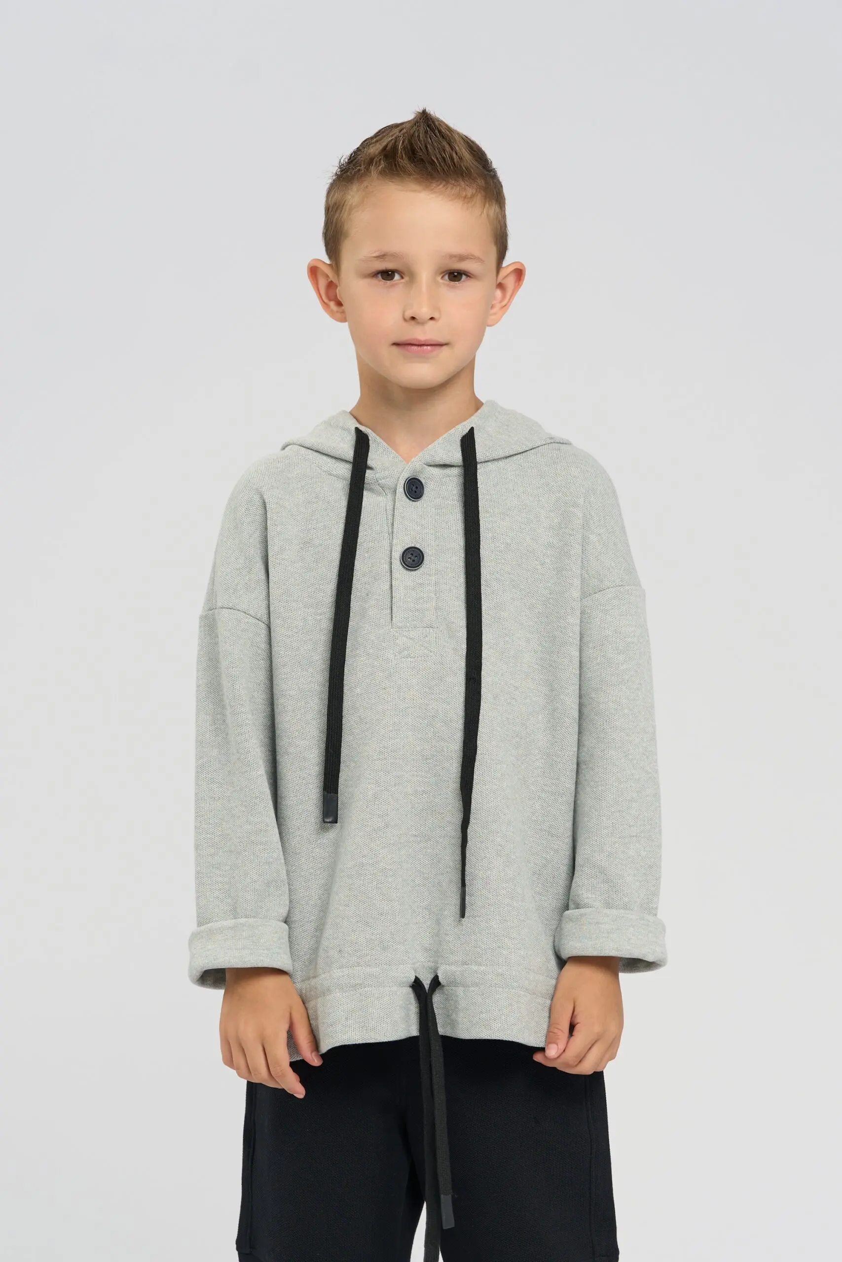 Худи для мальчика отлично подходит для повседневной носки. Мягкий и приятный на ощупь материал обеспечивает комфорт и тепло, что делает его идеальным для прохладной погоды. Крупные ... пуговицы под воротником добавляют оригинальности и позволяют регулировать степень открытости. Капюшон с утягивающими кулисами обеспечивает дополнительную защиту от ветра и холода, а также позволяет подстроить капюшон под индивидуальные предпочтения ребенка. На поясе также предусмотрена утягивающая кулиса, что позволяет создать более приталенный силуэт и дополнительно защитить от холода. Такой дизайн делает худи не только функциональным, но и модным.