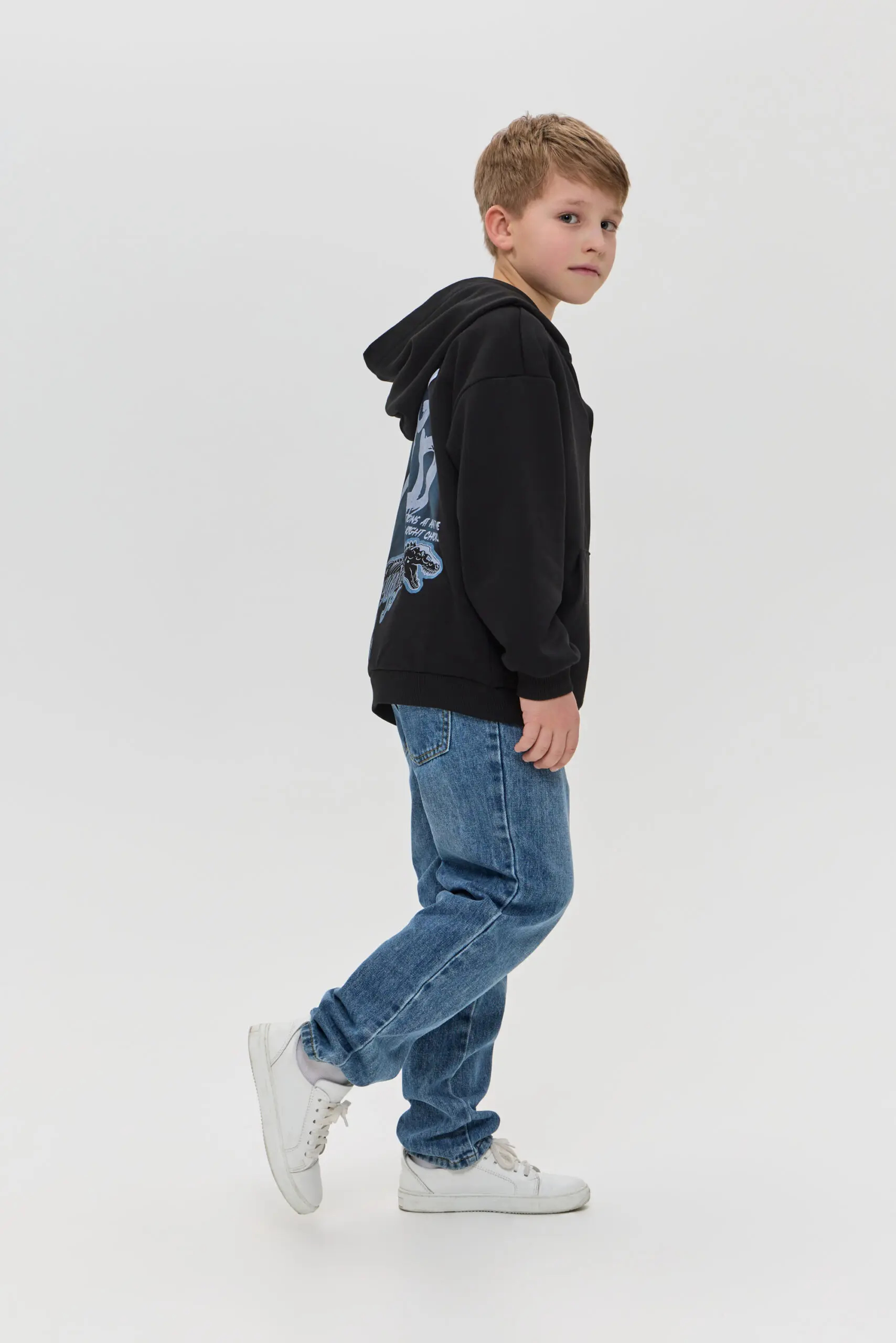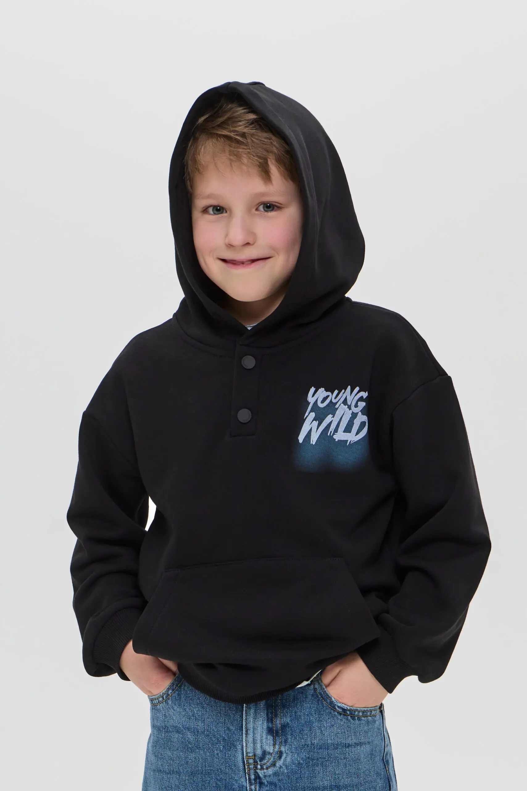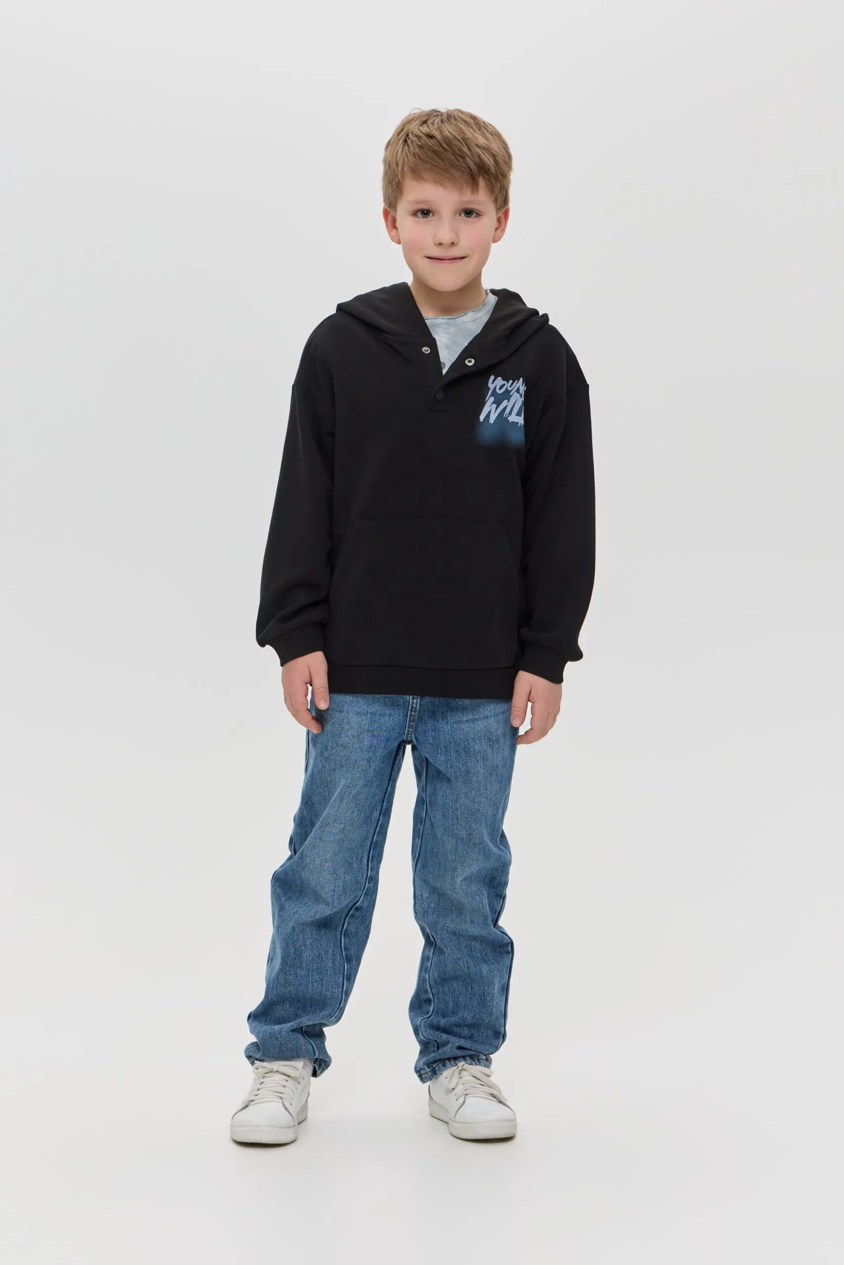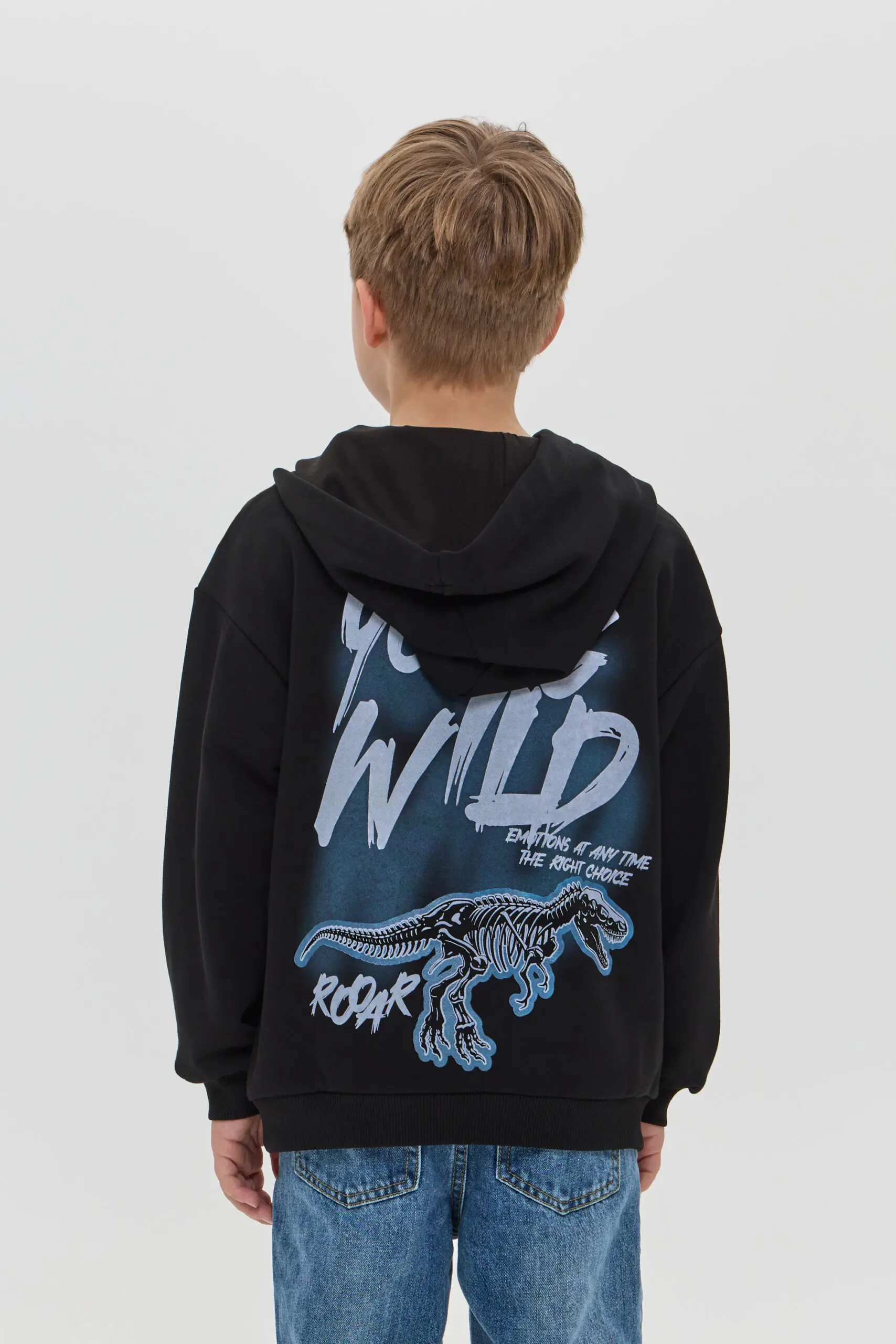 Детское худи оверсайз выполнено в базовом черном цвете — идеальный выбор для создания стильного и комфортного образа. Удобный крой не сковывает движений, что особенно важно для ... активных детей. Худи оснащено просторным капюшоном, который не только добавляет уюта, но и защищает от ветра и холода. На спине размещен крупный принт, который привлекает внимание. Мягкий и приятный на ощупь материал гарантирует комфорт в носке, а также легкость в уходе.