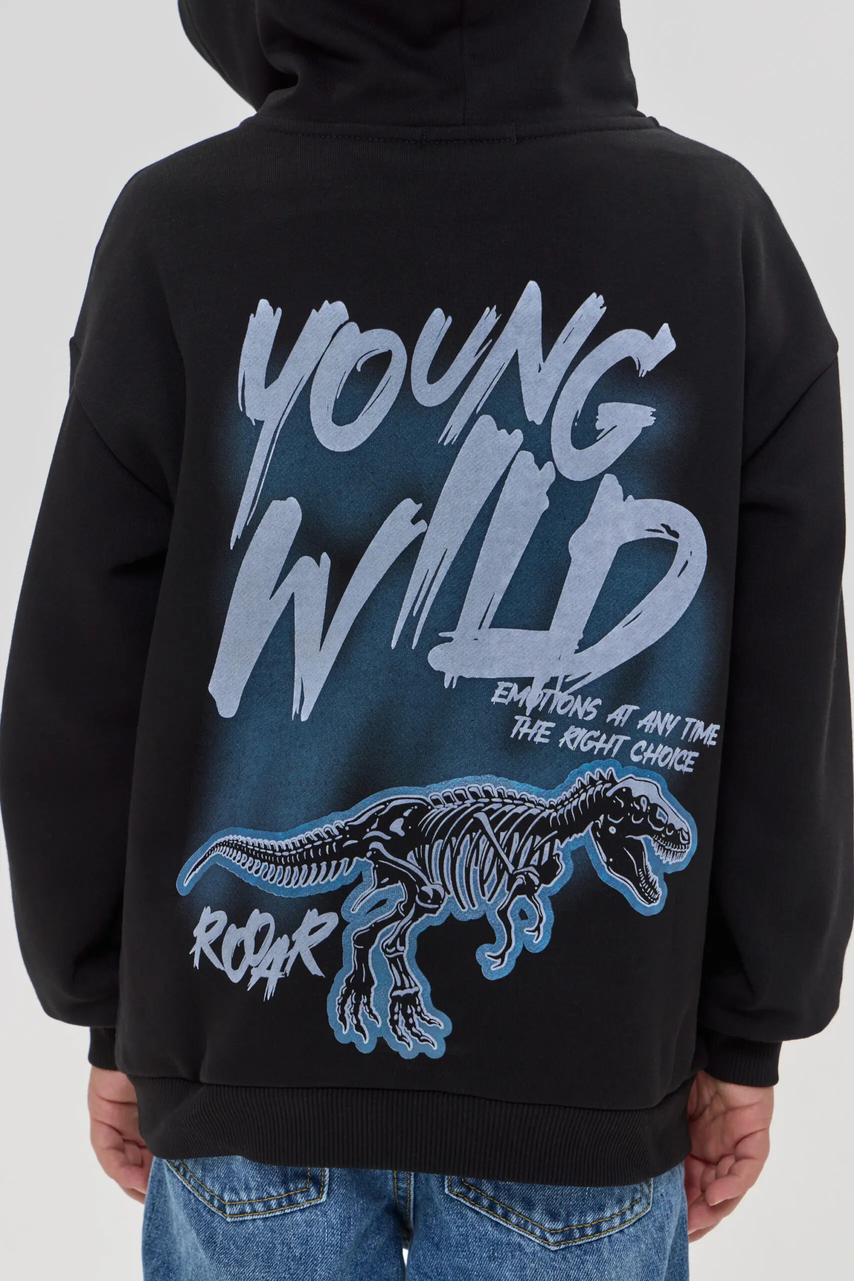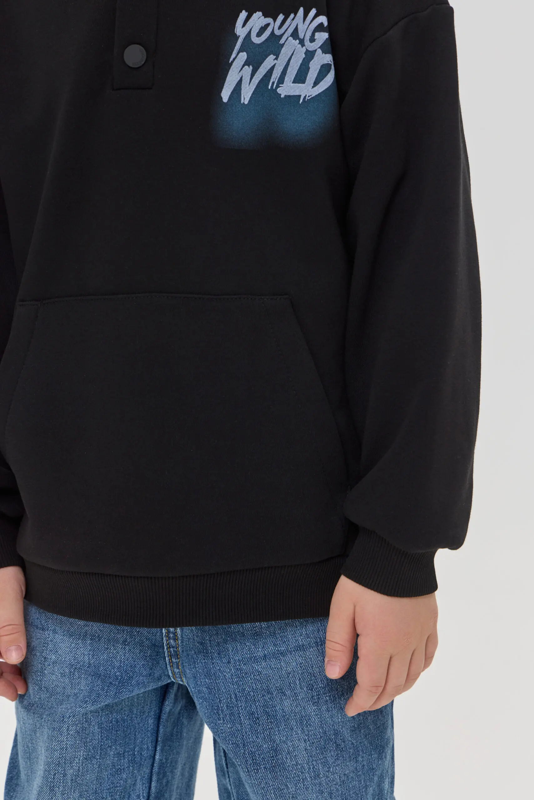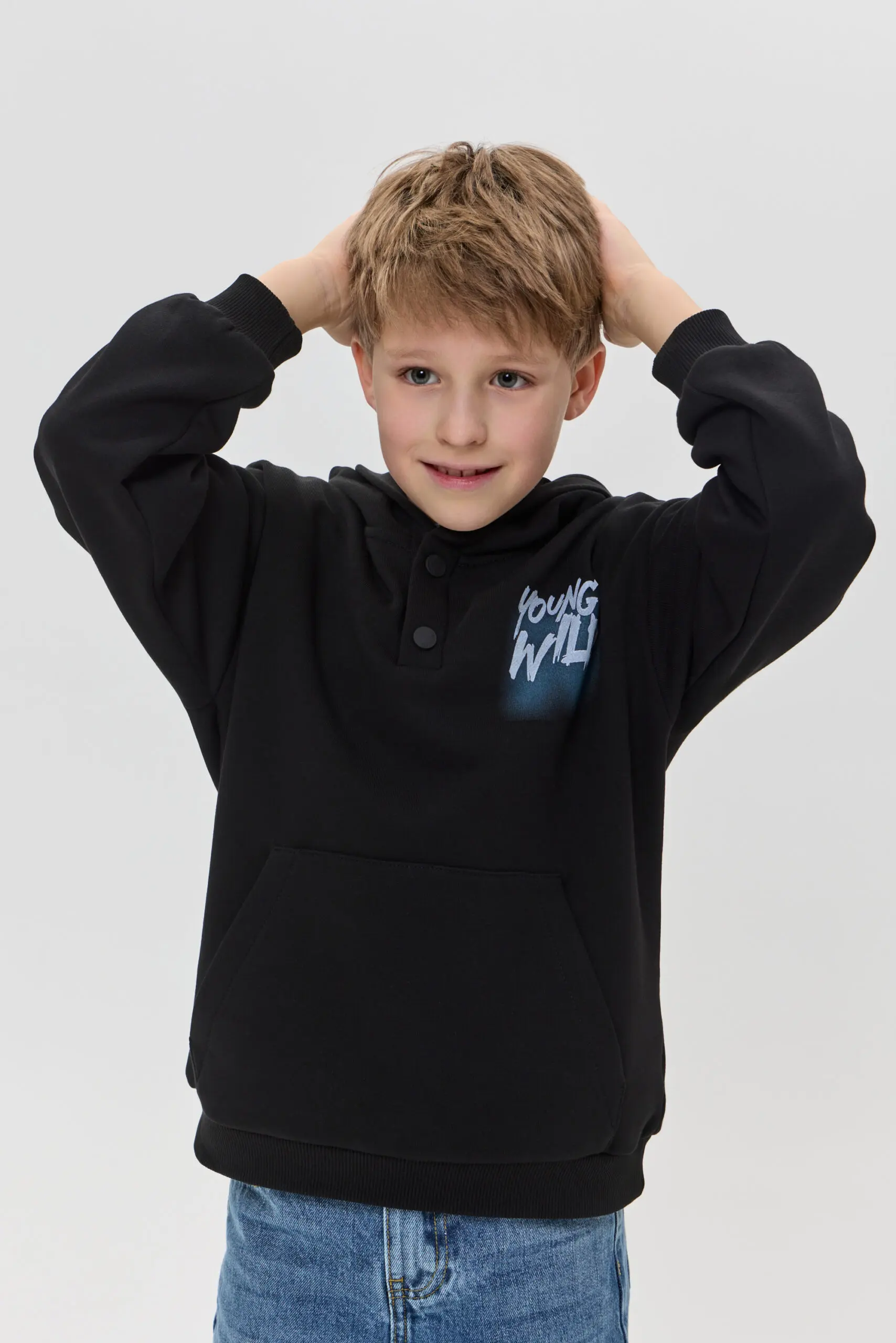 Детское худи оверсайз выполнено в базовом черном цвете — идеальный выбор для создания стильного и комфортного образа. Удобный крой не сковывает движений, что особенно важно для ... активных детей. Худи оснащено просторным капюшоном, который не только добавляет уюта, но и защищает от ветра и холода. На спине размещен крупный принт, который привлекает внимание. Мягкий и приятный на ощупь материал гарантирует комфорт в носке, а также легкость в уходе.