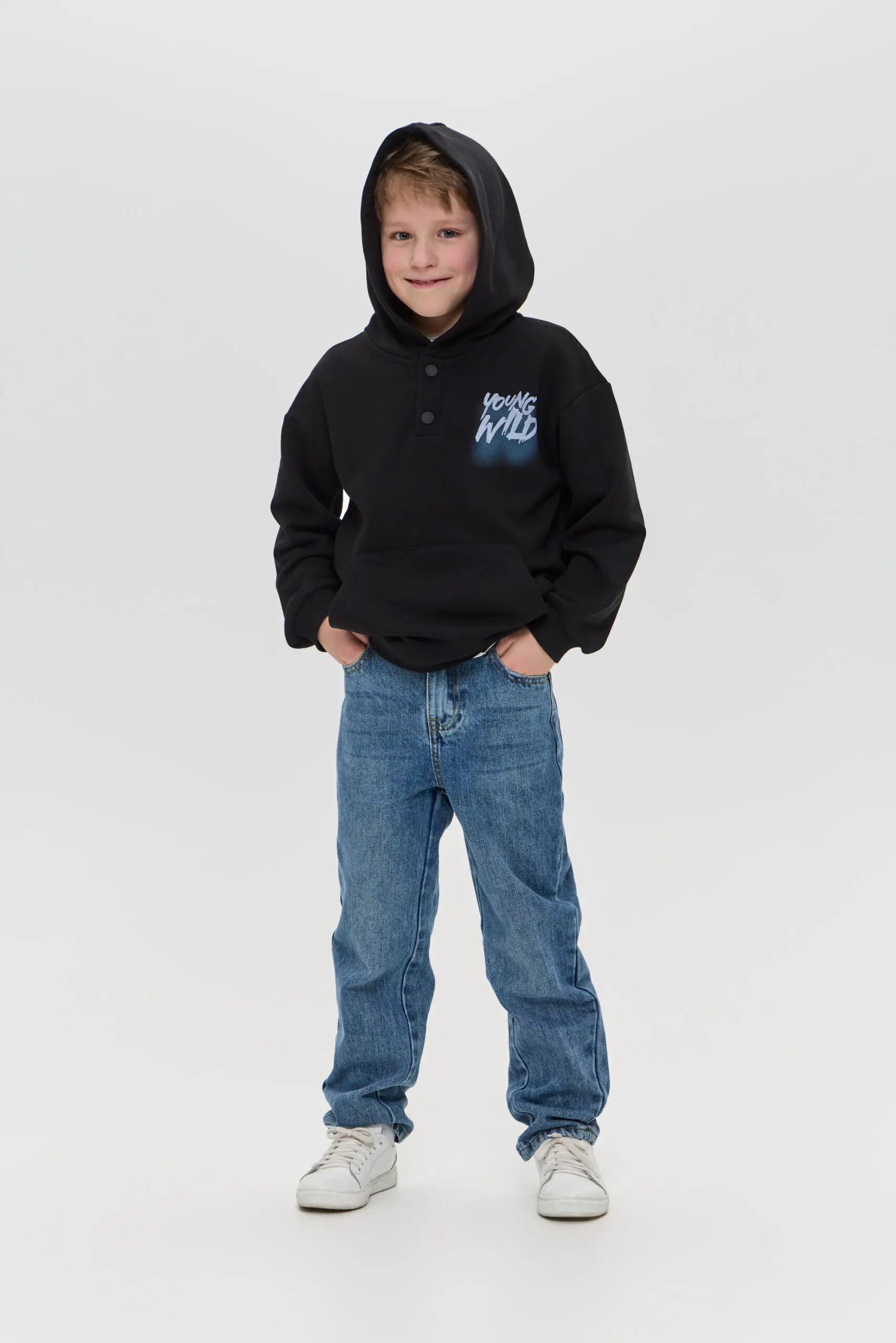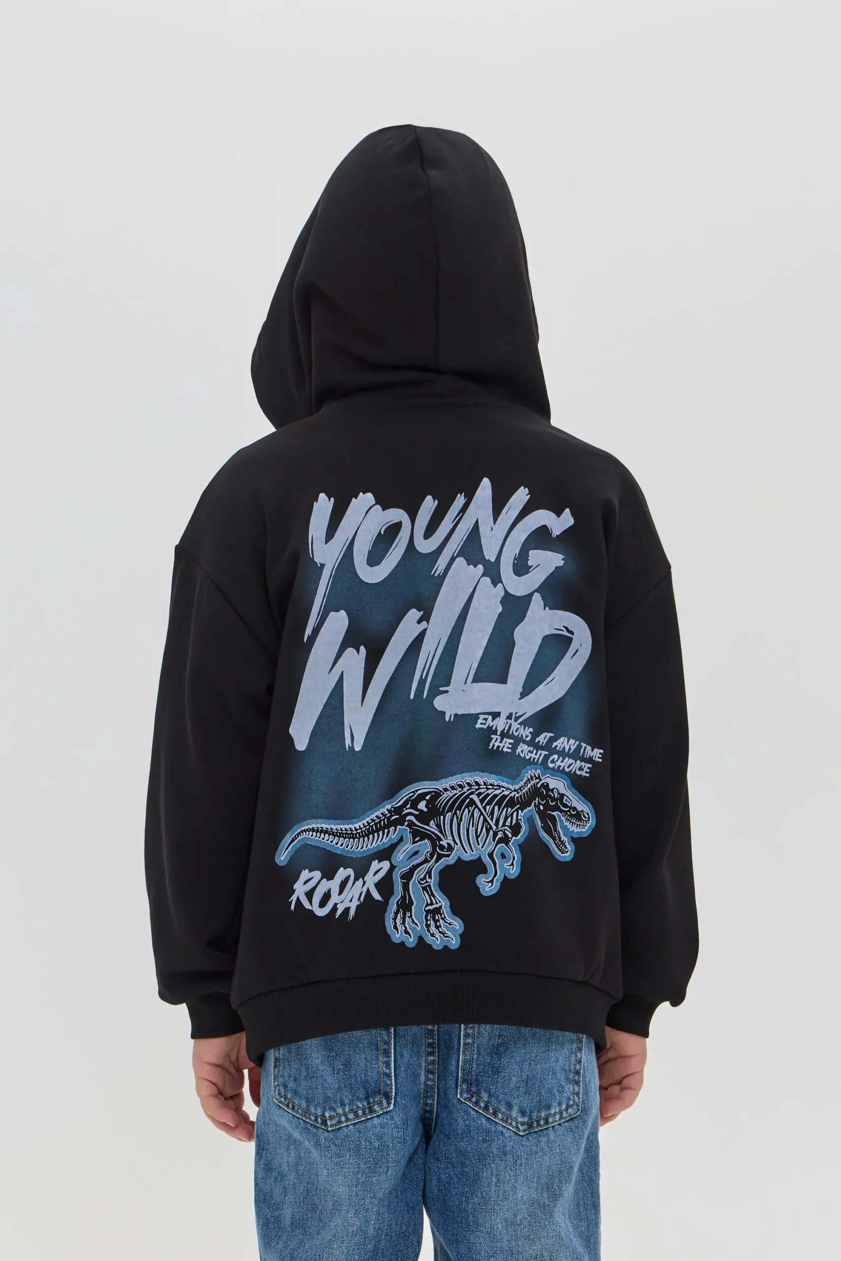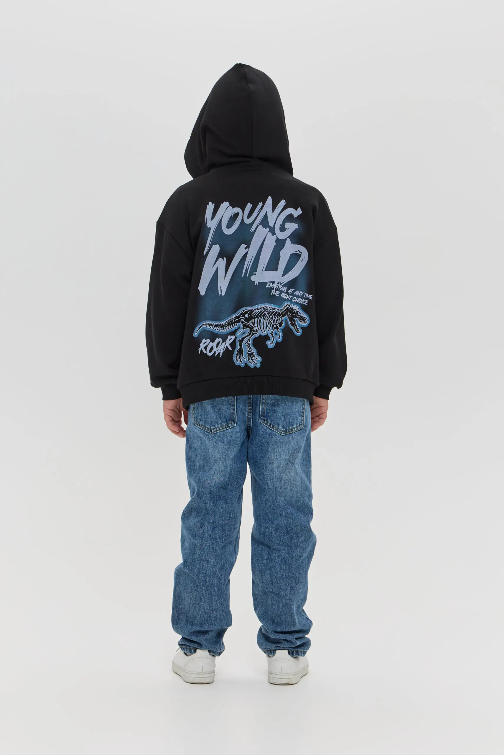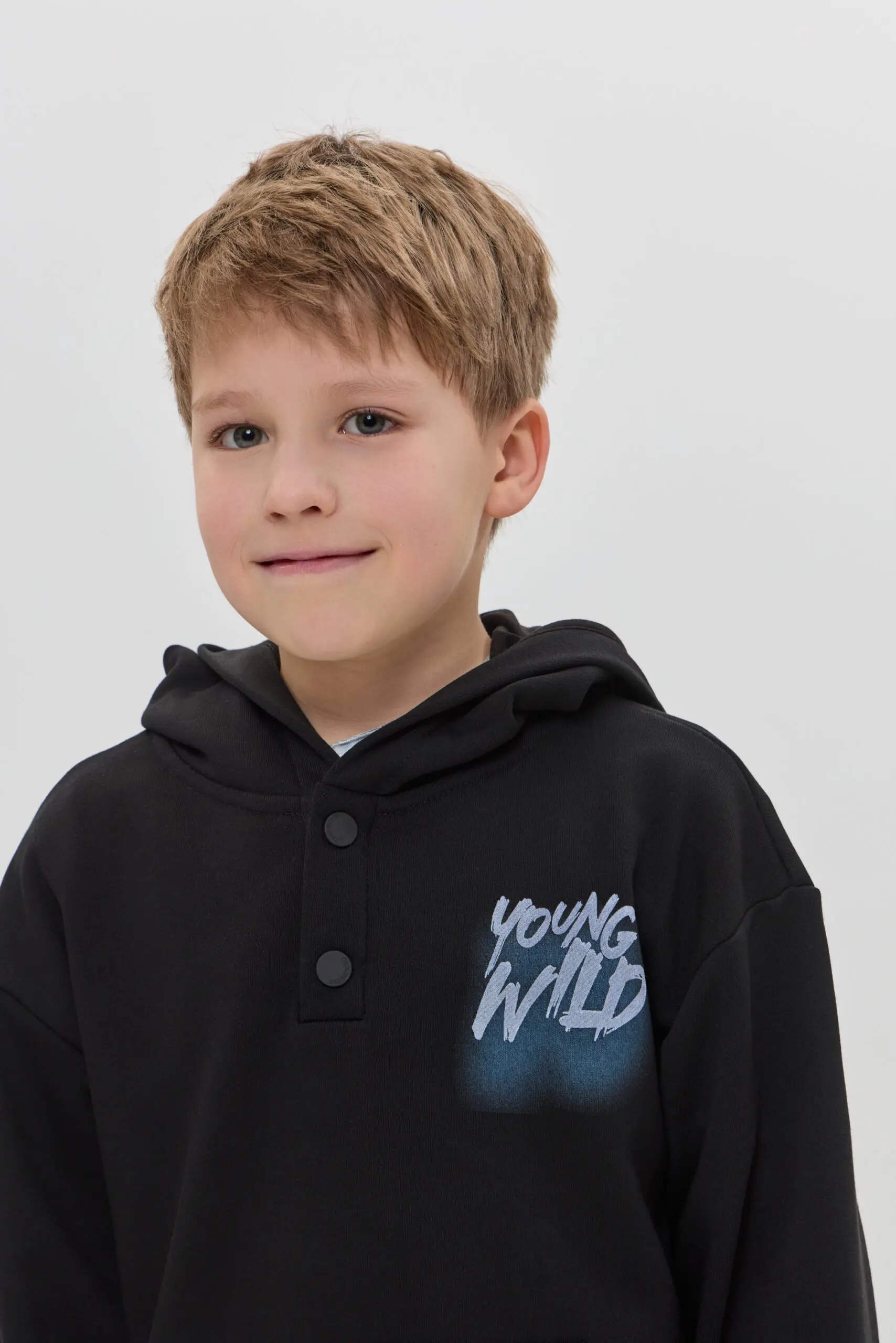 Детское худи оверсайз выполнено в базовом черном цвете — идеальный выбор для создания стильного и комфортного образа. Удобный крой не сковывает движений, что особенно важно для ... активных детей. Худи оснащено просторным капюшоном, который не только добавляет уюта, но и защищает от ветра и холода. На спине размещен крупный принт, который привлекает внимание. Мягкий и приятный на ощупь материал гарантирует комфорт в носке, а также легкость в уходе.
