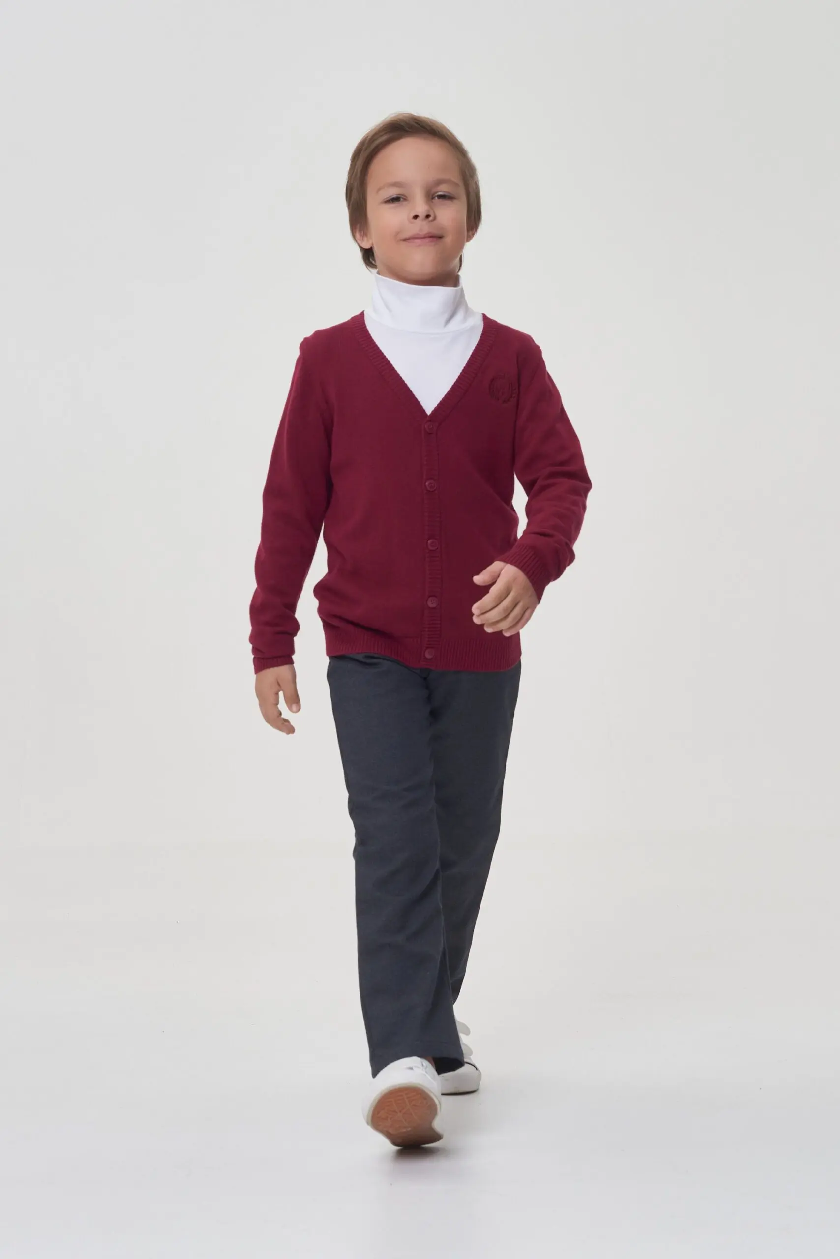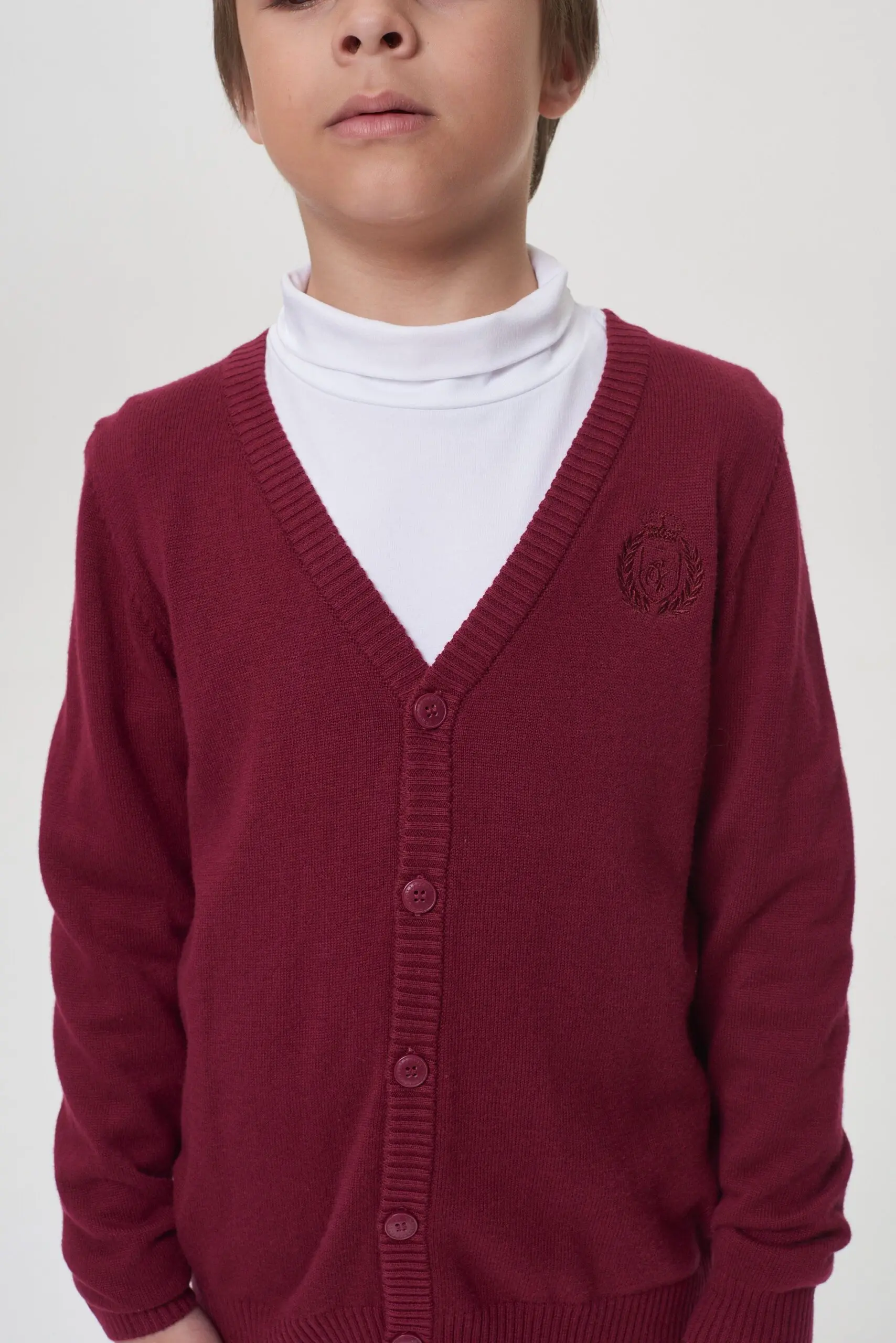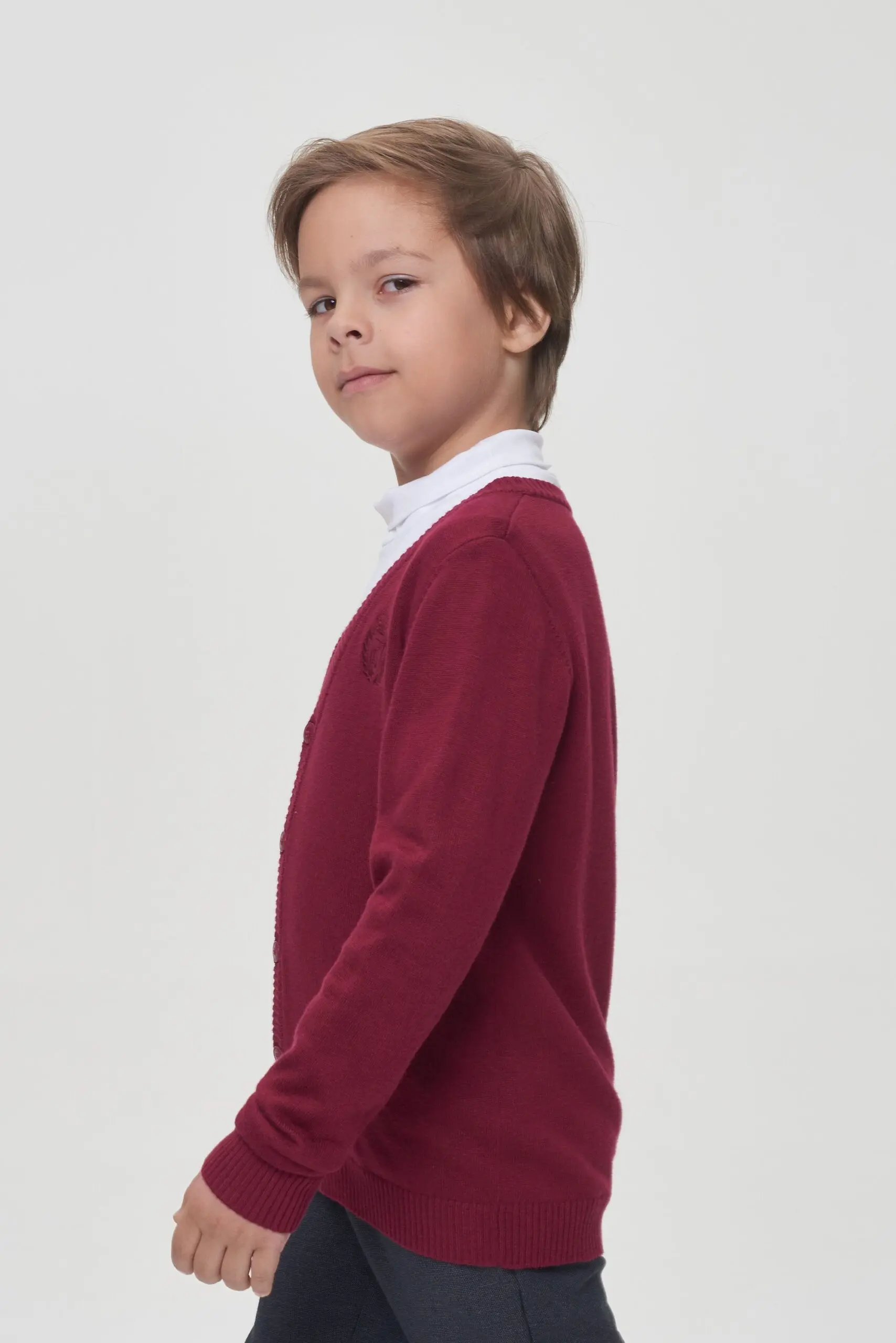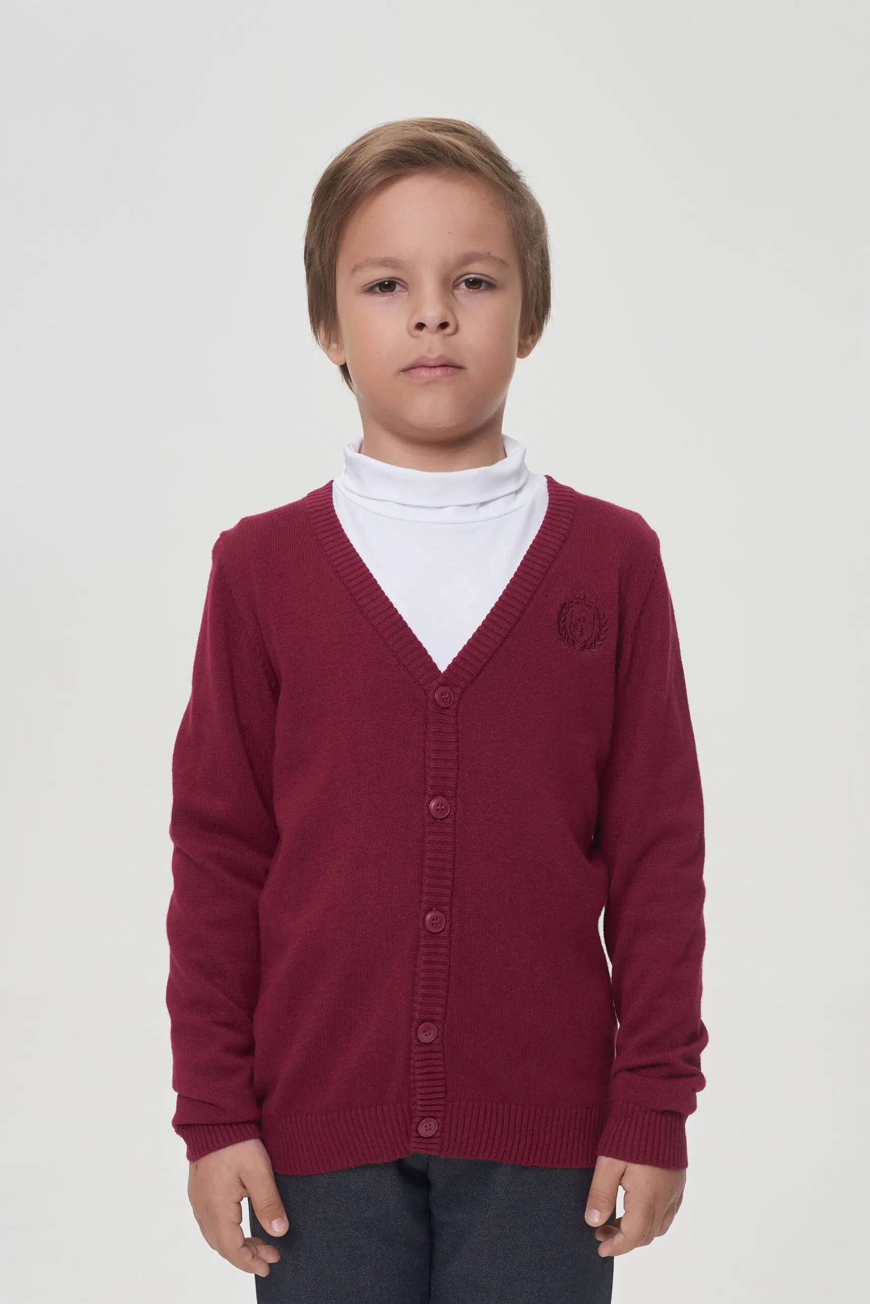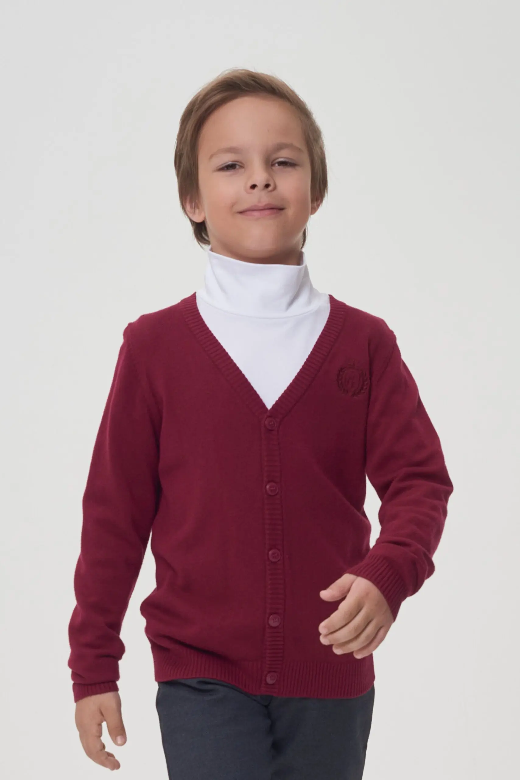 Трикотажный кардиган благородного оттенка «бордо» составит неплохую компанию классическим брюкам или джинсам. Этот наряд позволит ребенку стать одним из самых модных среди сверстников! Вязаная вещь − ... основа гардероба в прохладную погоду. С такой одеждой легко превратить повседневный лук в деловой образ, подобрав сорочку или водолазку по цвету. Элегантная удобная модель прямого покроя на пуговицах создаст серьезный имидж ученика.
