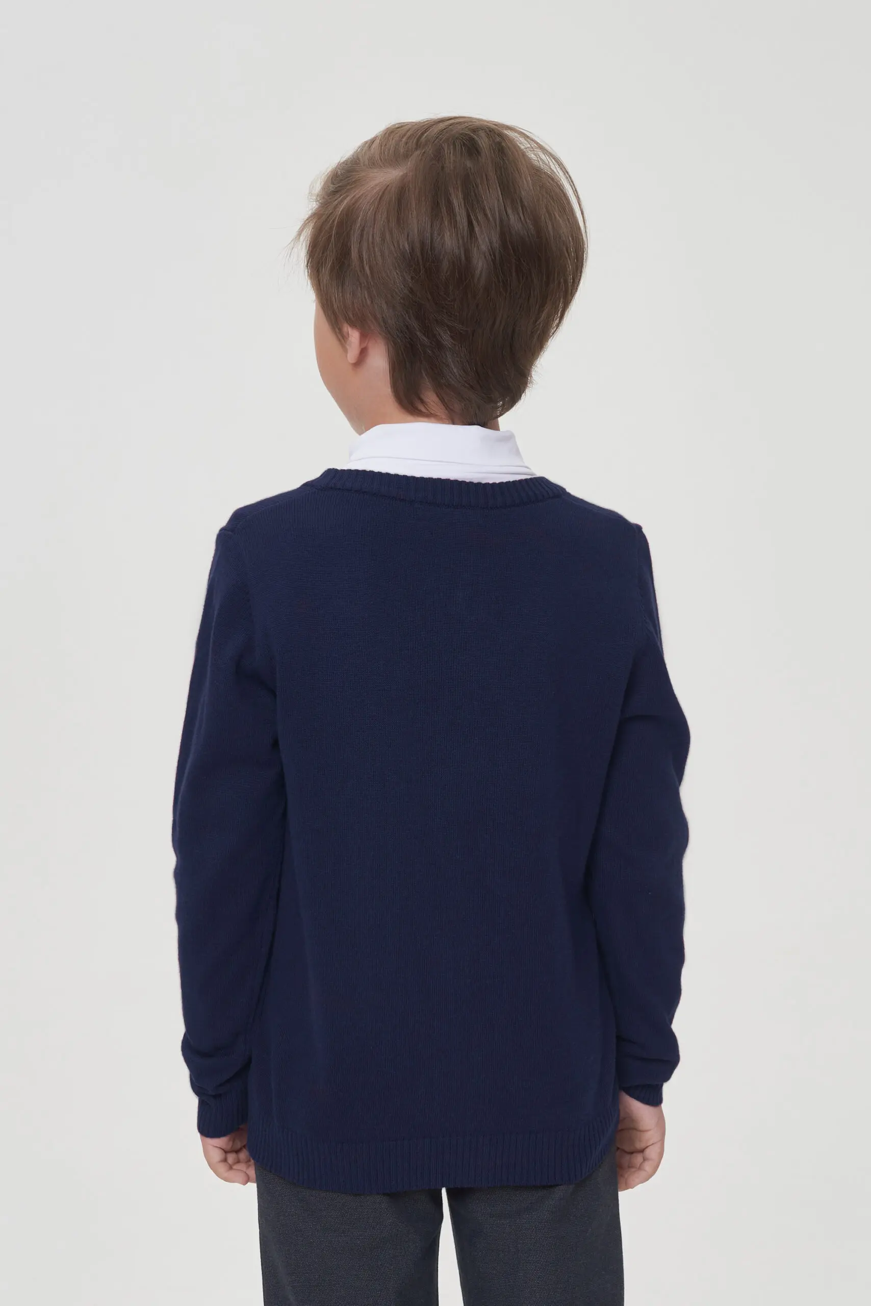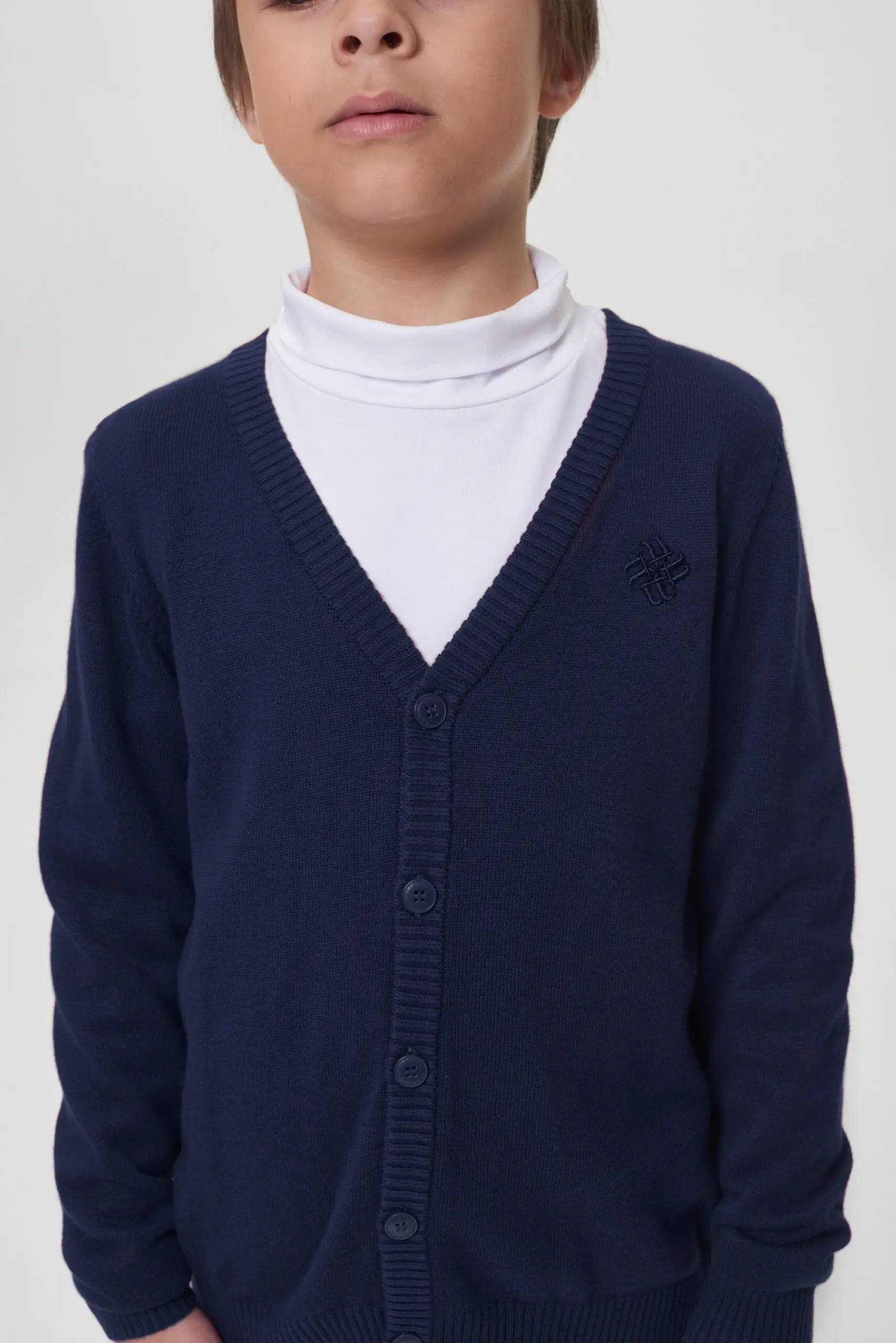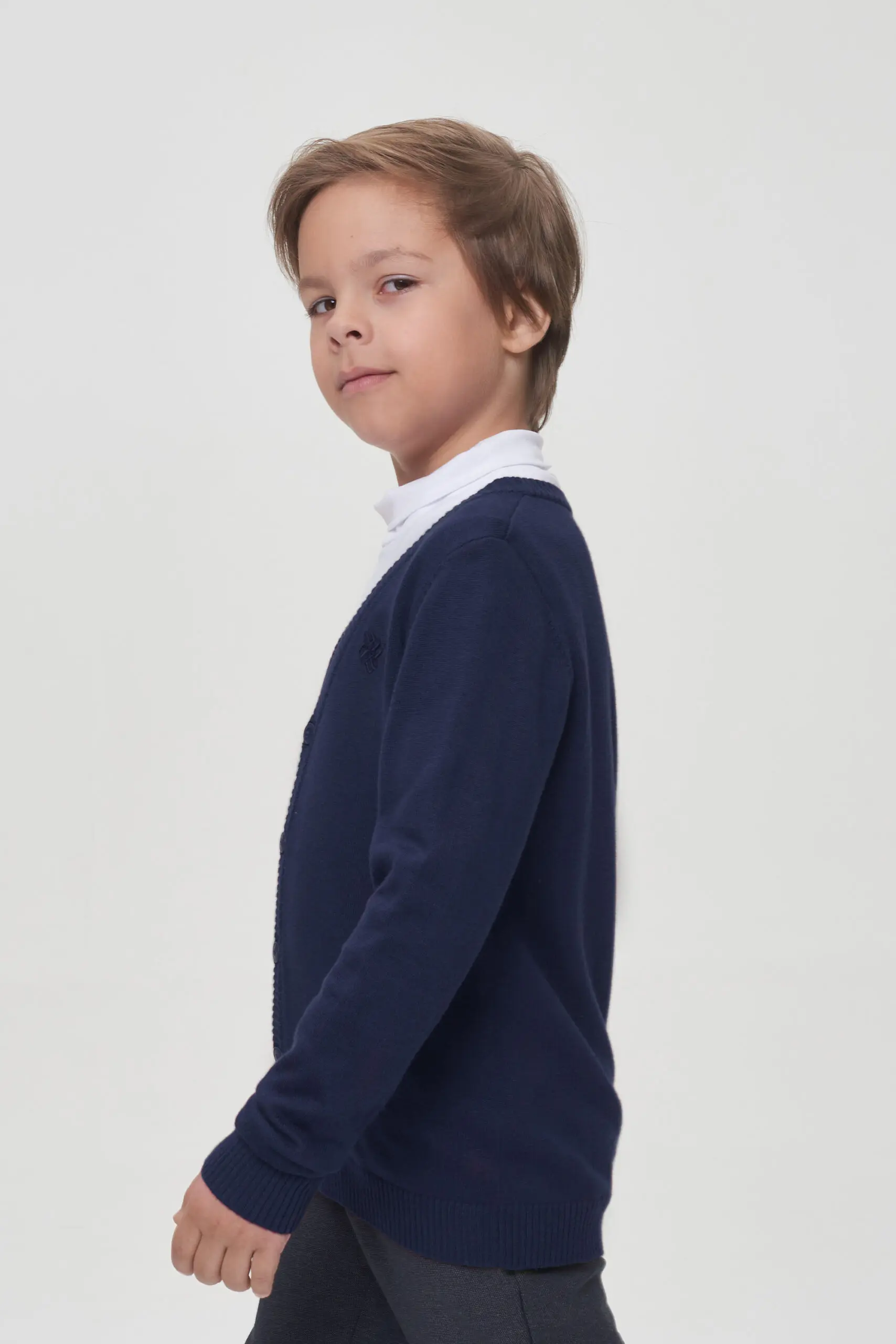 Классический вязаный кардиган прямого силуэта − альтернатива традиционному пиджаку! Синий цвет не такой строгий как чёрный, но достаточно сдержанный, чтобы ребенок чувствовал себя естественно в школе. ... Приятная во всех отношениях модель застегивается на стильные клубные пуговицы и декорирована эмблемой бренда. Такая вещь хорошо сочетается с сорочкой белого или голубого цвета. Пряжа высшего качества не образует катышков, наряд будет долго сохранять безупречный вид.