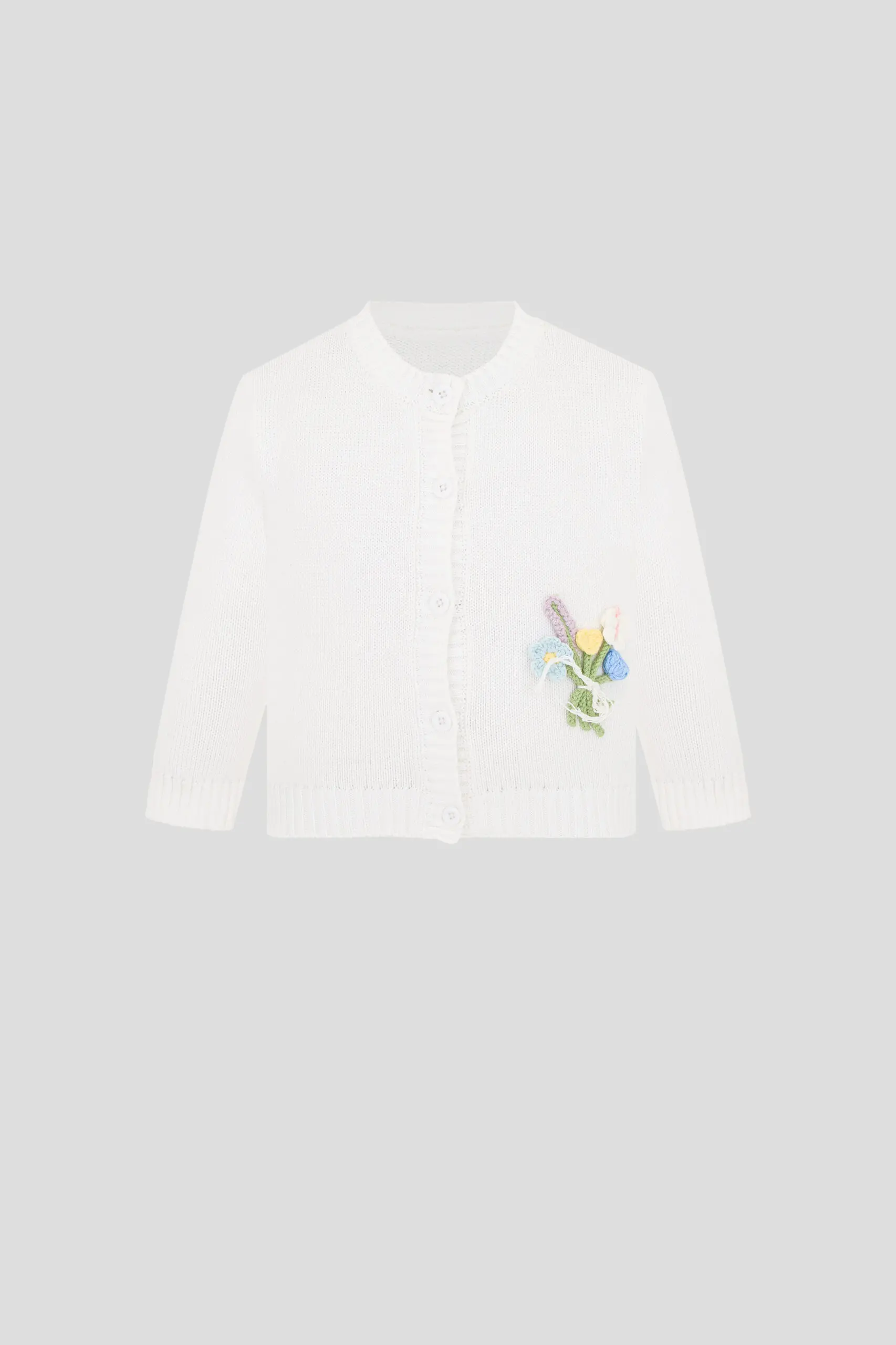 Вязаный кардиган для девочки выполнен в нежном оттенке экрю. Модель станет прекрасным дополнением к любому детскому гардеробу. Нежный цвет и изысканный декор в виде объемных цветов ... придают модели утонченный вид. Кардиган оснащен удобной застежкой на пуговиуы, что делает его легким в использовании. Эластичные манжеты и отделка пояса не только добавляют стильный акцент, но и обеспечивают надежную посадку, защищая ребёнка от ветра и холода. Выполненный из 100% хлопка, кардиган обеспечивает максимальный комфорт и тепло в прохладную погоду.