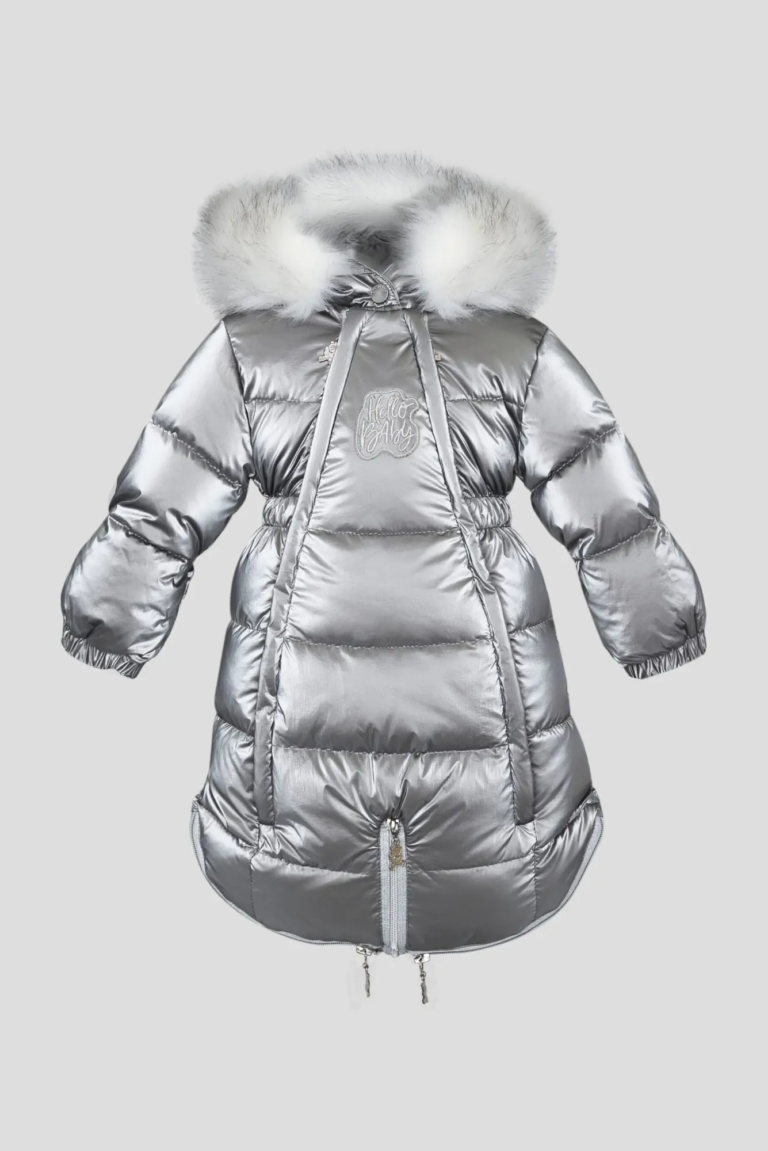 Модель имеет три слоя: внешний непромокаемый слой серебристого-серого цвета, затем утеплитель из пуха и с внутренней стороны снежно-белая хлопковая подкладка.