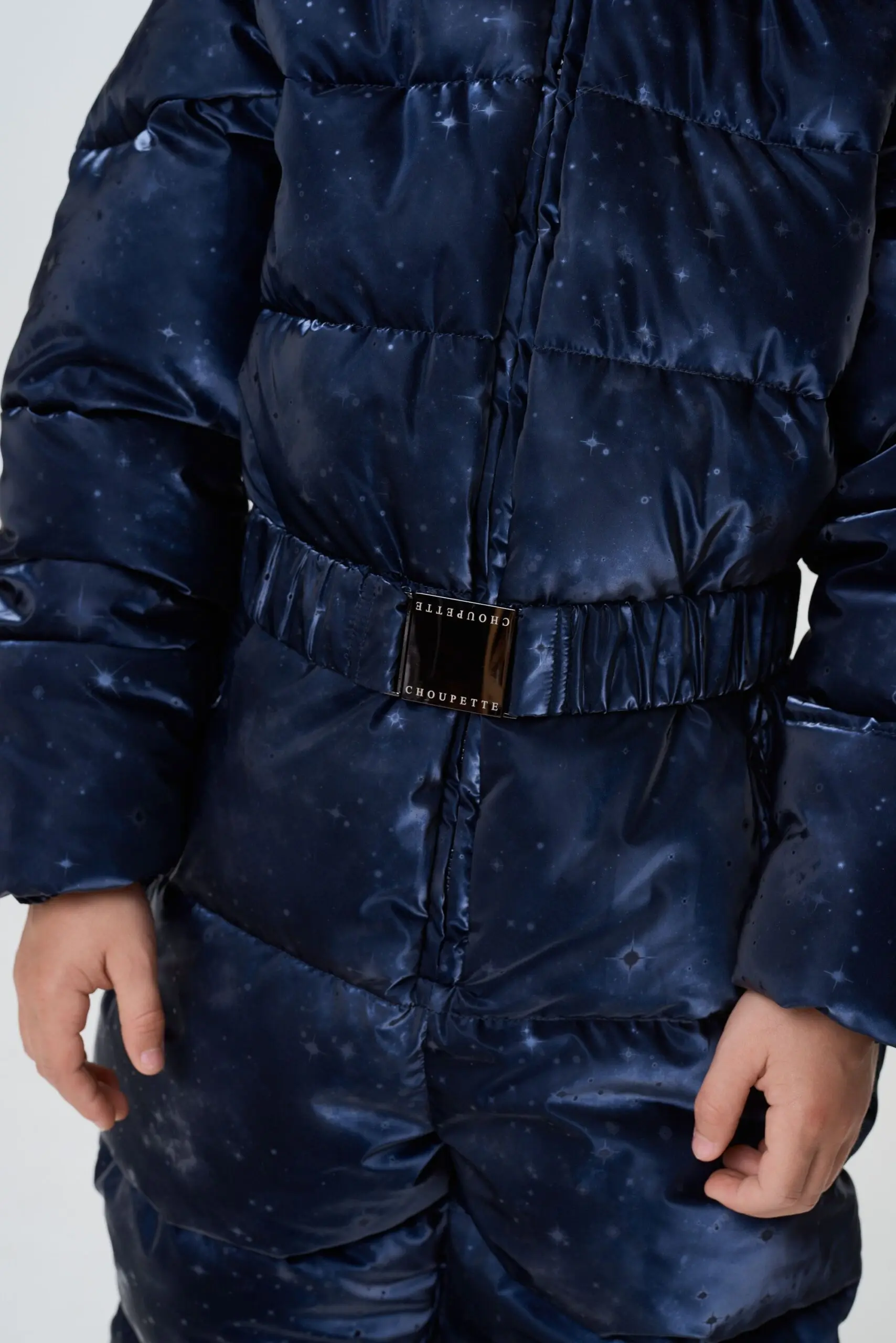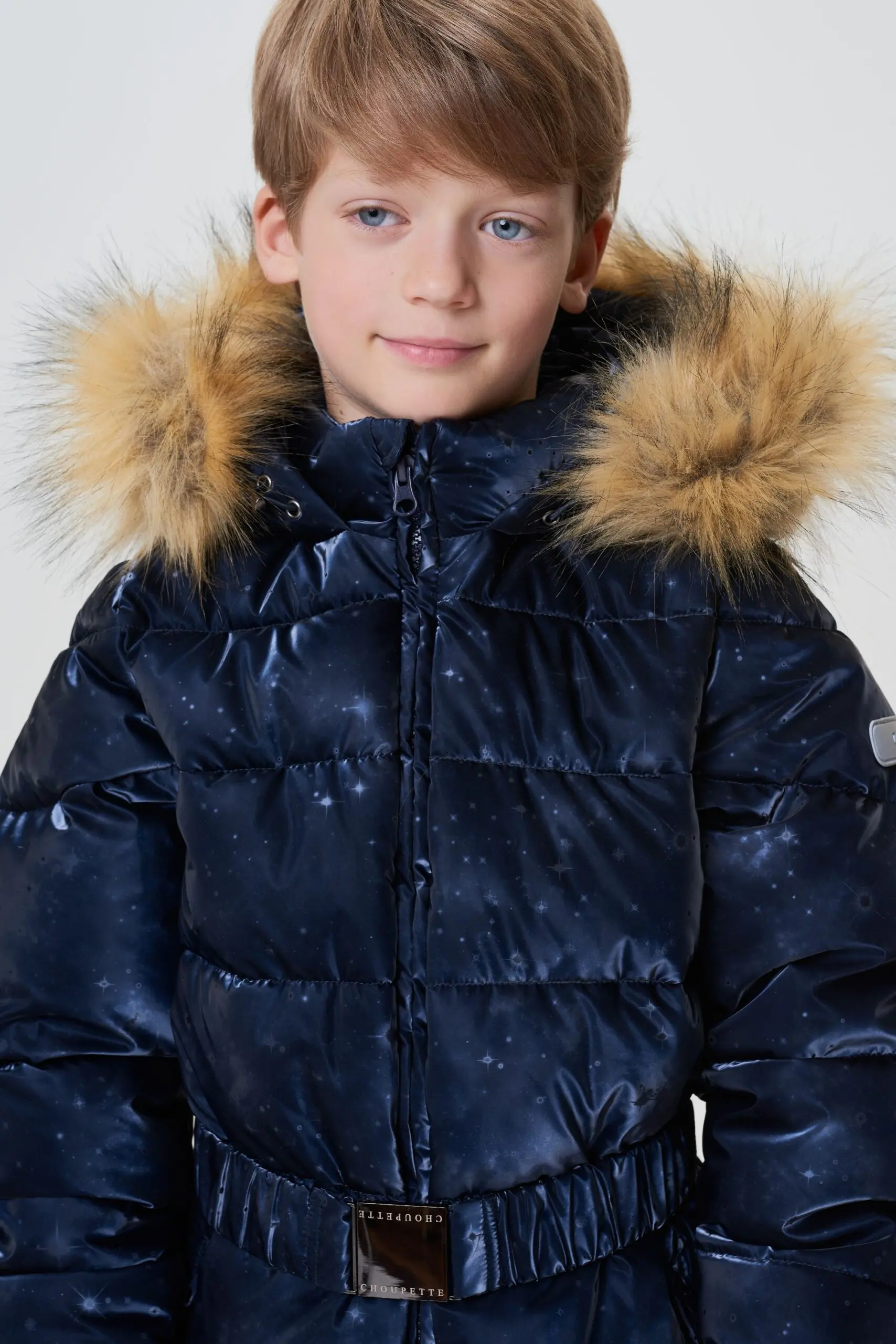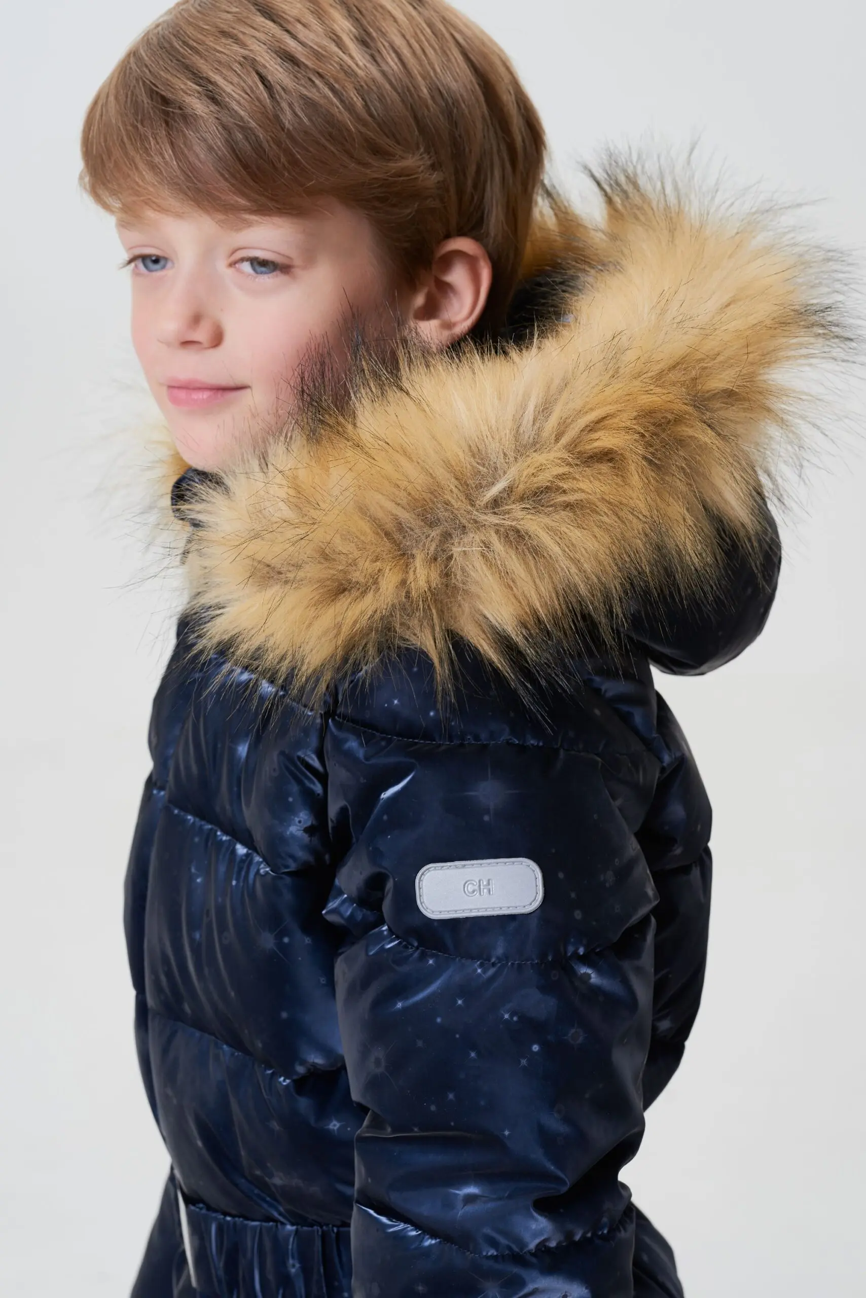 Наряд с капюшоном, с меховой опушкой, выполнен из непродуваемой ткани синего цвета с оригинальным дизайнерским ... принтом.