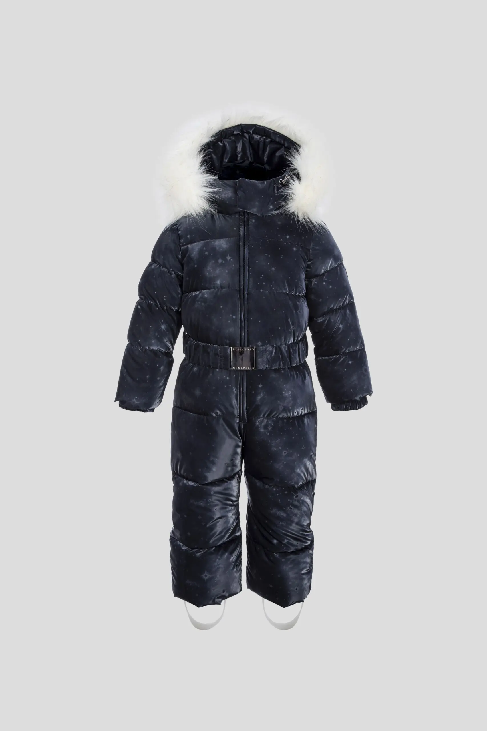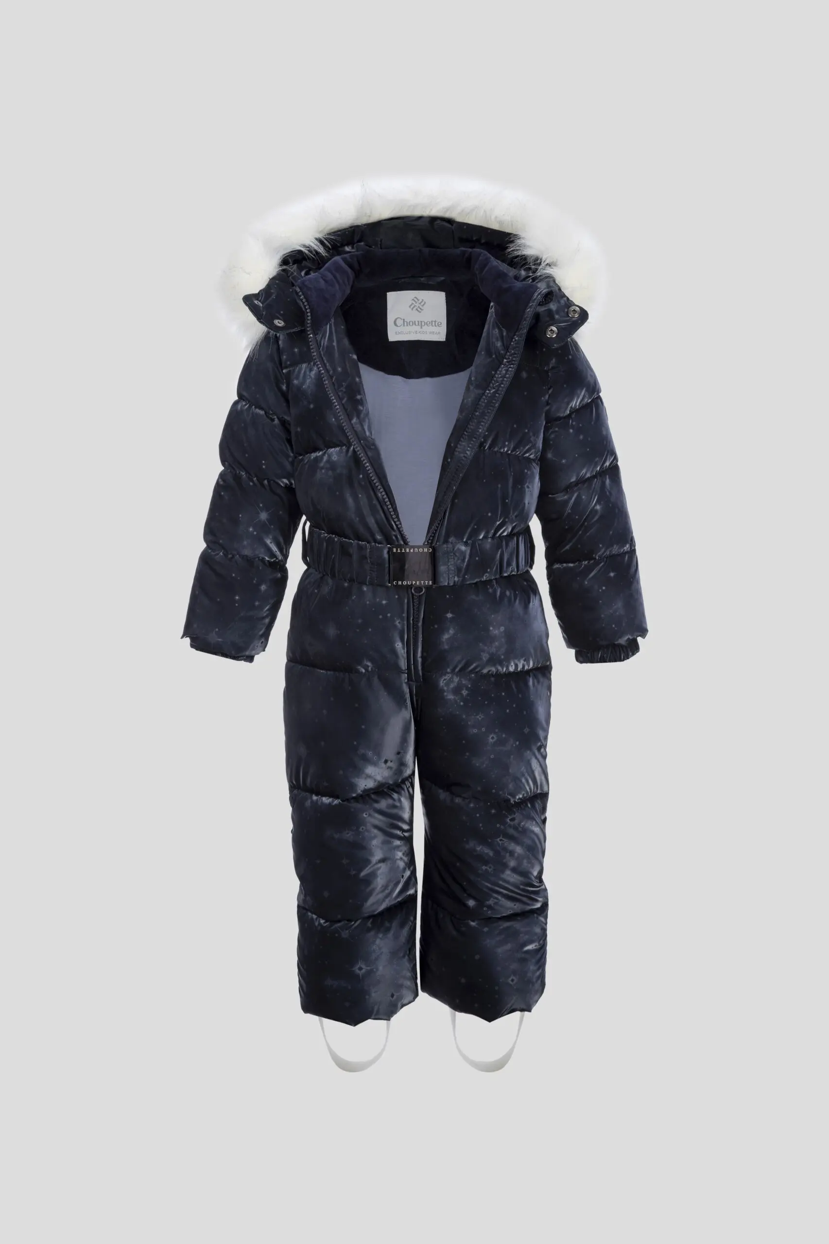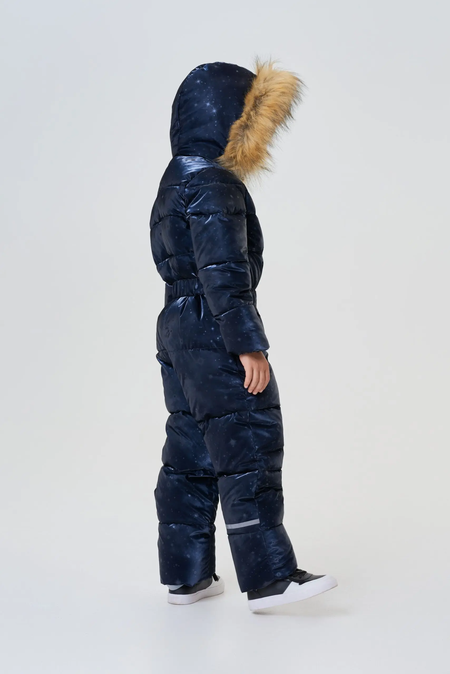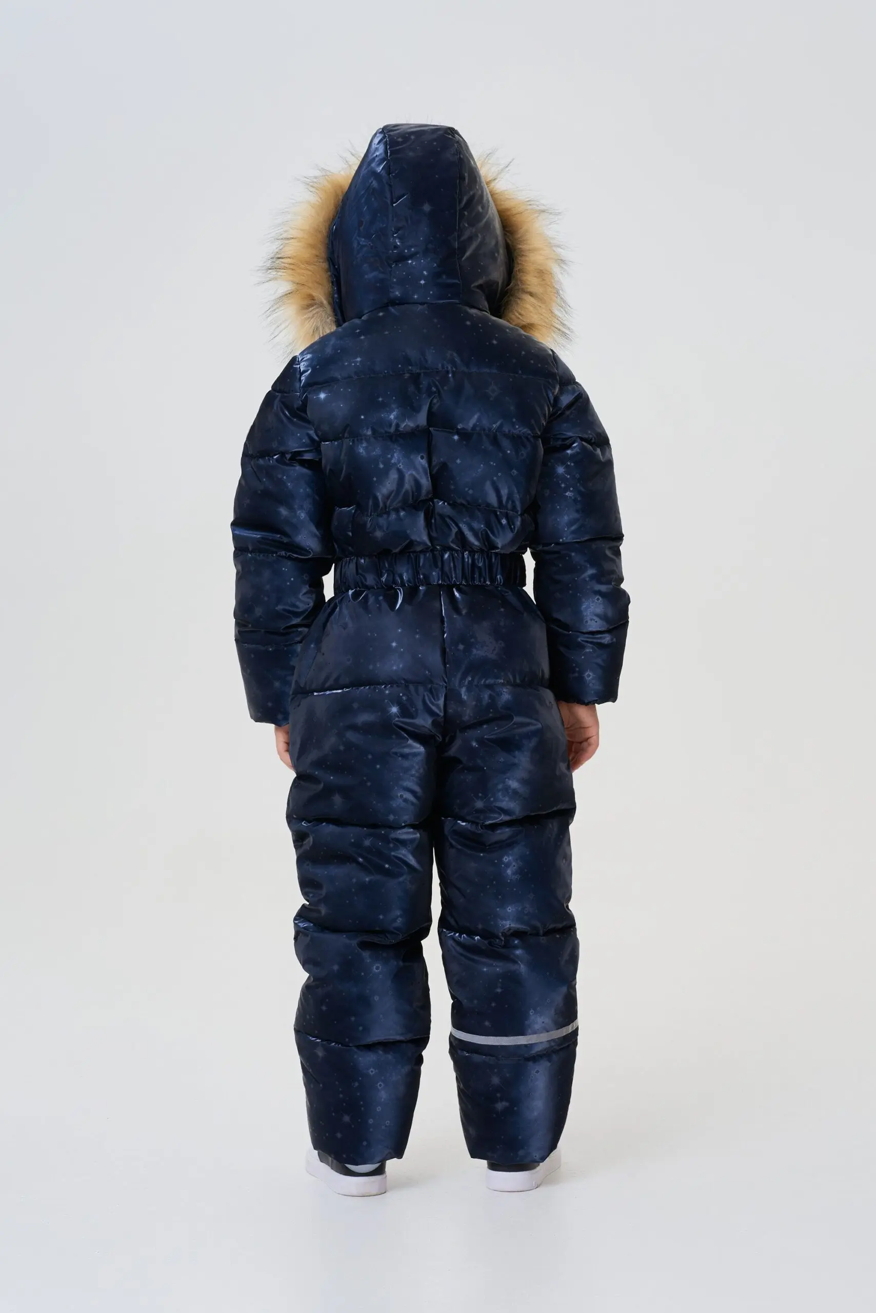 Наряд с капюшоном, с меховой опушкой, выполнен из непродуваемой ткани синего цвета с оригинальным дизайнерским ... принтом.