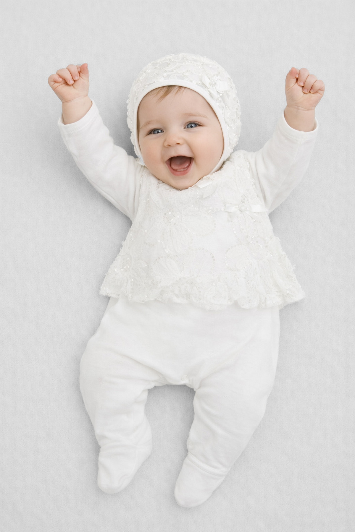 Нарядный комплект с цветочным кружевом станет прекрасным решением для особенного события, такого как выписка из роддома. Комбинезон изготовлен из 100% хлопкового волокна, мягкая, приятная телу ткань ... не вызывает раздражений, обеспечивает оптимальную циркуляцию воздуха, что не мало важно для новорожденных малышей. Чепчик, декорированный кружевом, гармонично завершает праздничный облик. Практичная застежка на кнопках, расположенная на плечиках и вдоль ножек, значительно упрощает процесс переодевания.