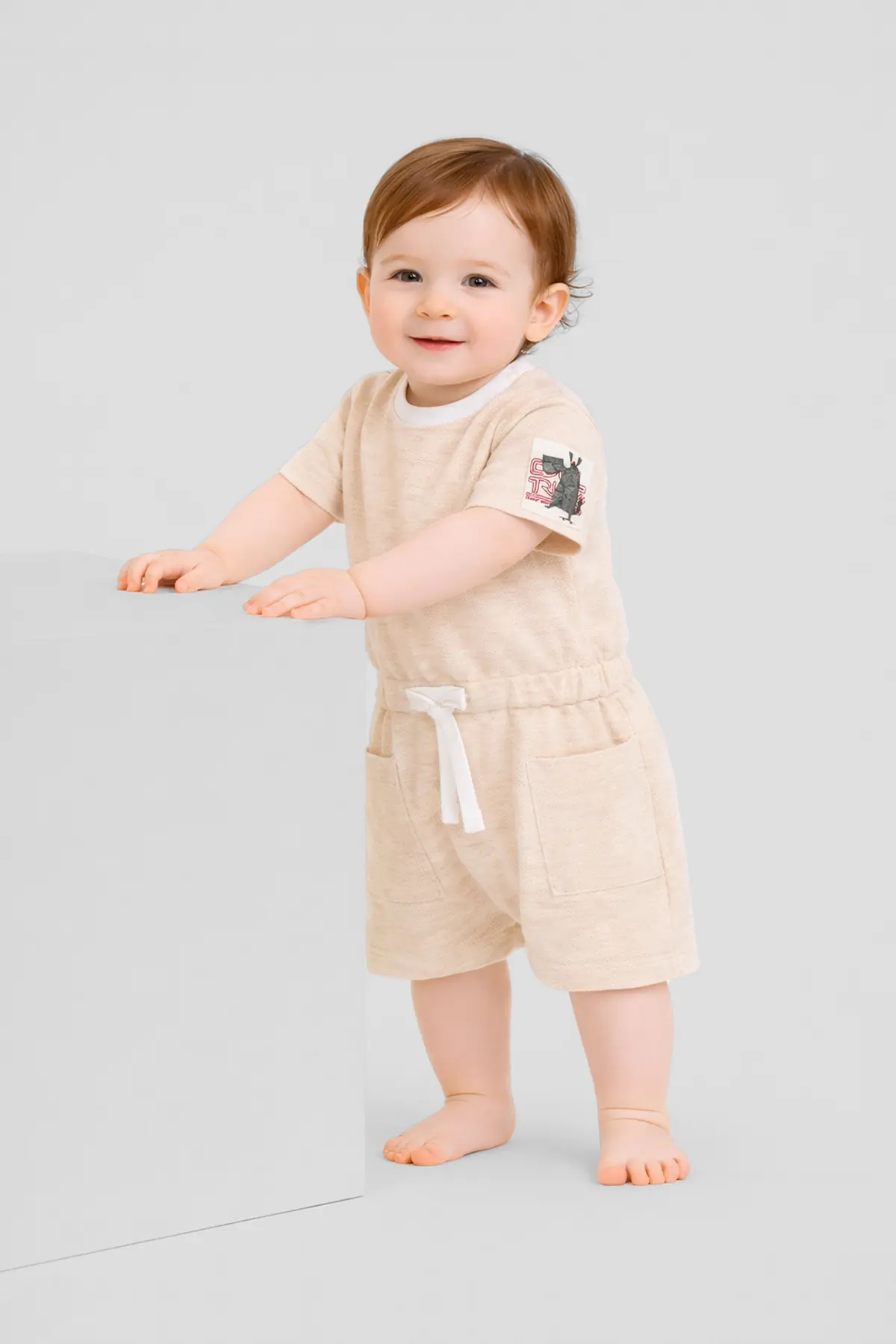 Очаровательный комбинезон для мальчика станет стильным и удобным решением для летнего гардероба. Изделие выполнено из лёгкого материала с мягкой текстурой, который обеспечивает комфорт и подходит для ... активного дня. Свободная форма с короткими рукавами и укороченными штанинами создаёт ощущение лёгкости и не стесняет движений. Эластичная линия талии дополнена завязкой, позволяя регулировать посадку и добавляя образу аккуратный акцент. Два вместительных кармана делают модель более функциональной и практичной. Минималистичное оформление подчёркивается контрастной отделкой горловины, придающей изделию свежий и современный вид. Такой комбинезон отлично подойдёт для прогулок, игр и повседневных образов, легко сочетаясь с различными аксессуарами и обувью.
