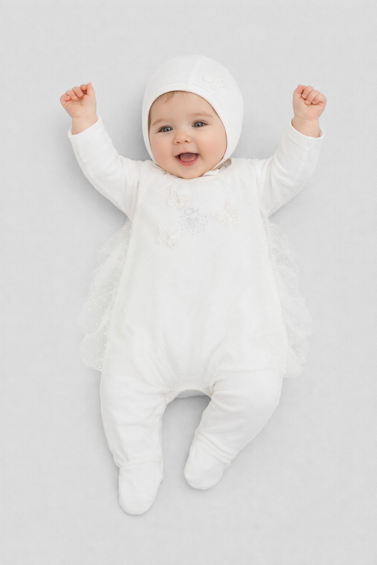Нарядный детский комбинезон с кружевом - отличное решение как для торжественной выписки из роддома, так и семейных праздников. Модель свободного кроя. Боковые застежки-кнопки значительно облегчают смену ... одежды, что является важным преимуществом и для ребенка, и для его родителей. Декорирован комбинезон кружевом, стразами и объемными бабочками. Дополняет комплект трикотажный чепчик на завязках. Выполнено изделие из натурального хлопкового материала.