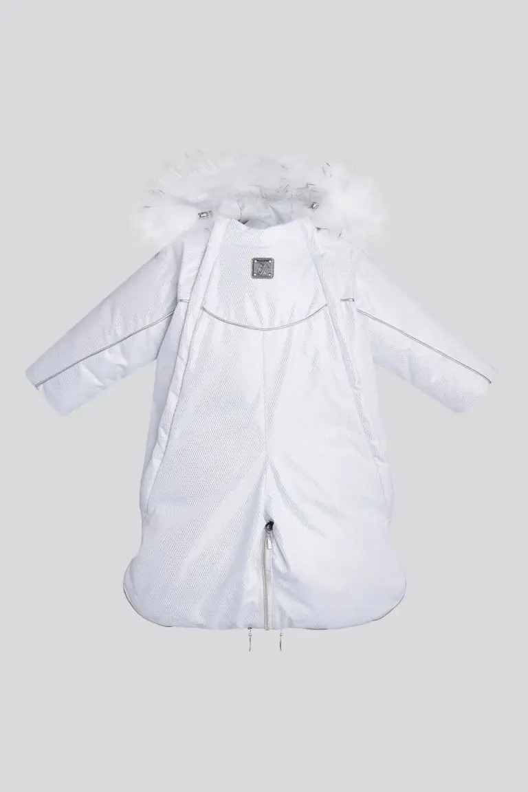 Серебристо-белый конверт-комбинезон с фигурной кокеткой и кожаным шевроном для девочки подарит уютное тепло во время прогулки в зимнюю непогоду.