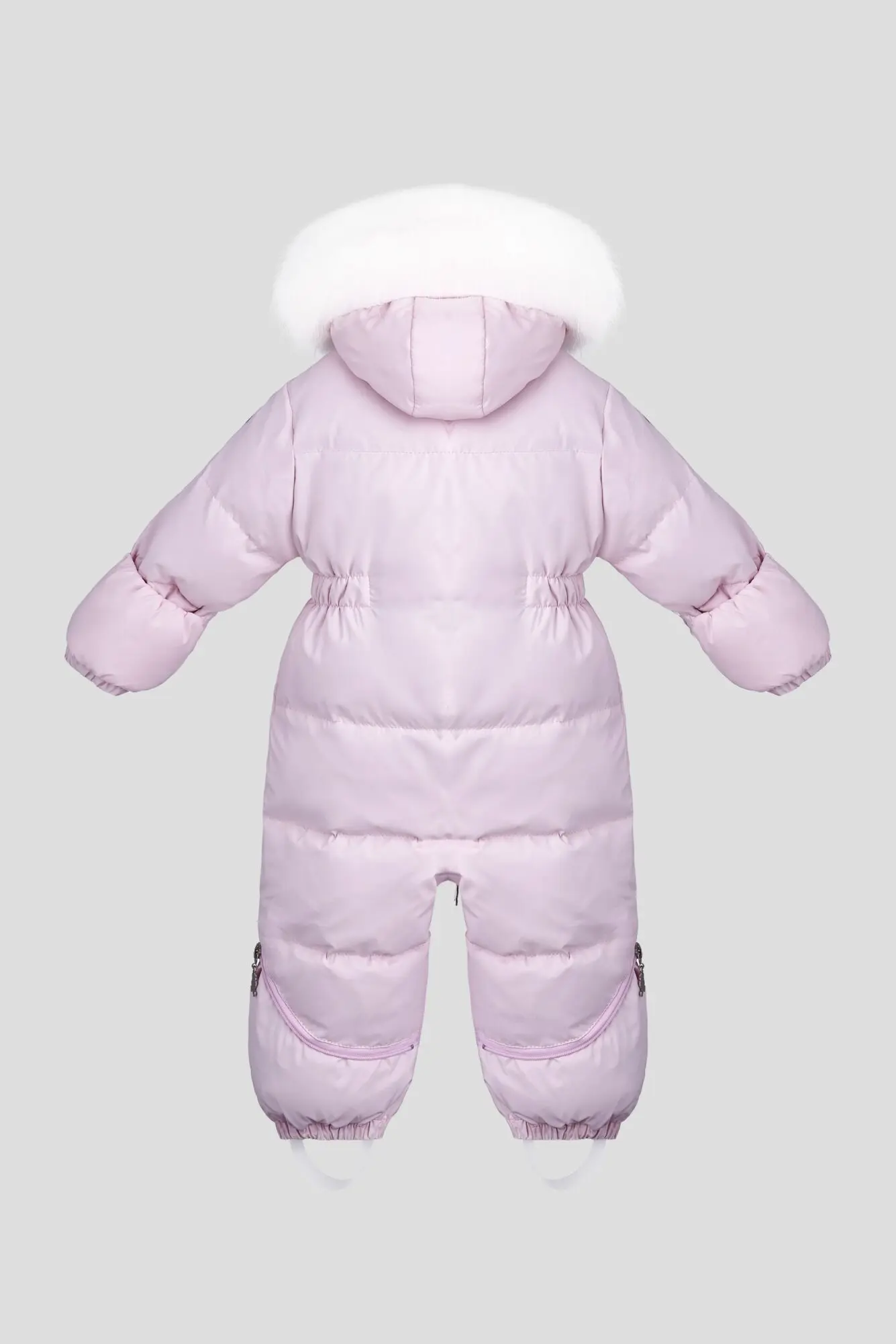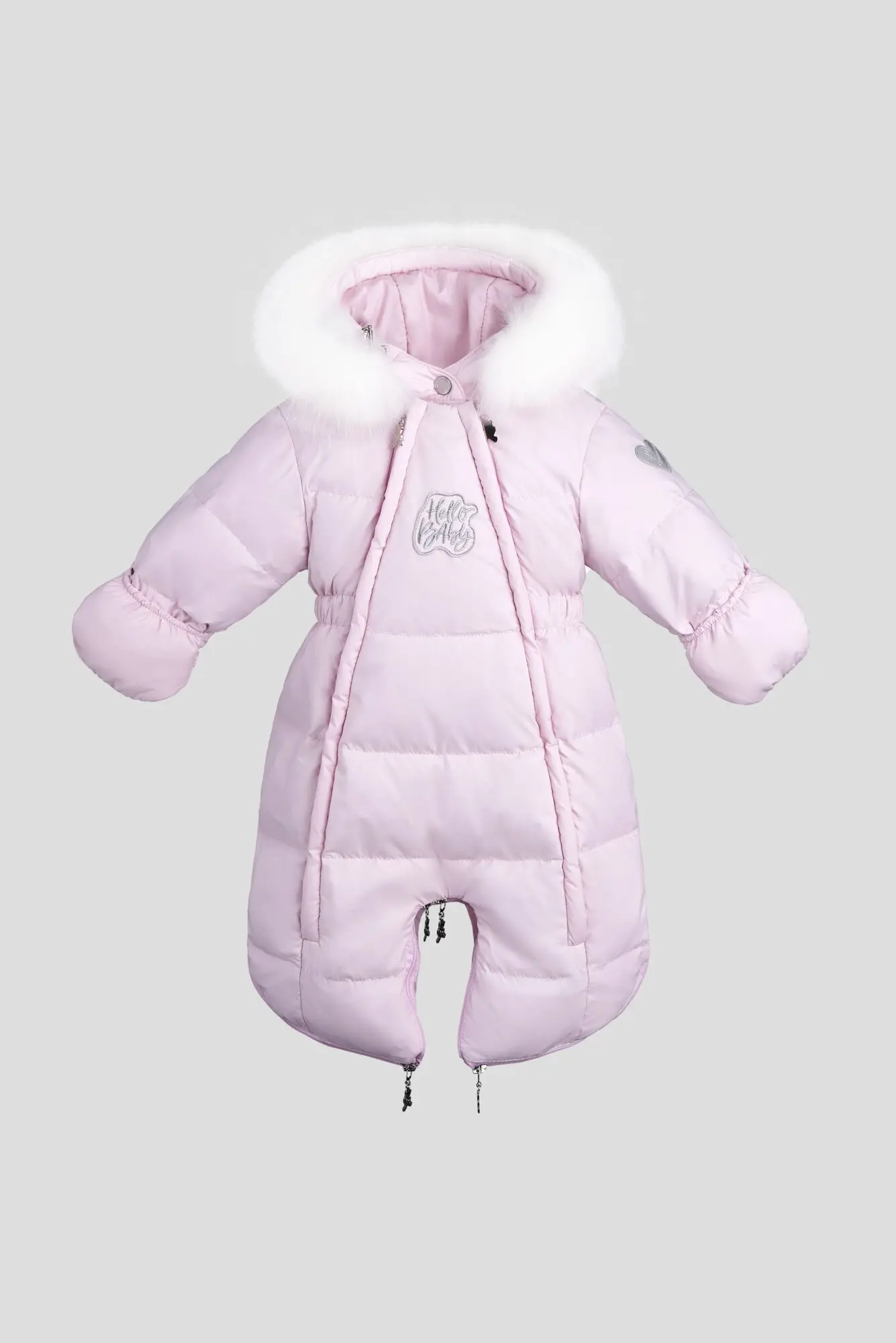 Стеганый конверт-комбинезон холодного розового цвета для девочки надежно согреет малышку в морозы и снегопады.