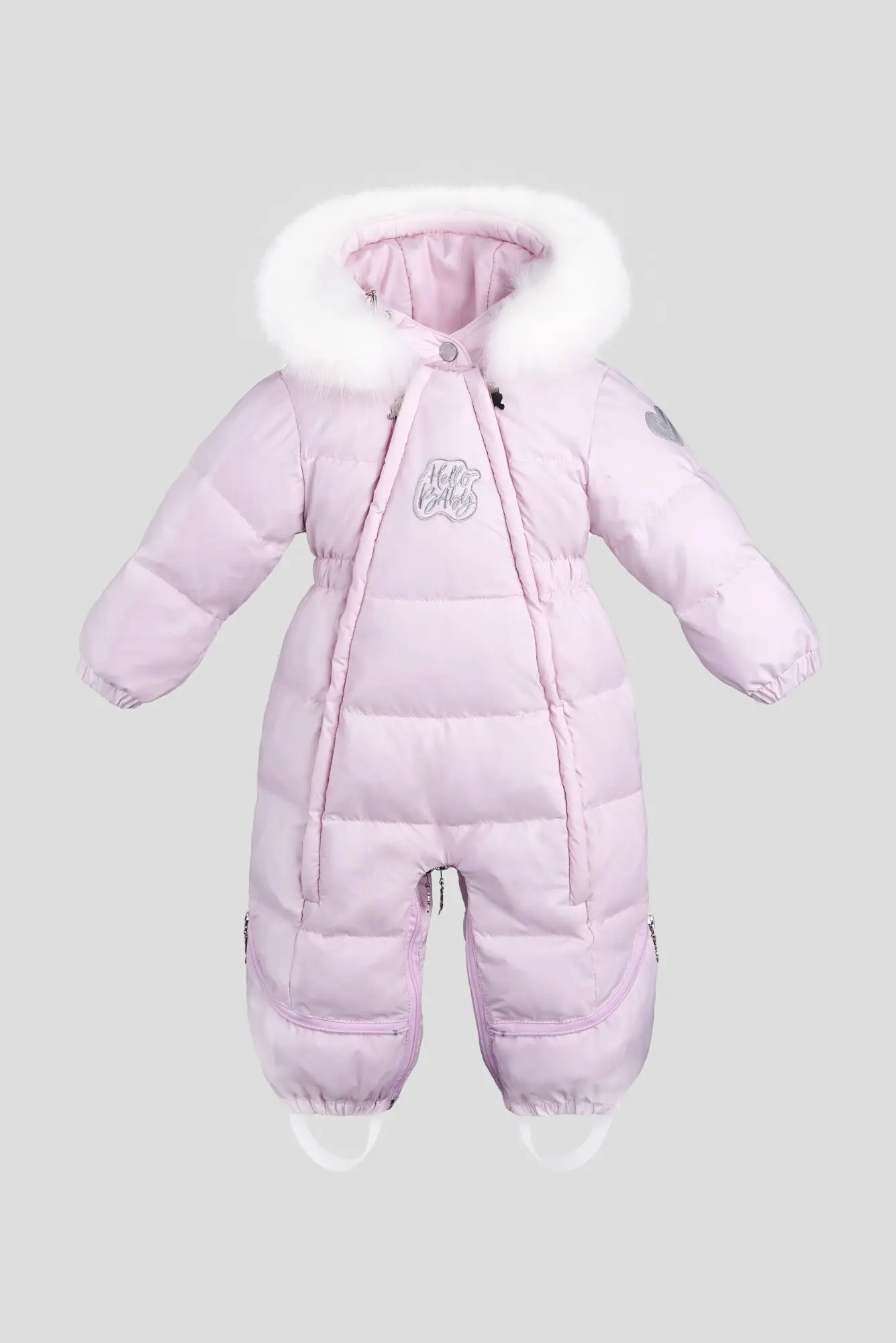 Объемный капюшон с белоснежной меховой опушкой и кулиской у основания горла застегивается на кнопку. Спереди комбинезон украшает вышивка с надписью «Hello Baby».